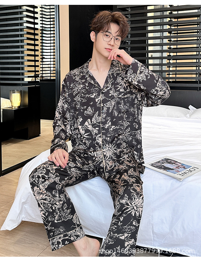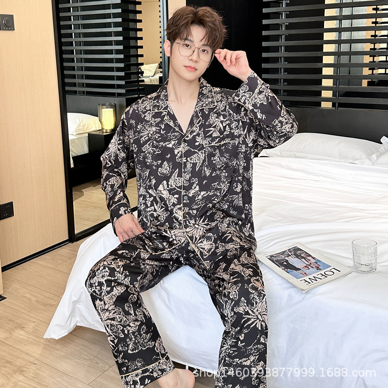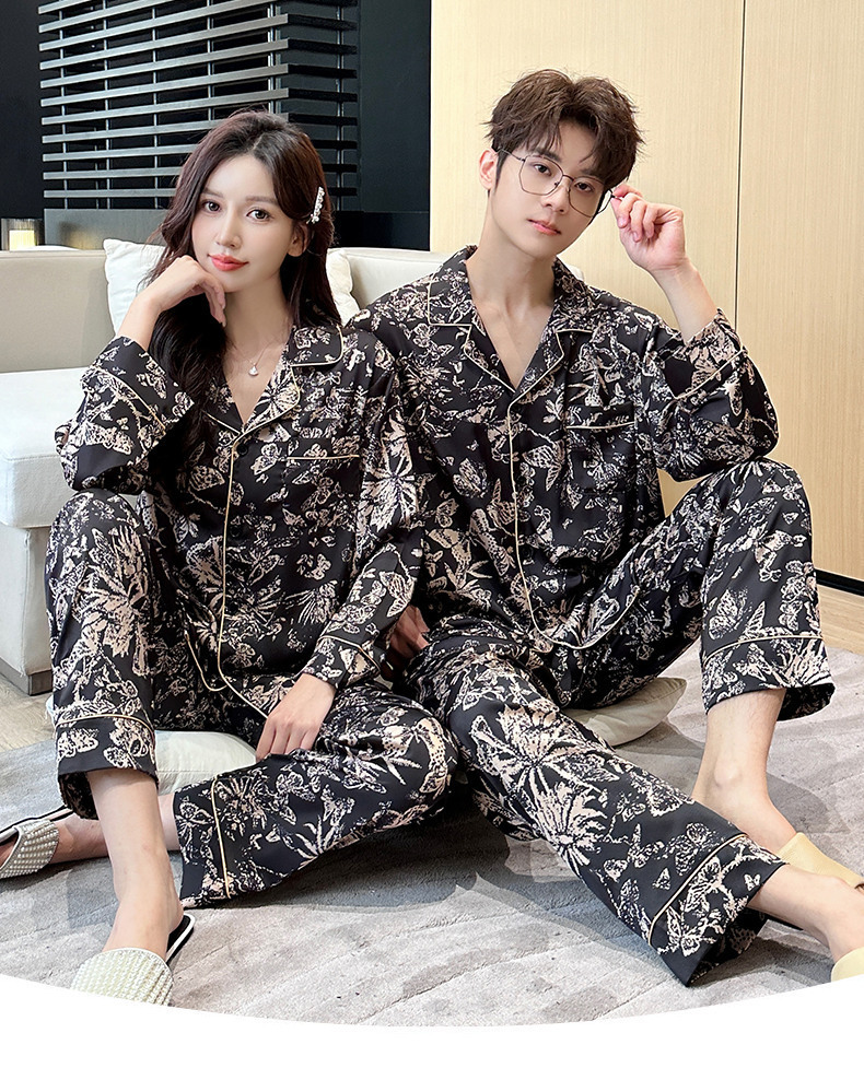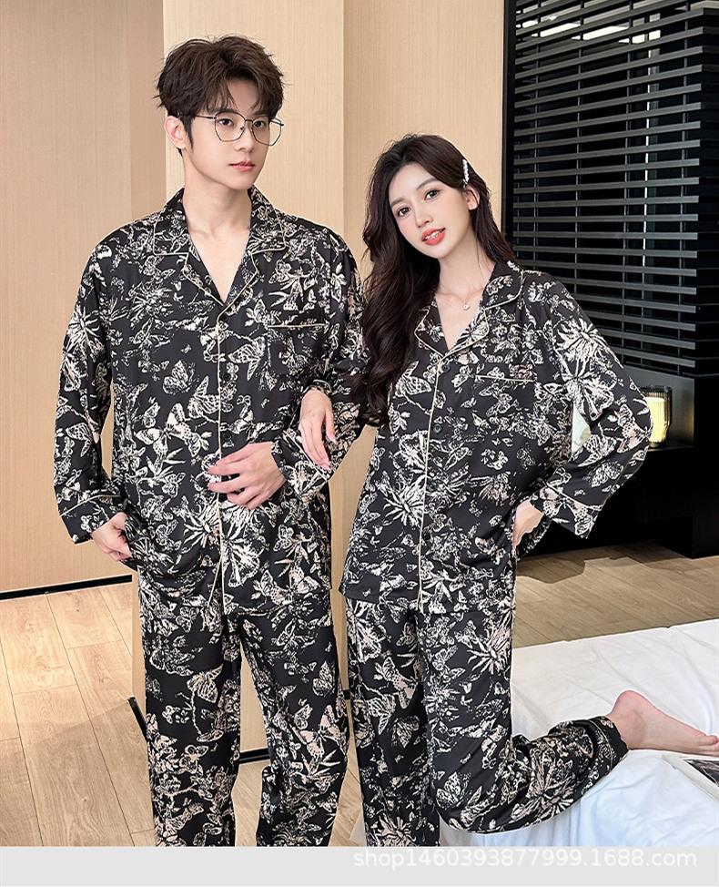 24 개의 새로운 아이스 실크 커플 인쇄 잠옷 패션 얇은 긴 소매 남성 홈 의류 세트 여성 머리카락 세대스토어 가기