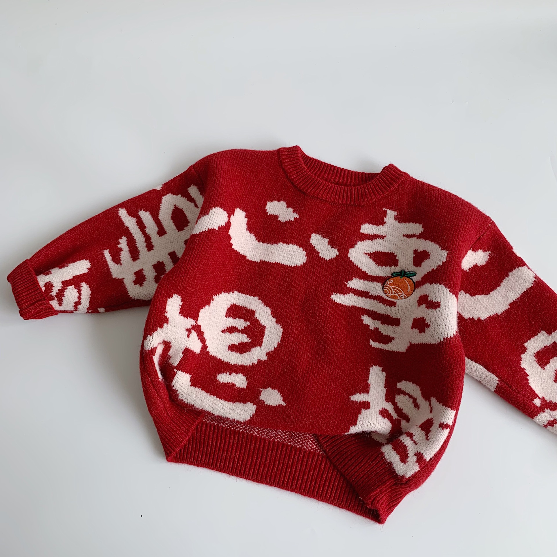 麦宝男童红色毛衣2025冬季新款潮男女童刺绣针织衫宝宝圆领套头衫