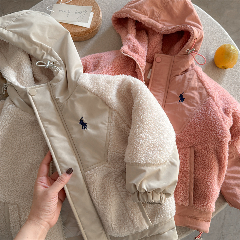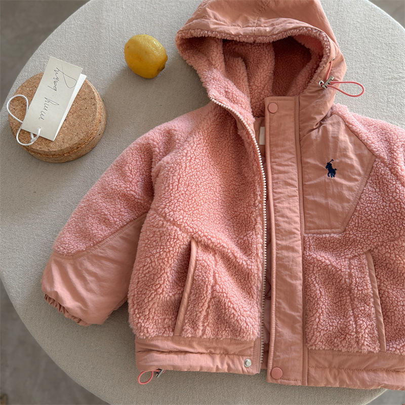 어린이 코튼 재킷 2024 겨울 소년과 소녀 양고기 양모 바느질 후드 코튼 패딩 재킷 소년 아기 트렌디 브랜드 모직 스웨터