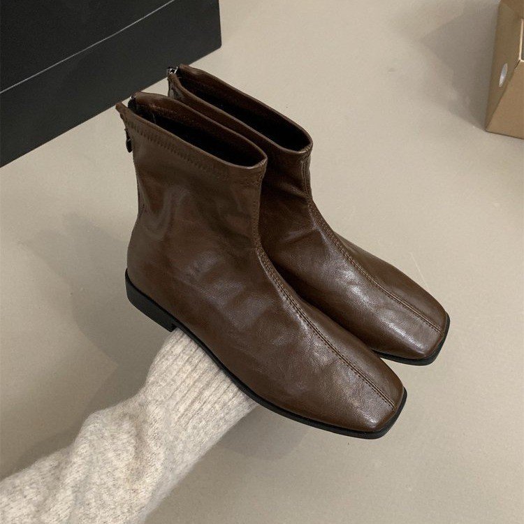 빈티지 스퀘어 헤드 스타일리스트 짧은 부츠 여성 가을 및 겨울 새로운 부드러운 가죽 얇은 부츠 리어 지퍼 짧은 배럴 마틴 부츠 싱글 부츠스토어 가기
