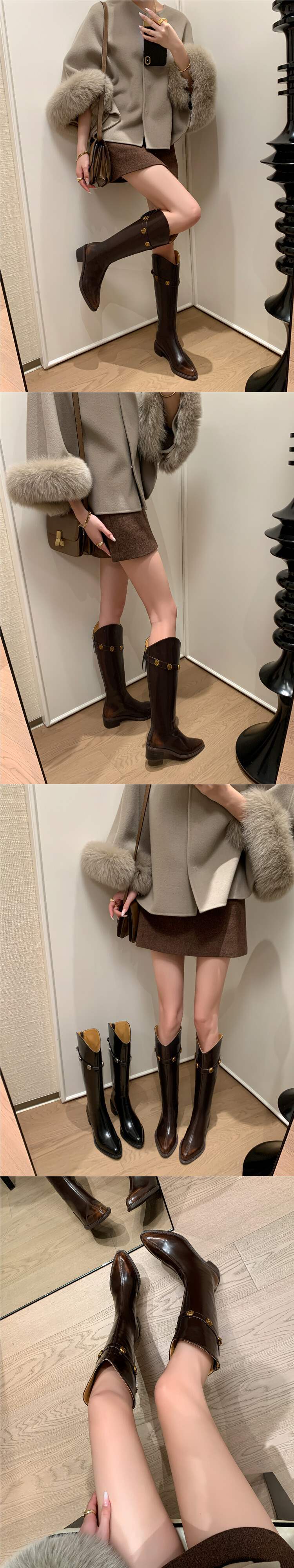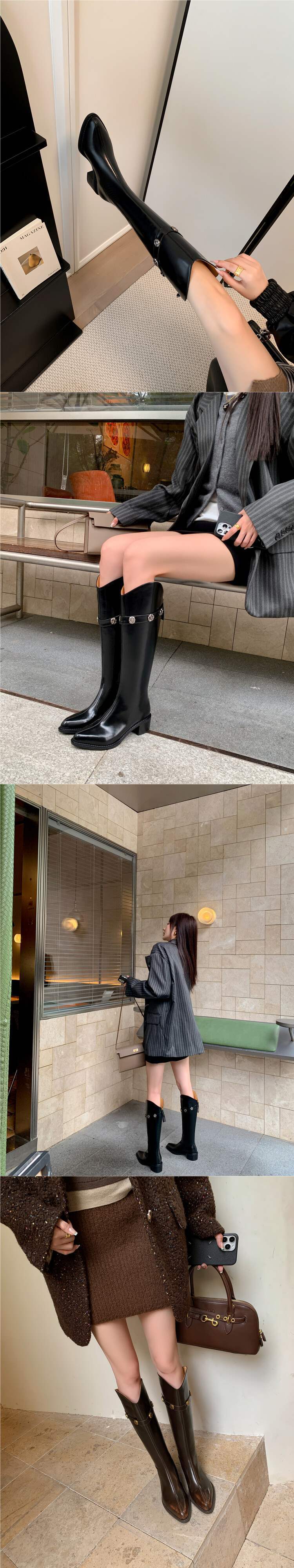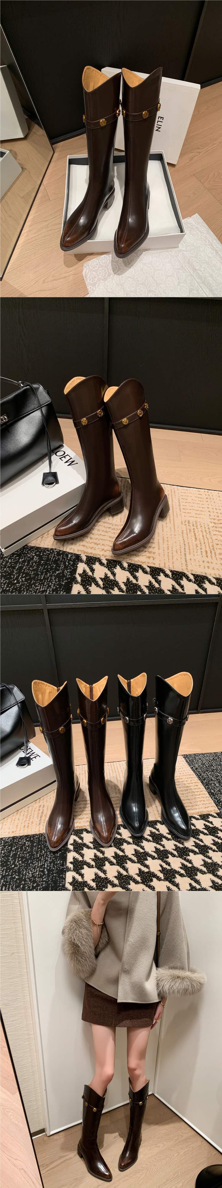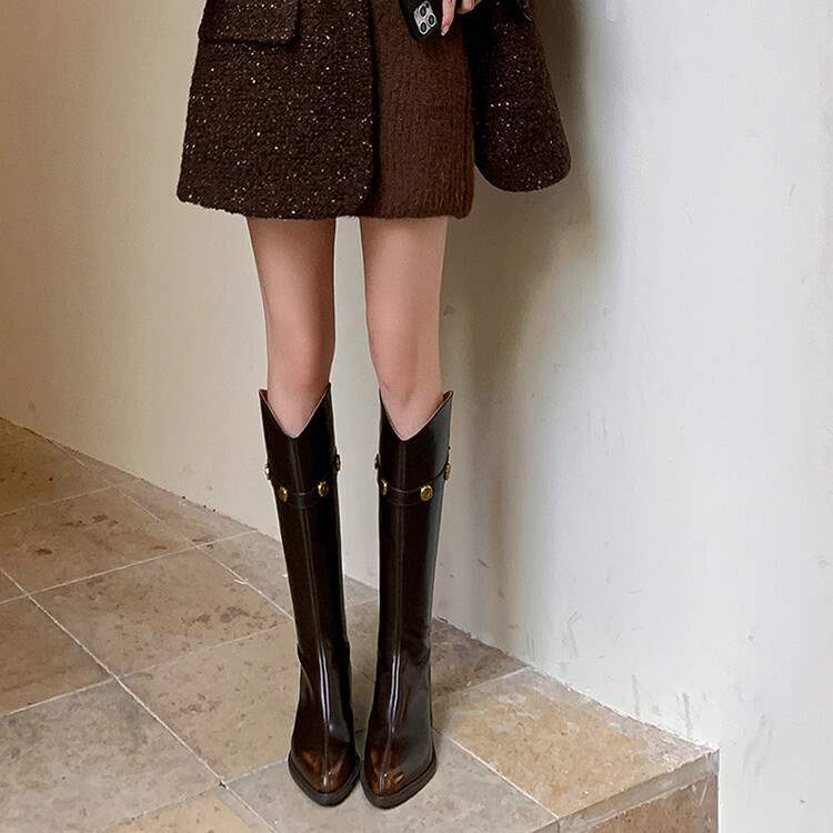 소프트! 여성용 뾰족한 두꺼운 힐 부츠 여성용 무릎 V-무릎 기사 부츠 여성용 가죽 하이힐 부츠 여성용 리벳스토어 가기