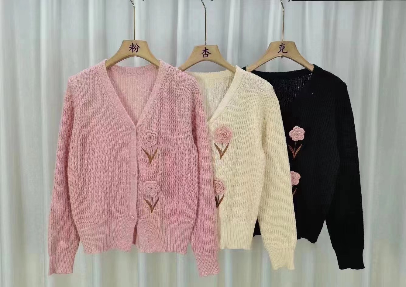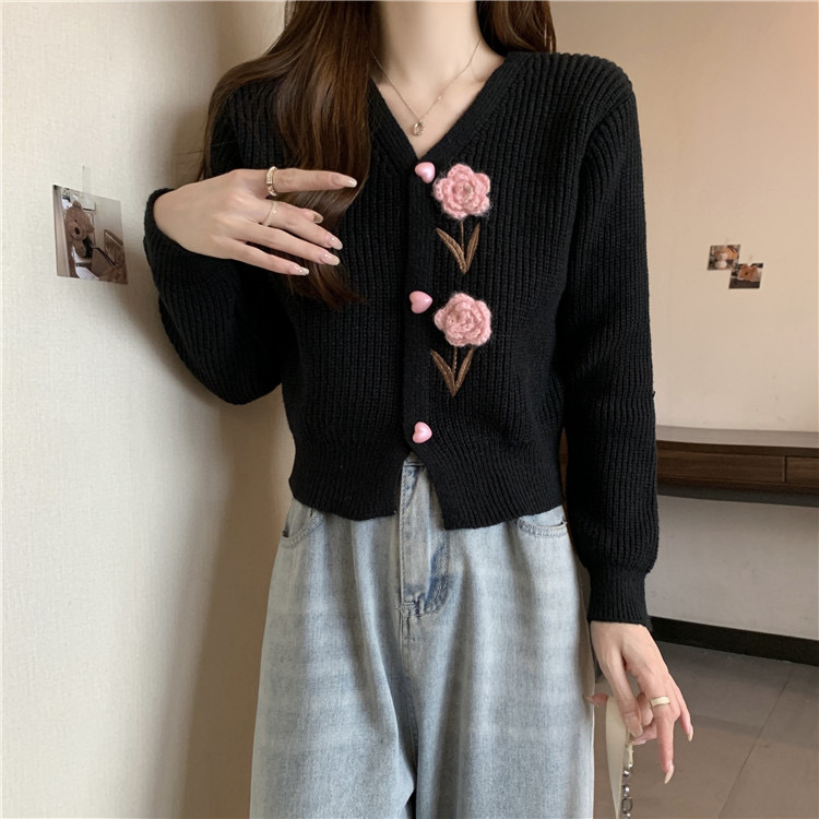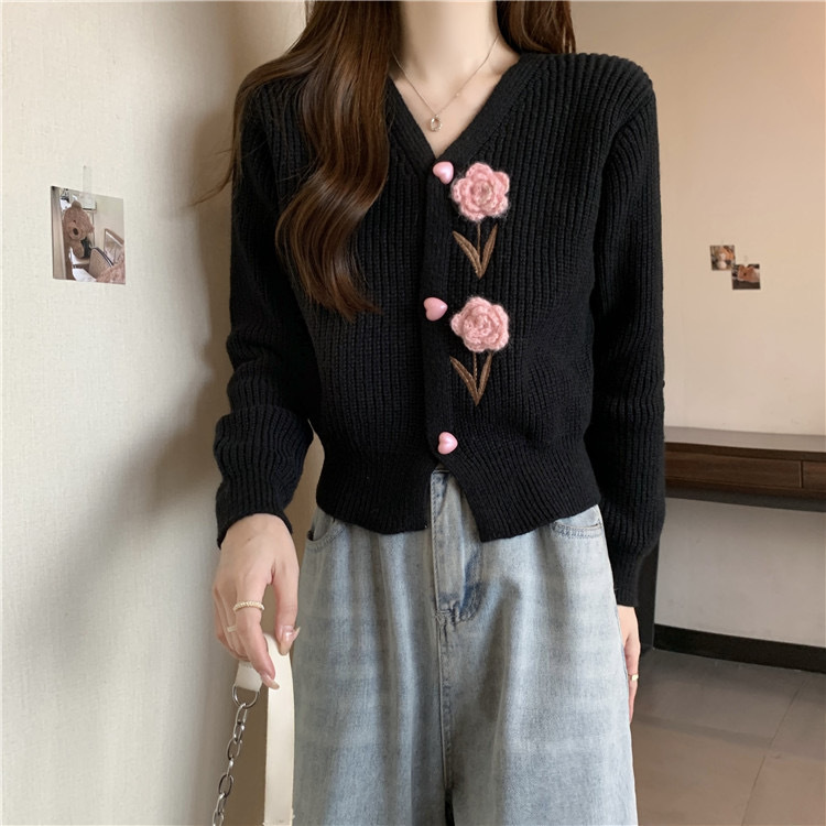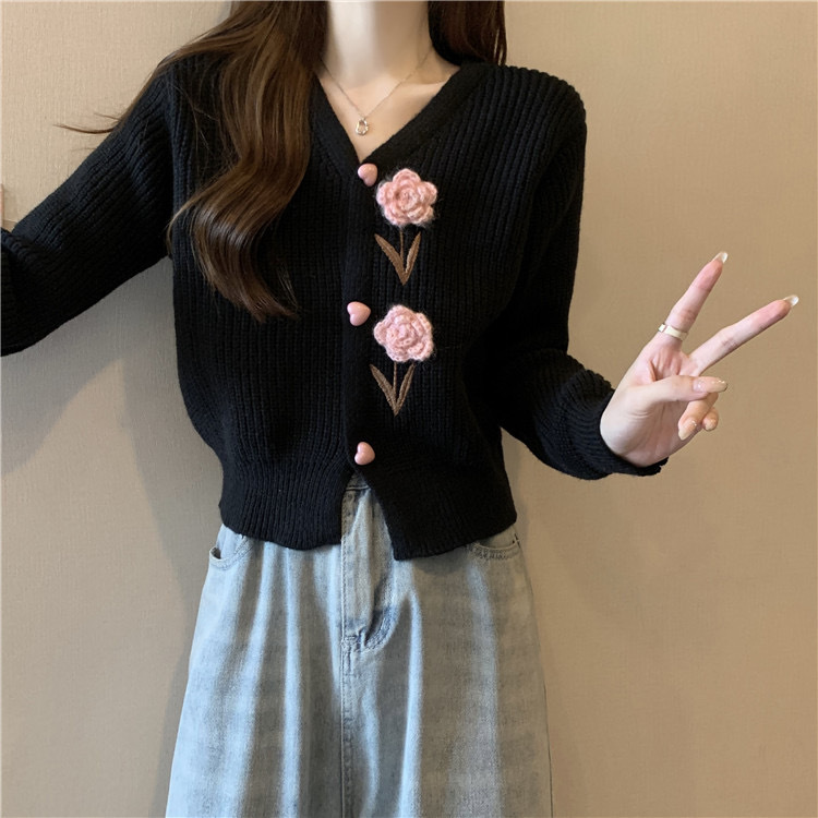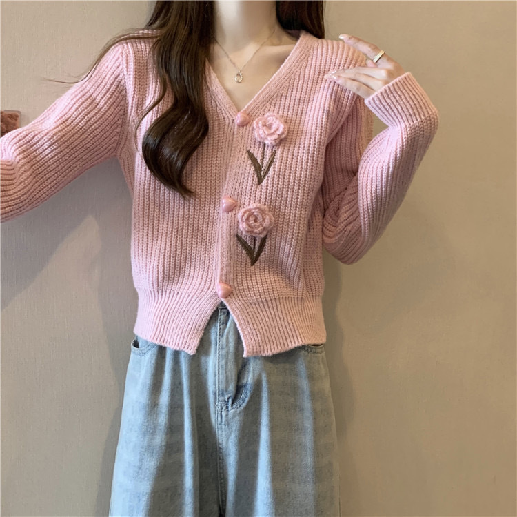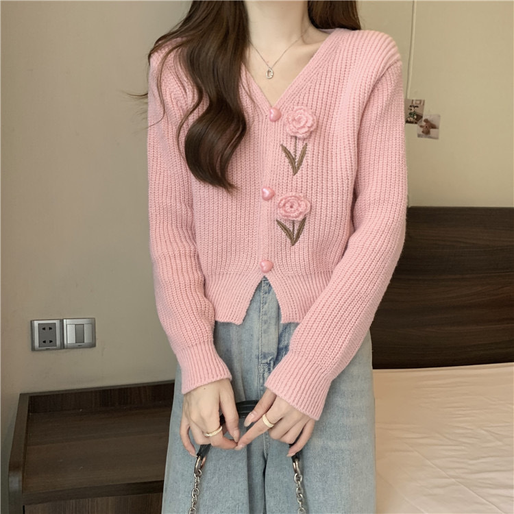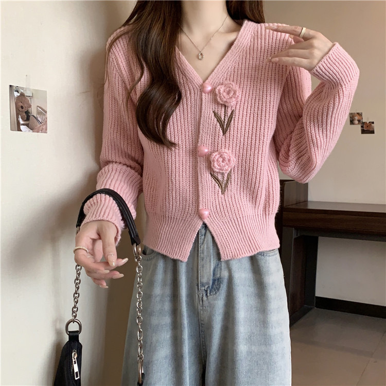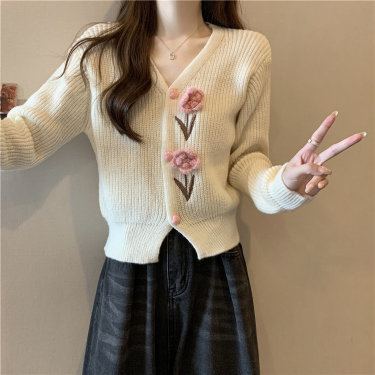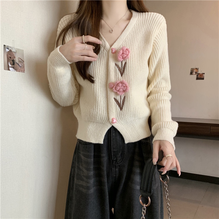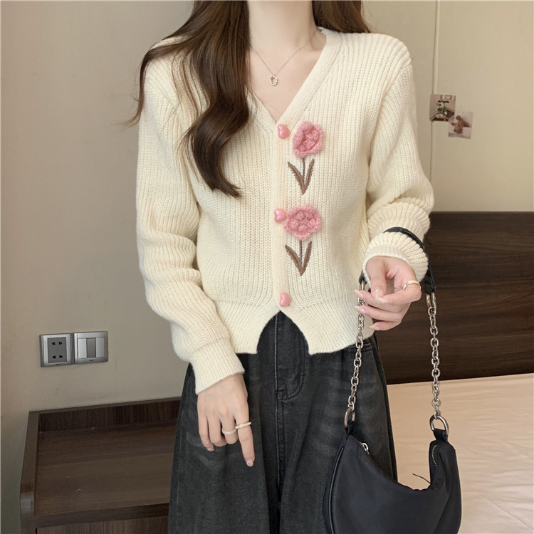 샤넬 스타일 자수 꽃 2024 새로운 스타일 외부 착용 느슨한 플러스 사이즈 디자인 감각 V-Neck 짧은 니트 카디건 탑