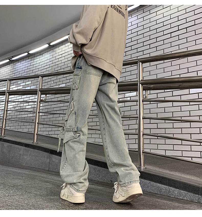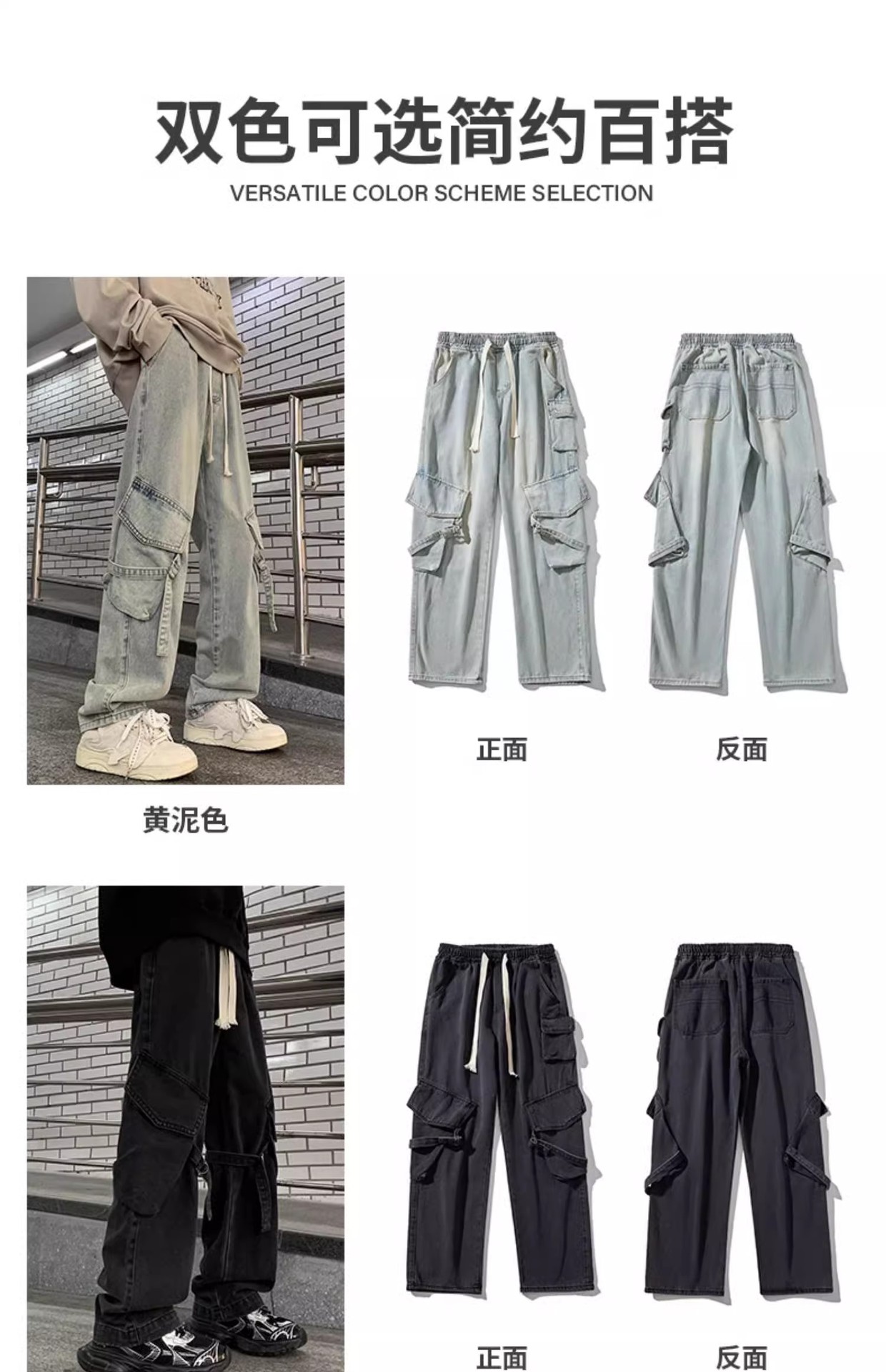 아메리칸 스타일 하이 스트리트 멀티 포켓 툴링 청바지 남자 봄 가을과 겨울 느슨한 넓은 다리 소년 캐주얼 트렌디 브랜드 바지