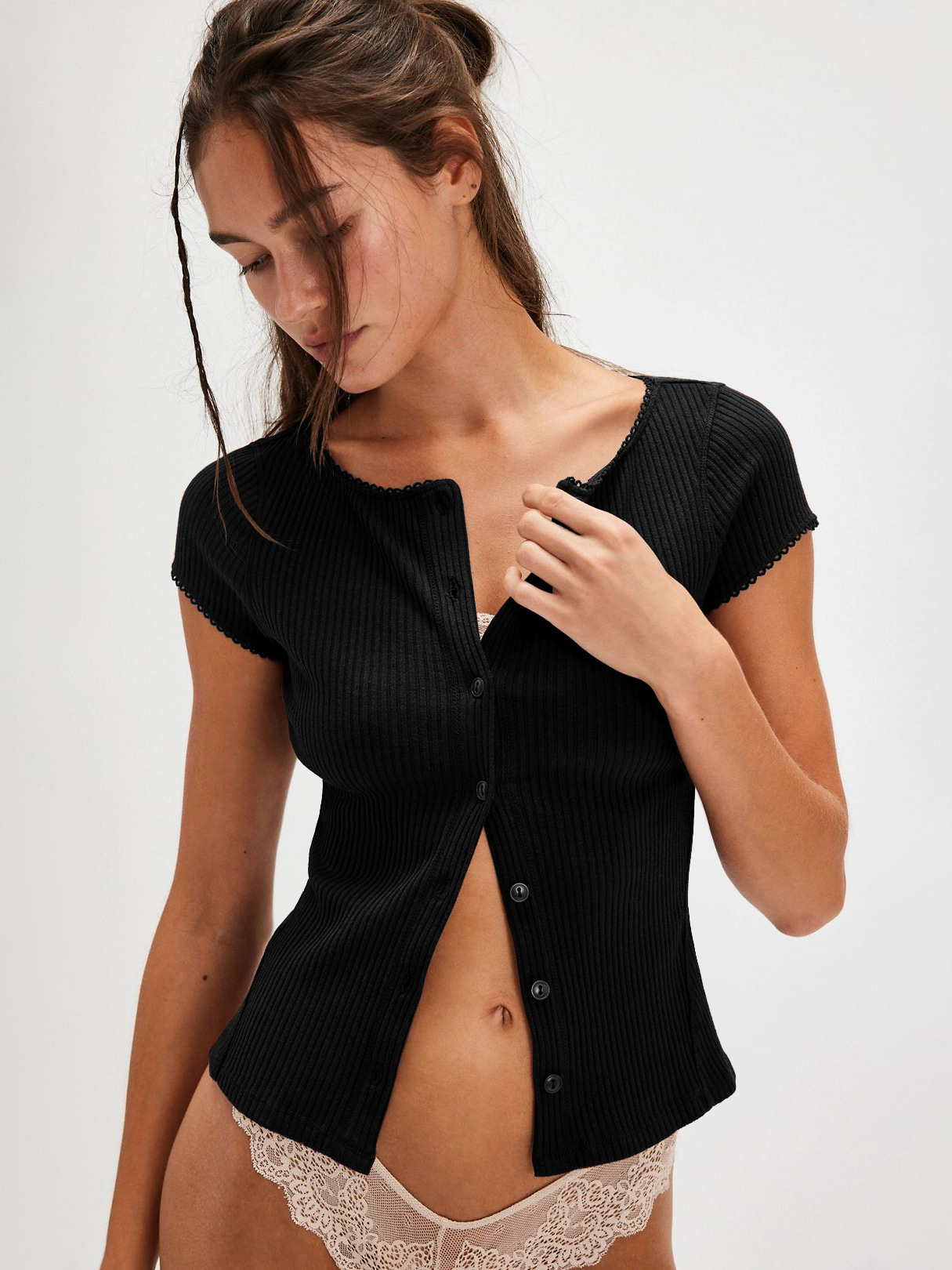 유럽과 미국 스타일 2025 여름 새로운 섹시한 뜨거운 소녀 버튼 짧은 소매 스레드 카디건 최고 패션 단색 티셔츠 여성