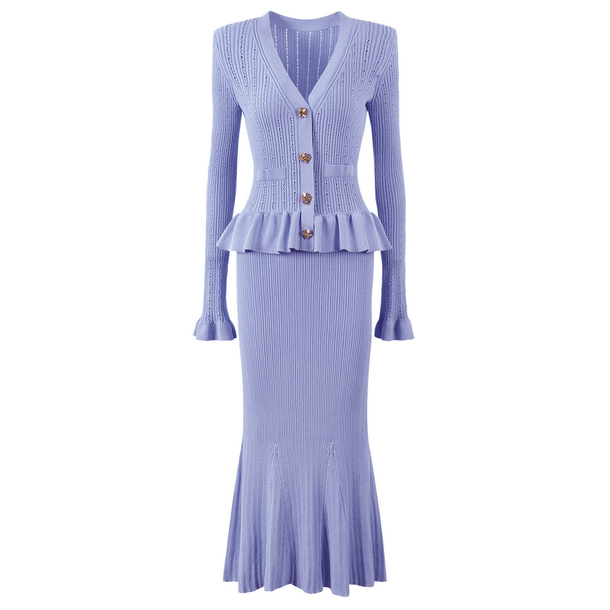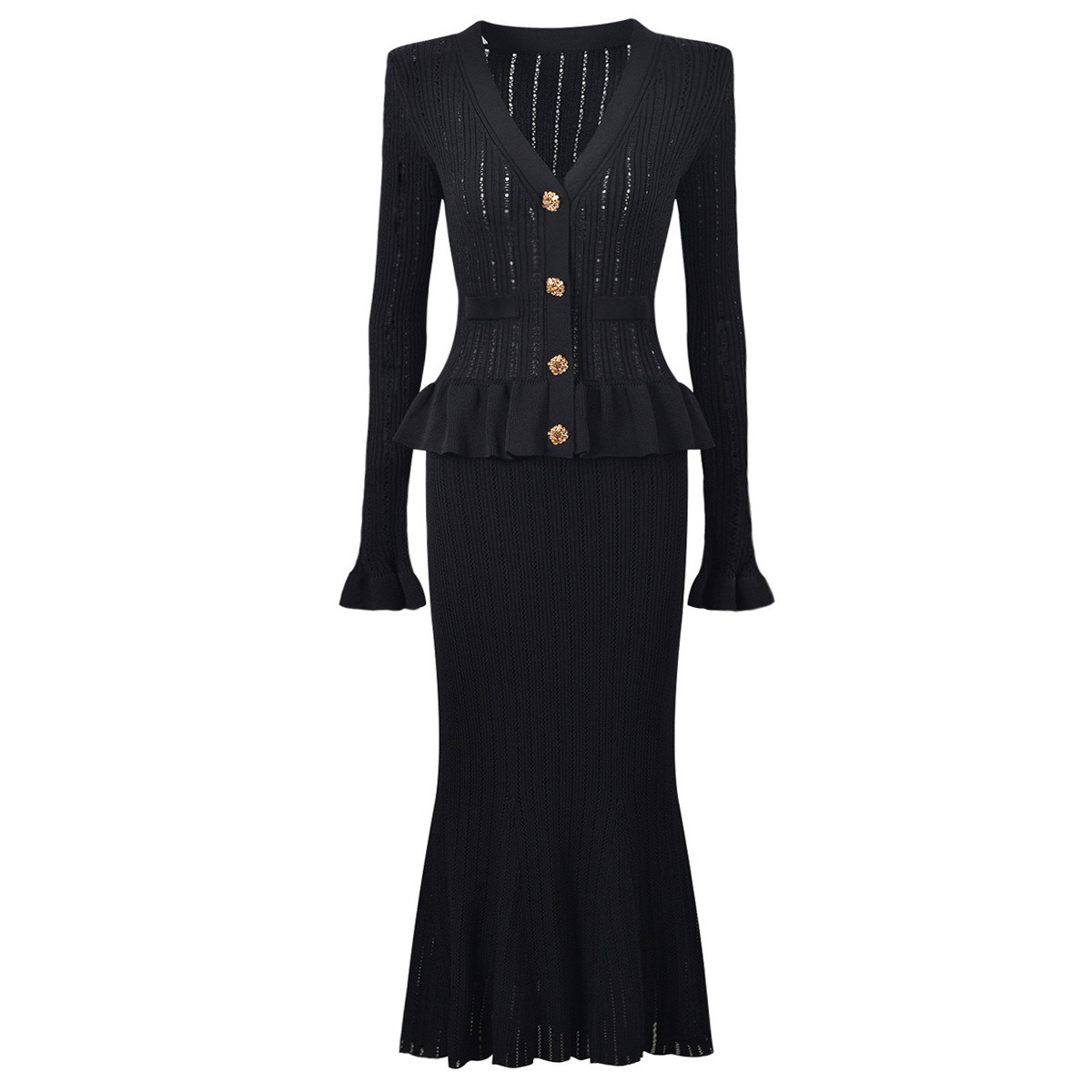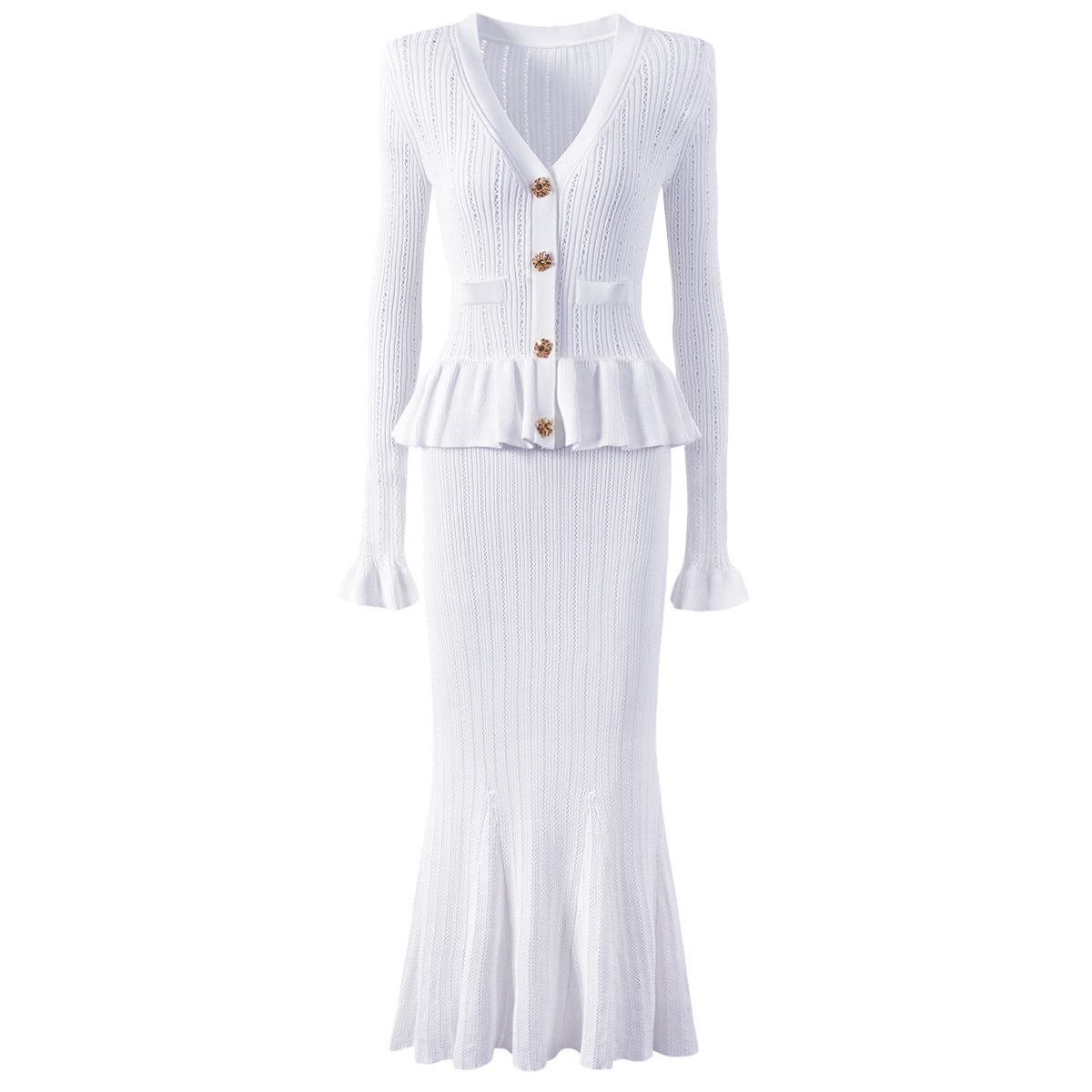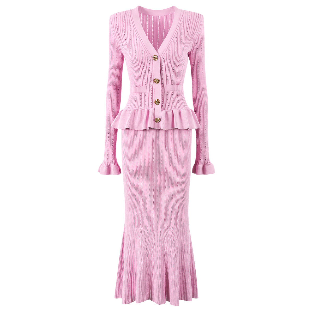 하이 퀄리티 재고 2025 유럽과 미국의 봄과 가을 새로운 패션 니트 V-Neck 슬림핏 슬리밍 긴팔 원피스 여성