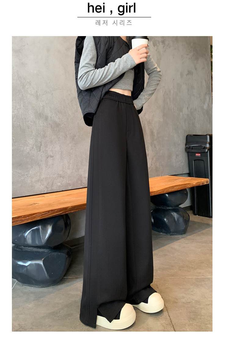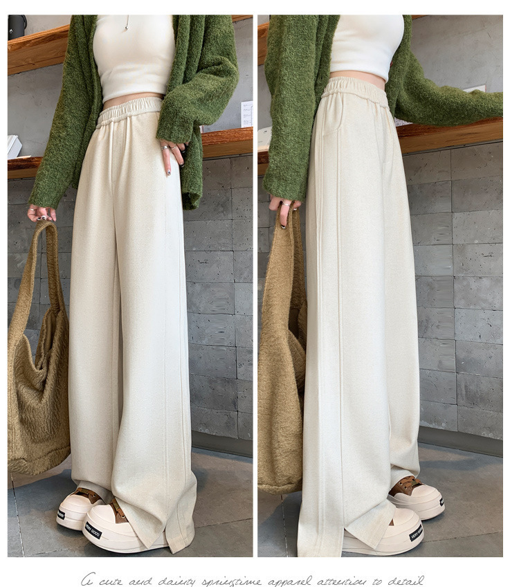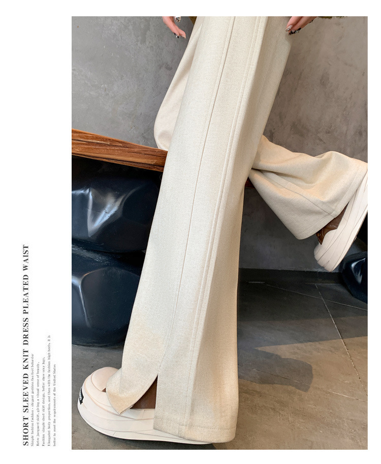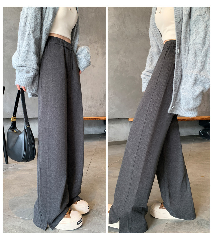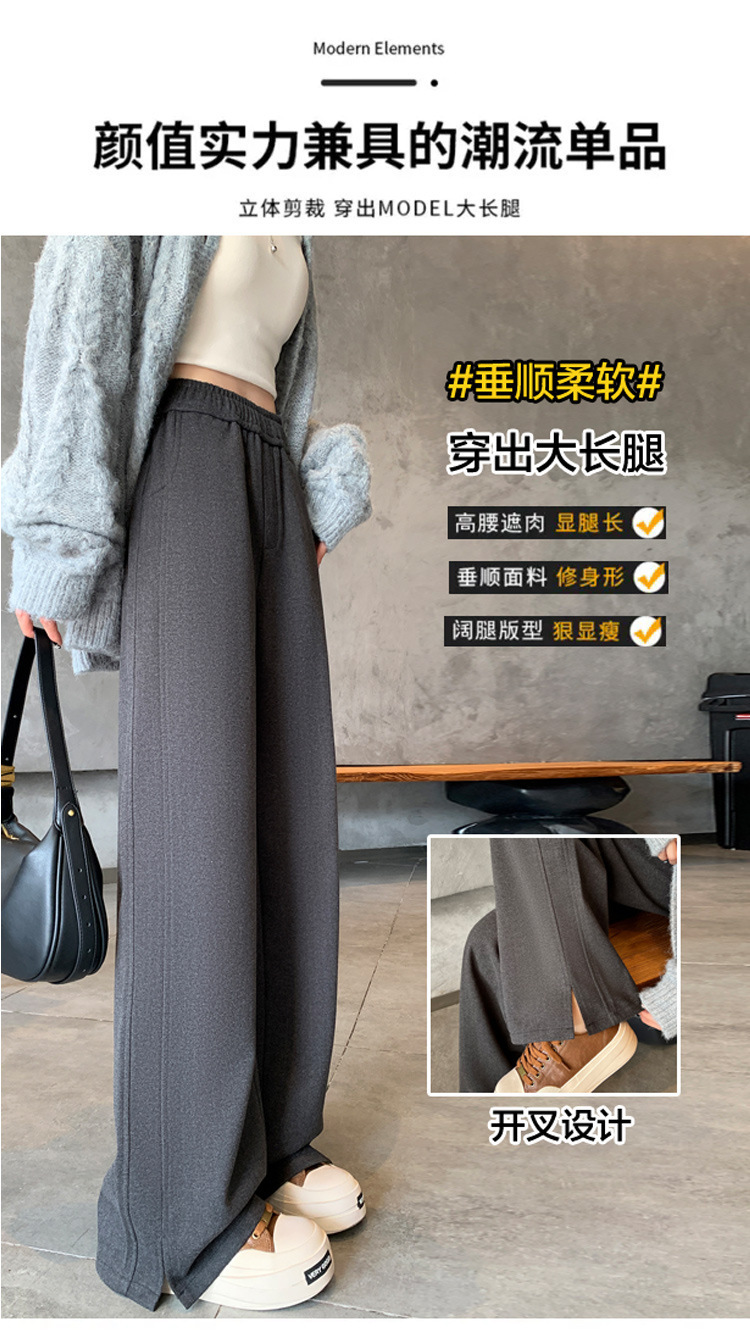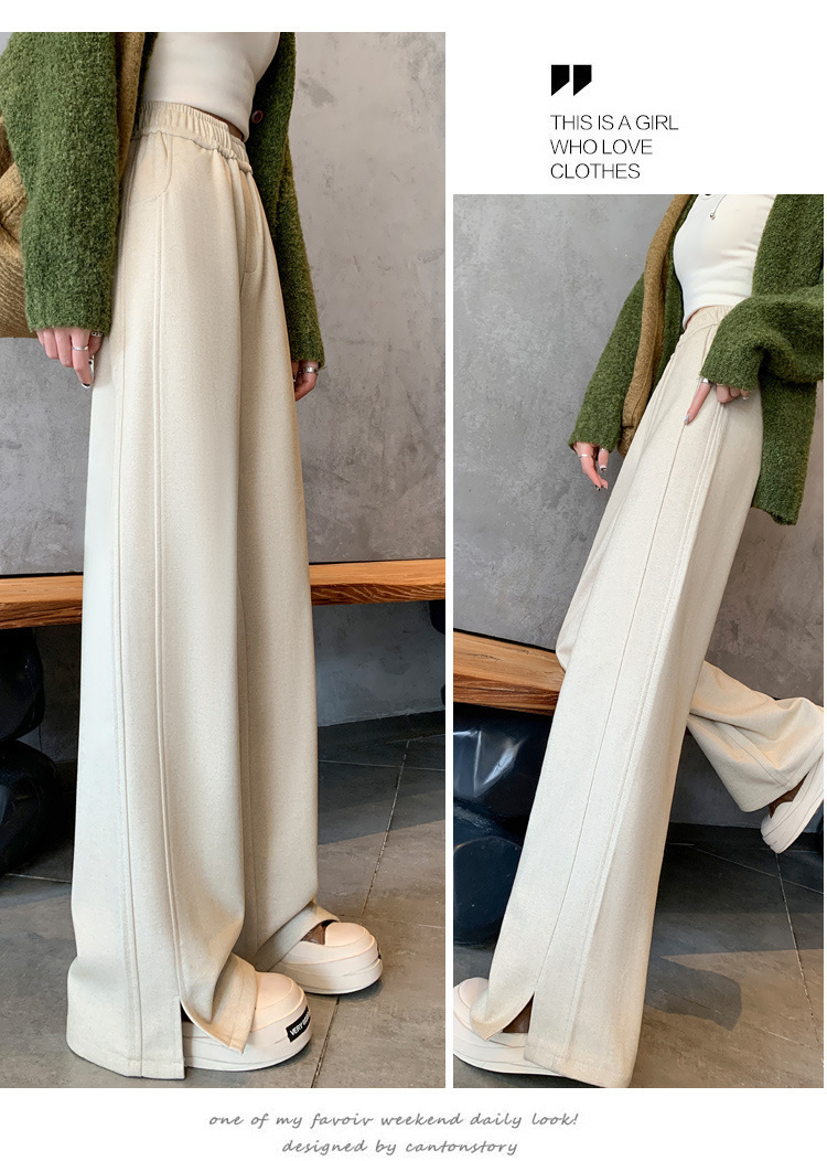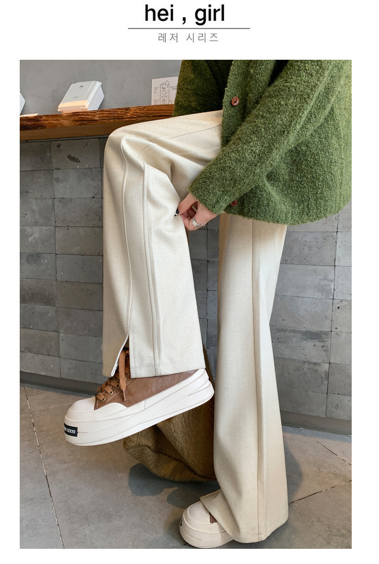 헤링본 패턴 기모 울 넓은 다리 바지 여성의 가을과 겨울 2024 새로운 높은 허리 슬리밍 좁은 스트레이트 튜브 스플릿 캐주얼 바지