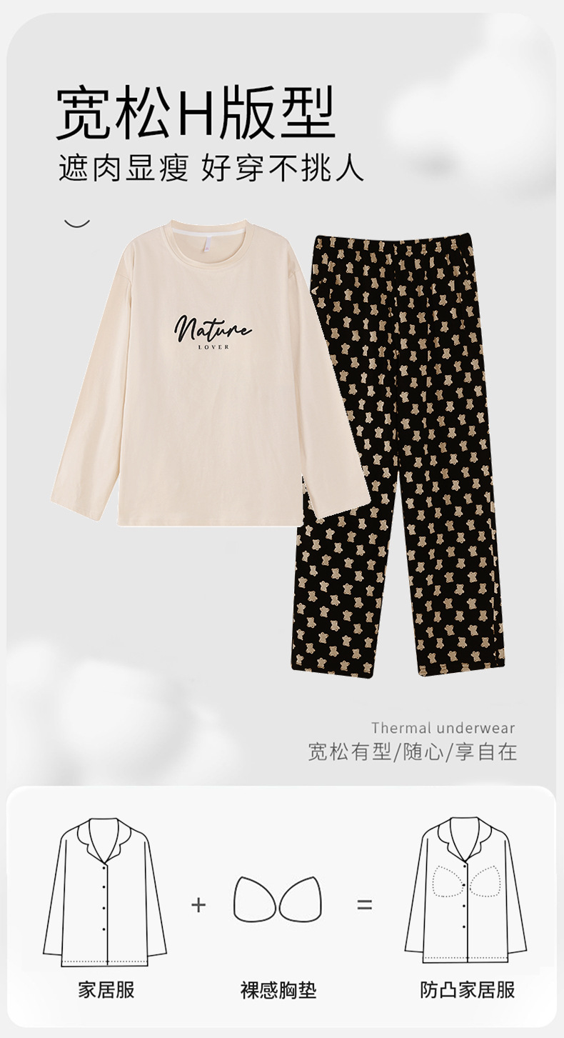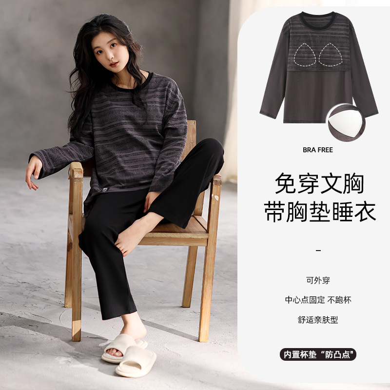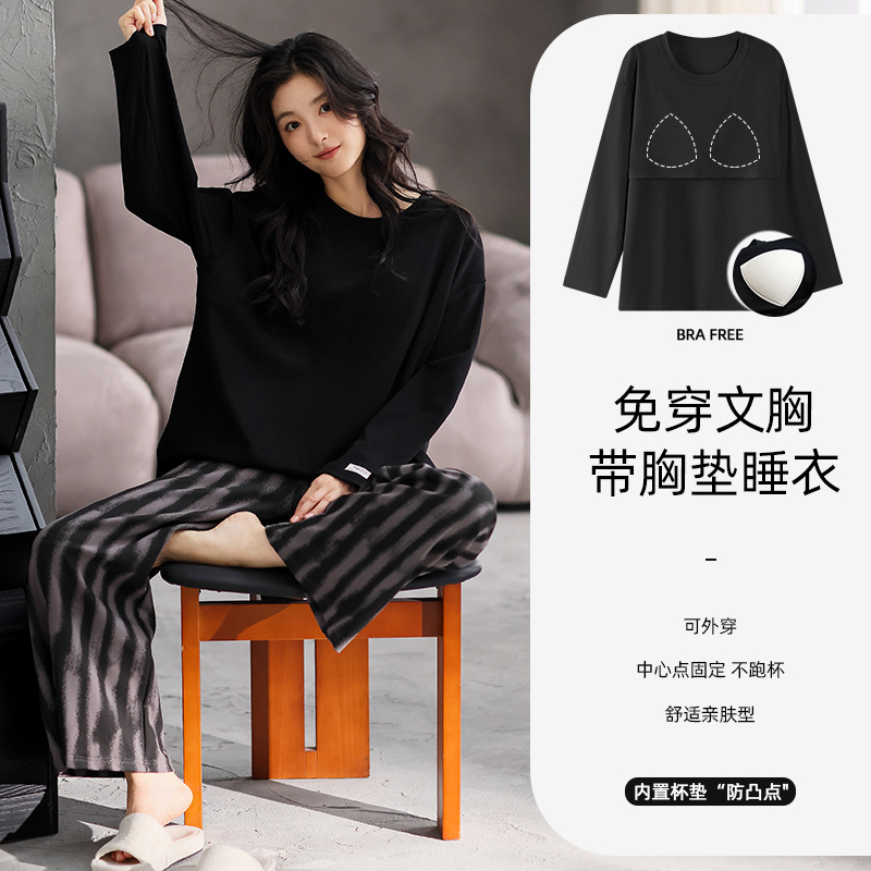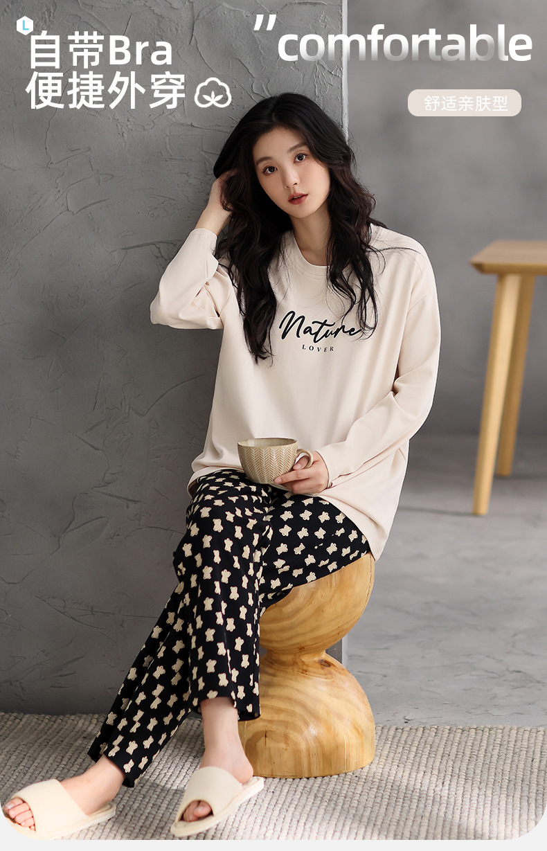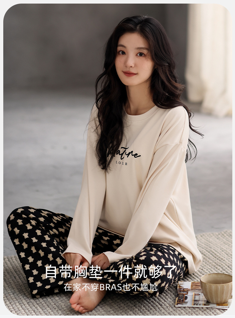 여성용 잠옷 봄 가을 순면 긴팔 라운드넥 풀오버 심플 패션 2025 신상 가슴 패드 포함 홈웨어 투피스 세트스토어 가기