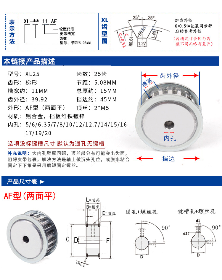 양면 평면 AF 유형 동기 휠 XL25 치아 동기 풀리 내부 구멍 6-20mm 치아 표면 상단 와이어 홈 너비 11mm