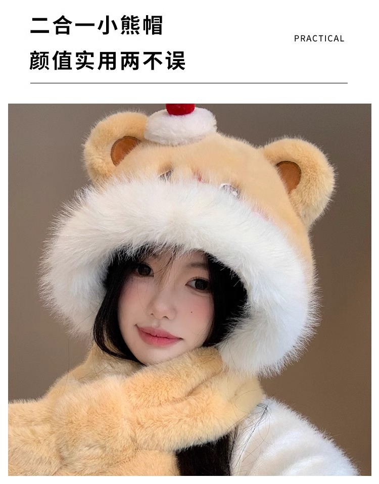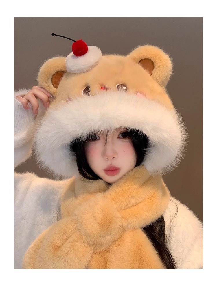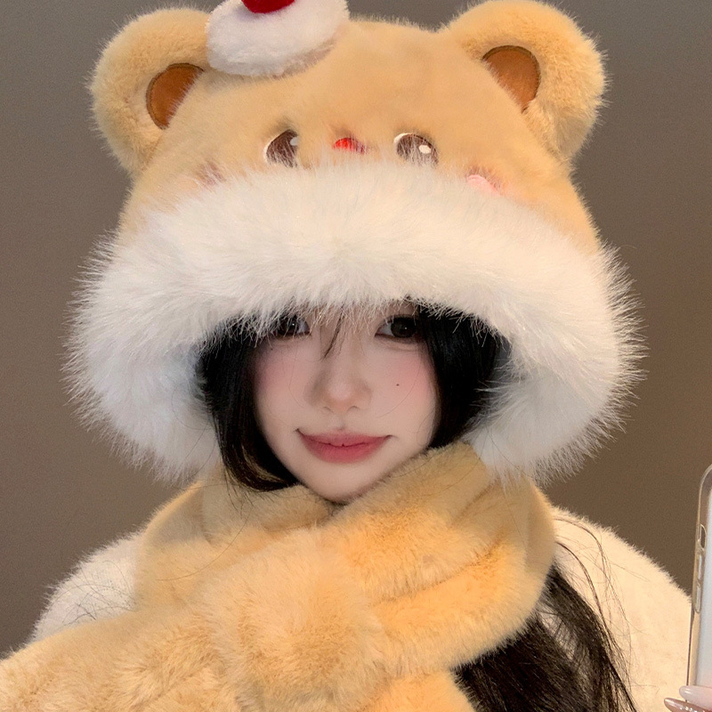 귀여운 케이크 곰 봉제 여성 2024 겨울 모자 스카프 원피스 얼굴 작은 따뜻한 귀 보호 레이 펑 모자
