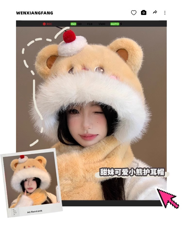 귀여운 케이크 곰 봉제 여성 2024 겨울 모자 스카프 원피스 얼굴 작은 따뜻한 귀 보호 레이 펑 모자스토어 가기