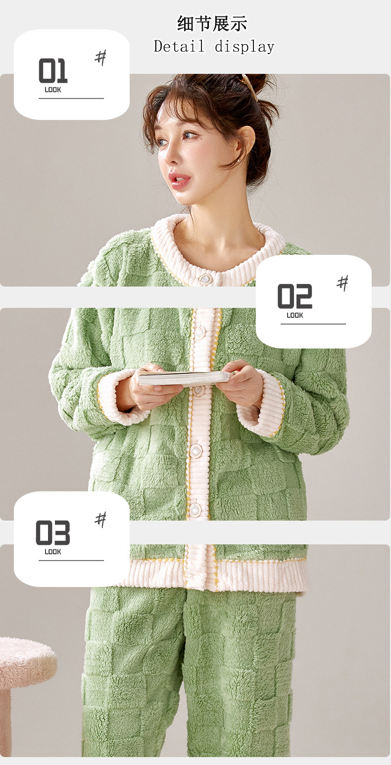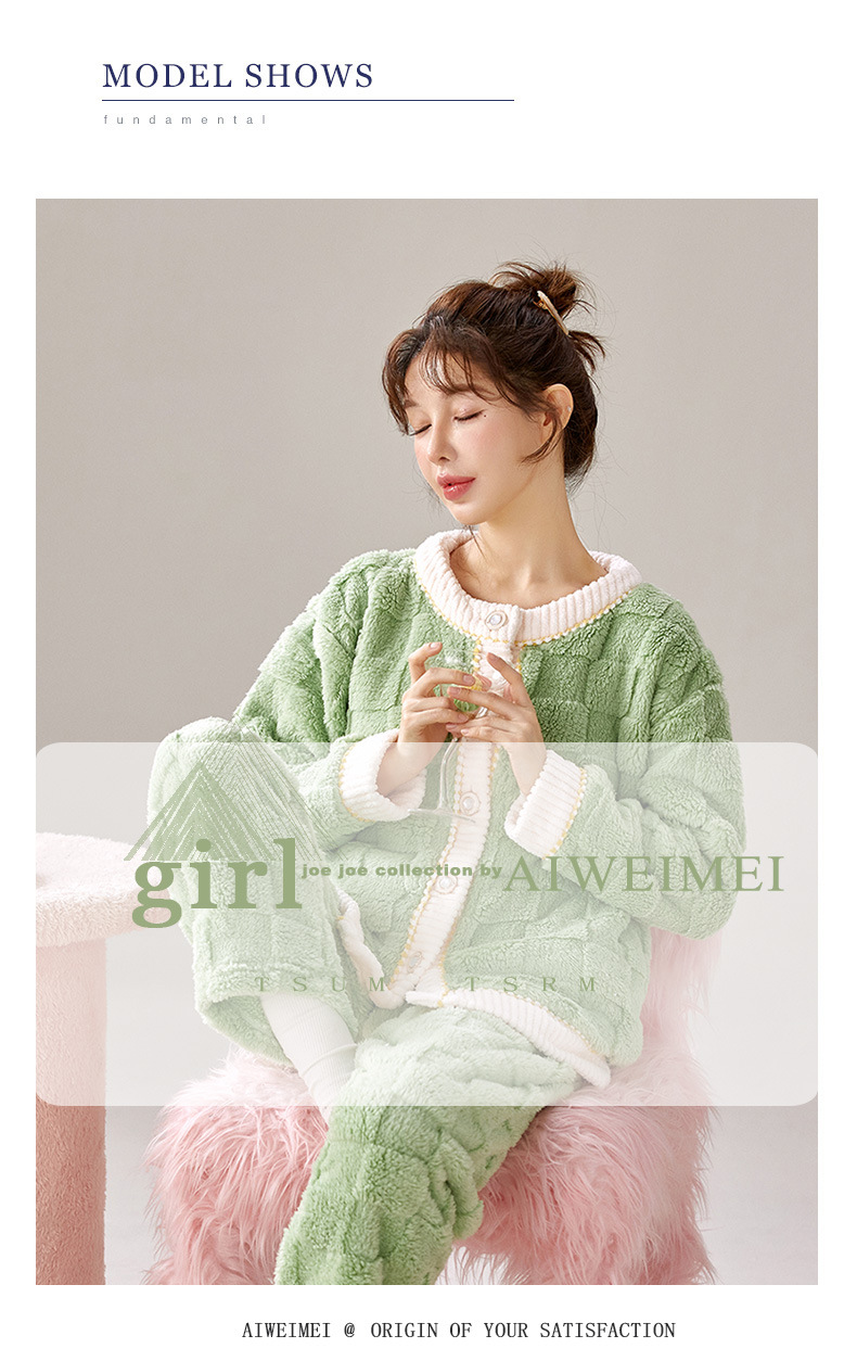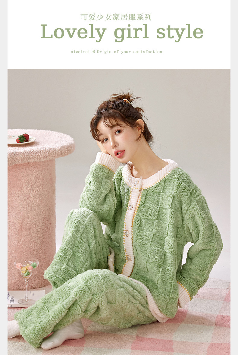 두꺼운 기모 산호 양털 옷깃 파자마 여성용 카디건 달콤한 귀여운 플란넬 세트 홈 느슨한 겨울 아우터웨어