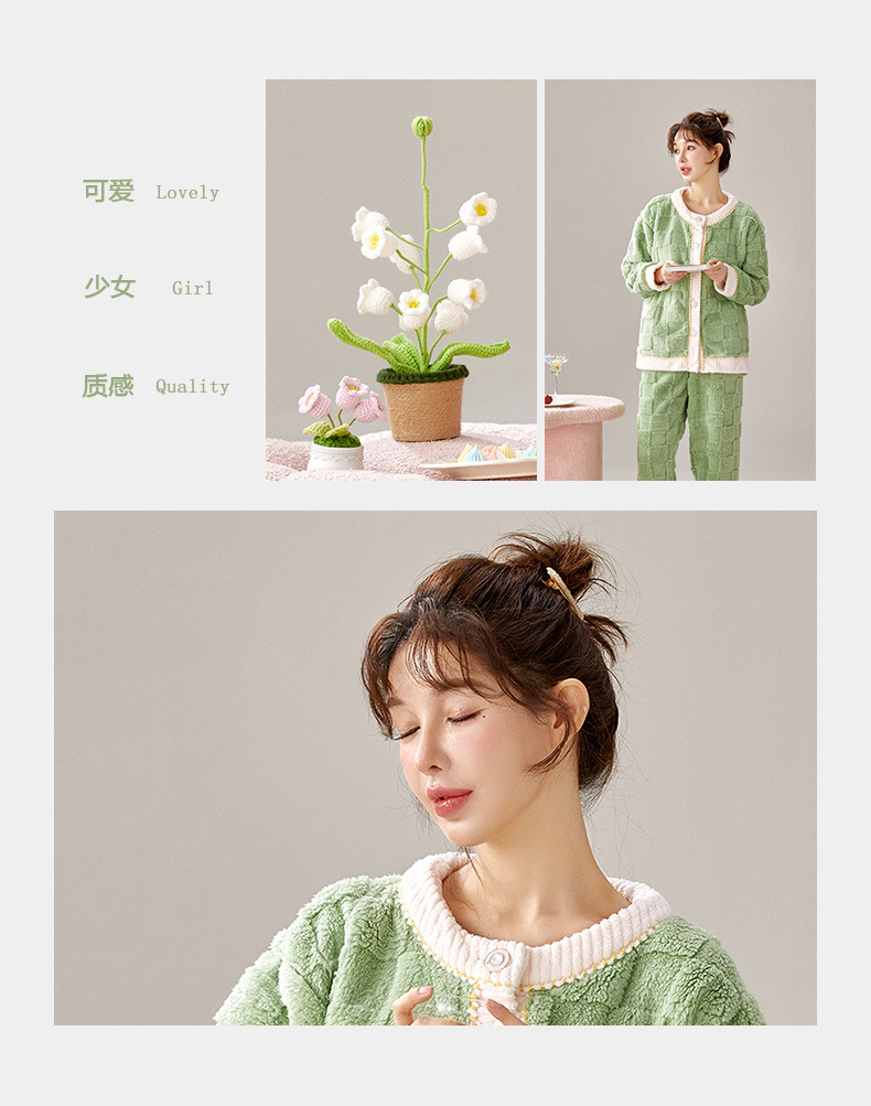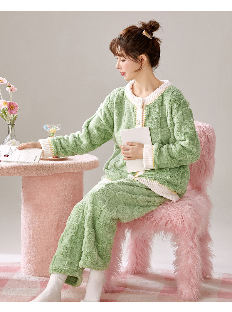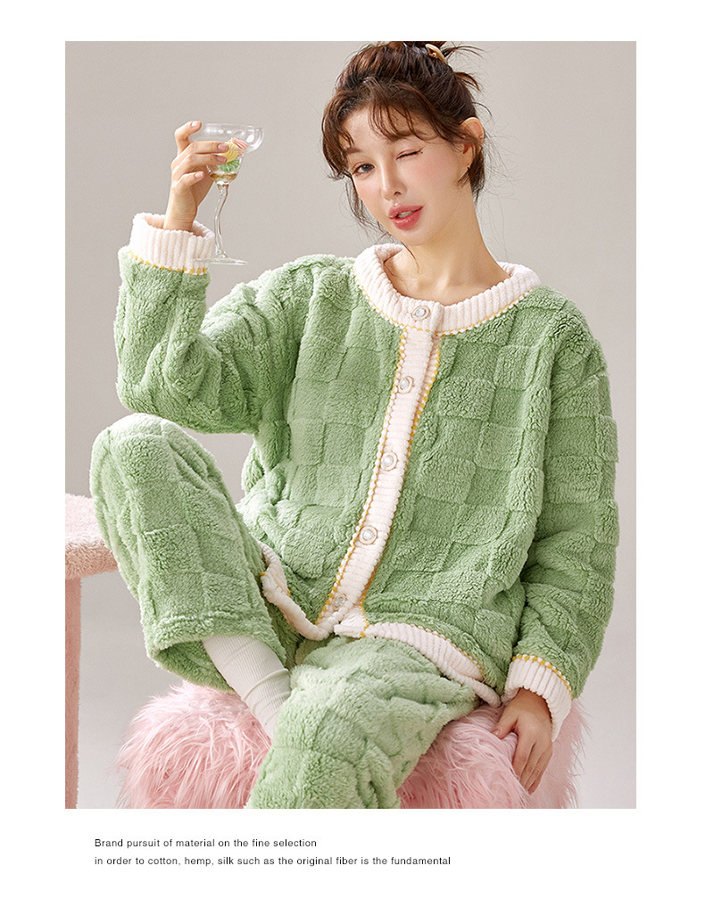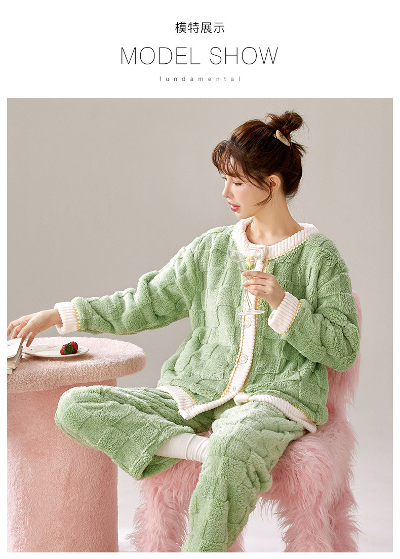 두꺼운 기모 산호 양털 옷깃 파자마 여성용 카디건 달콤한 귀여운 플란넬 세트 홈 느슨한 겨울 아우터웨어