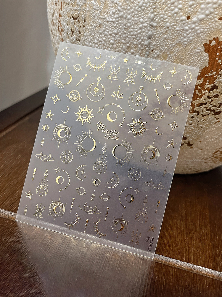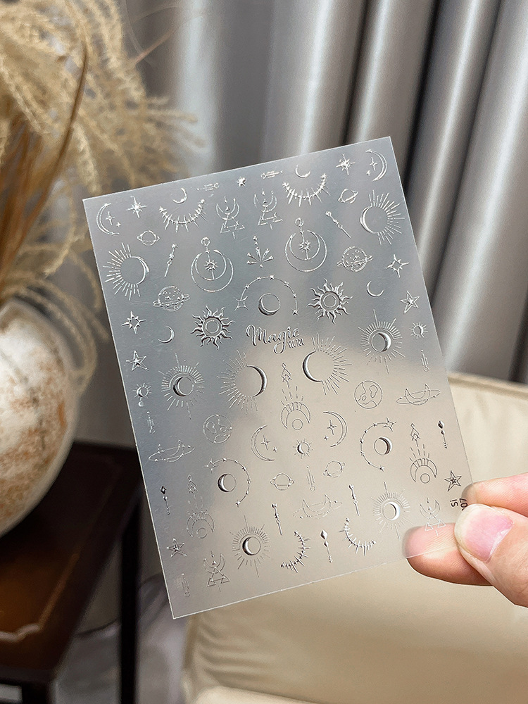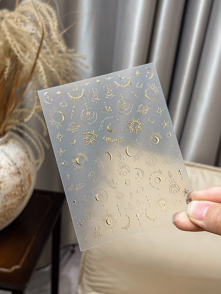핫 골드 실버 초승달 네일 아트 스티커 태양 절묘한 중공 라인 행성 접착제 네일 장식 도매