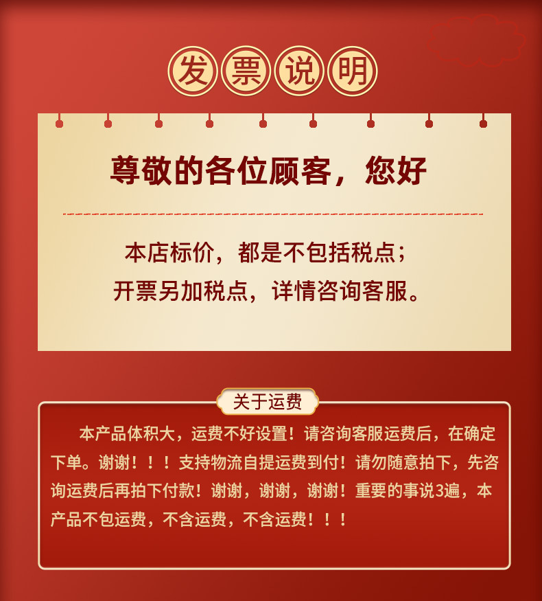 2、本店发货默认普通货运,运费到付,如需快递请联系客服计算修改运费备注。如由于买家信息填写错误,如电话 地址造成的货物退回需要客户承担来回运费。