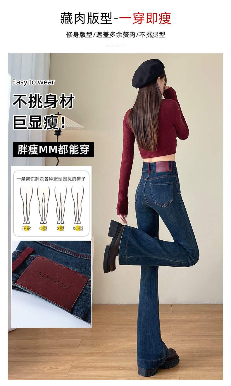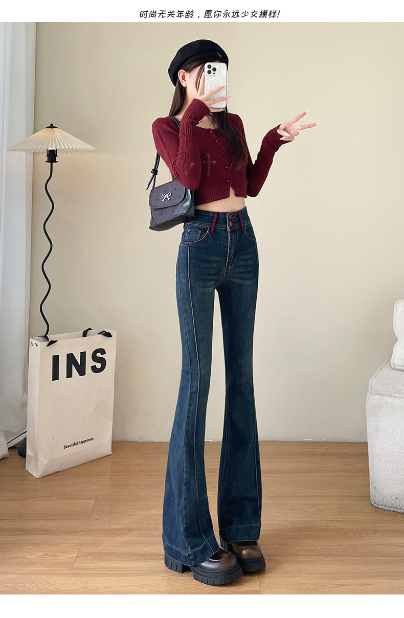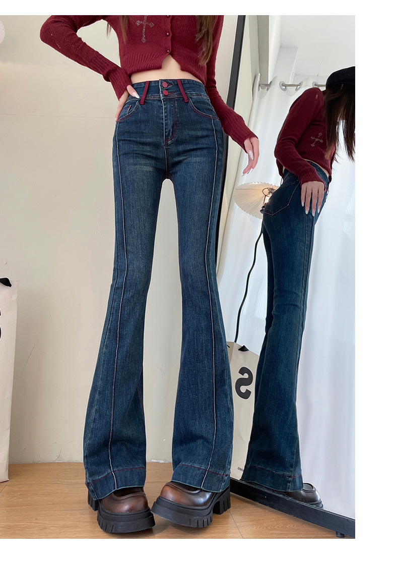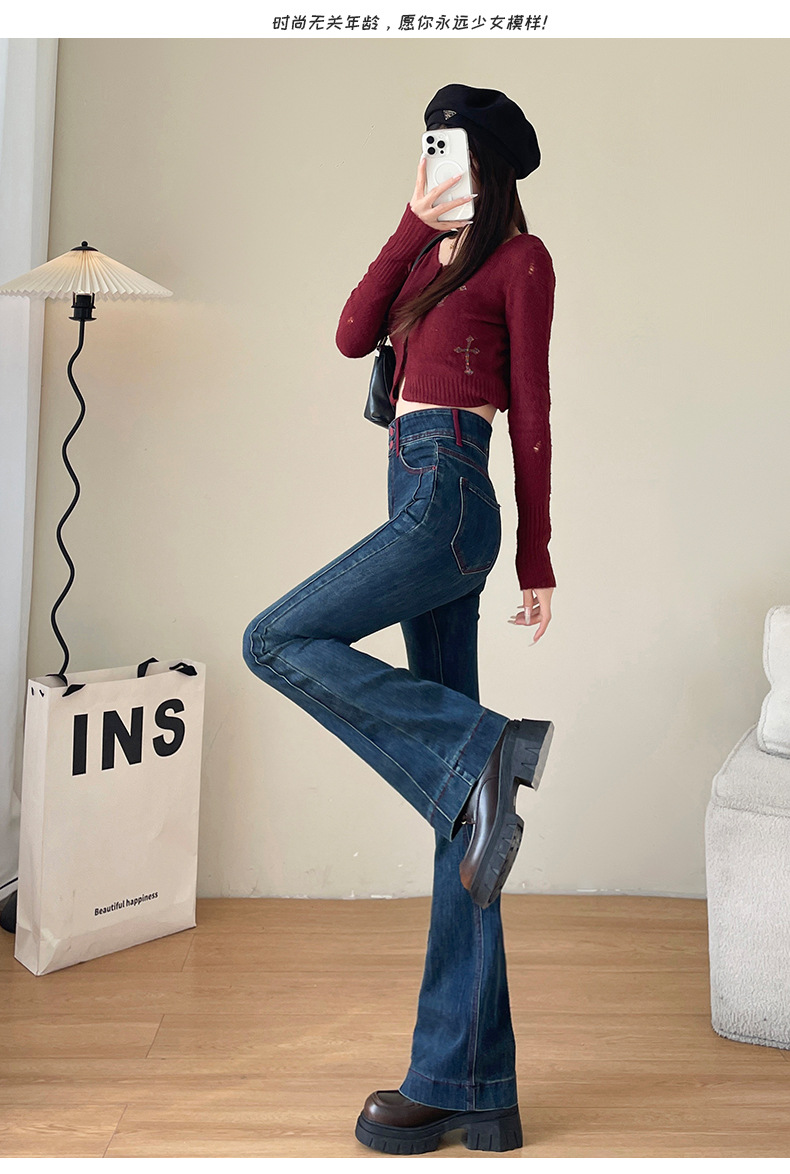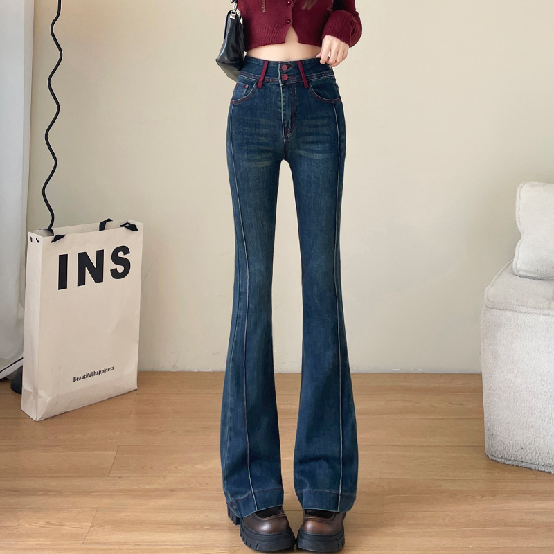 뜨거운 소녀 높은 허리 파 바지 청바지 여성 기모 바지 가을과 겨울 대비 색상 틈새 슬림-적합 새로운 스타일 스트레치
