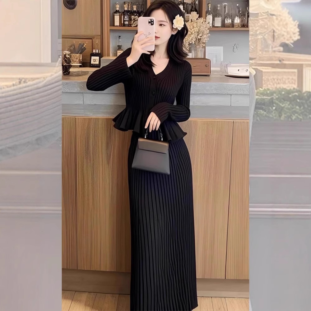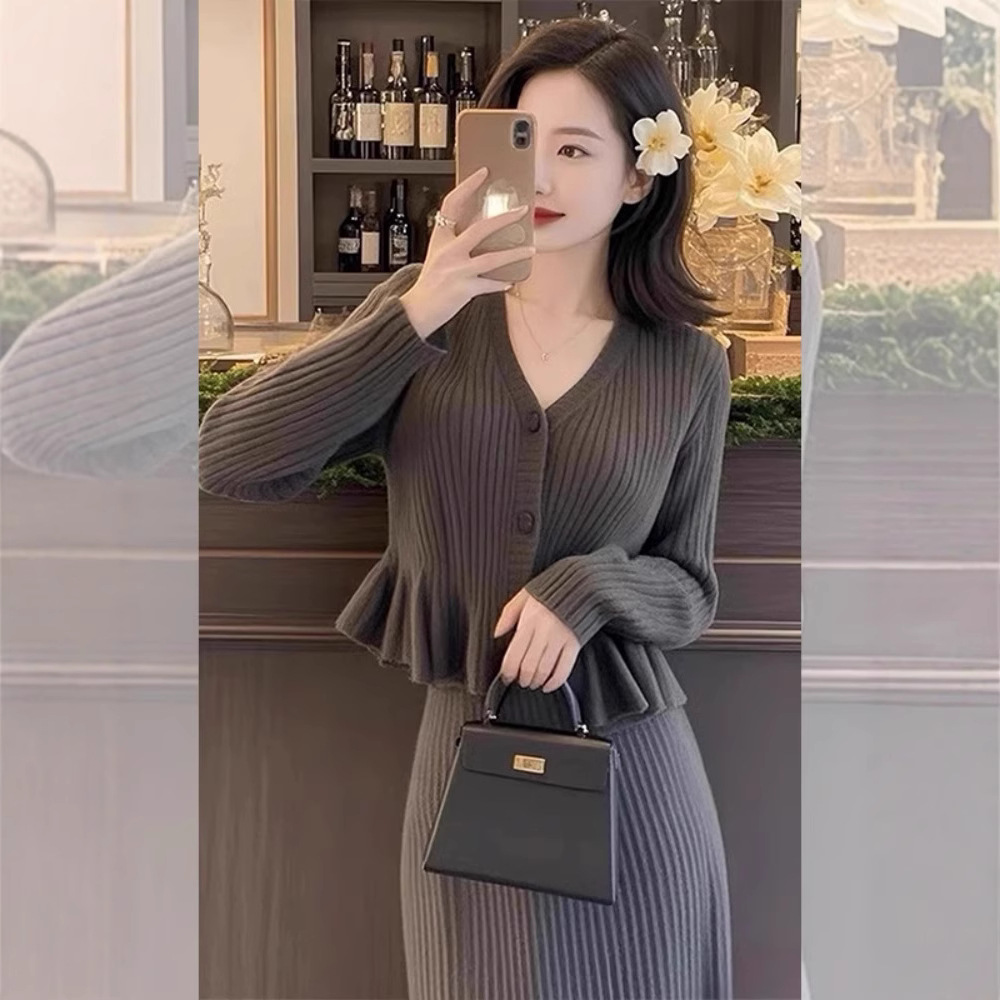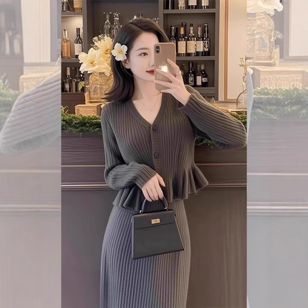 가을과 겨울 고급 회색 세트 한국식 초겨울복 세트 여성 패션 스웨터 스커트 투피스 세트