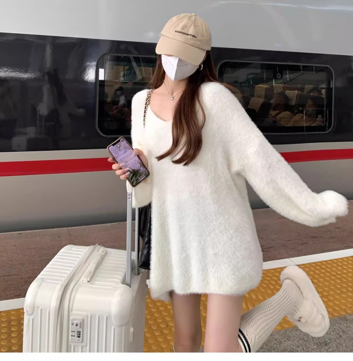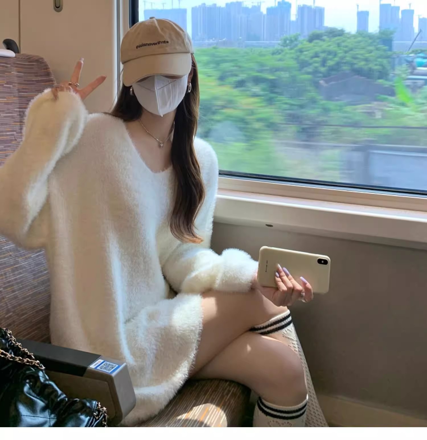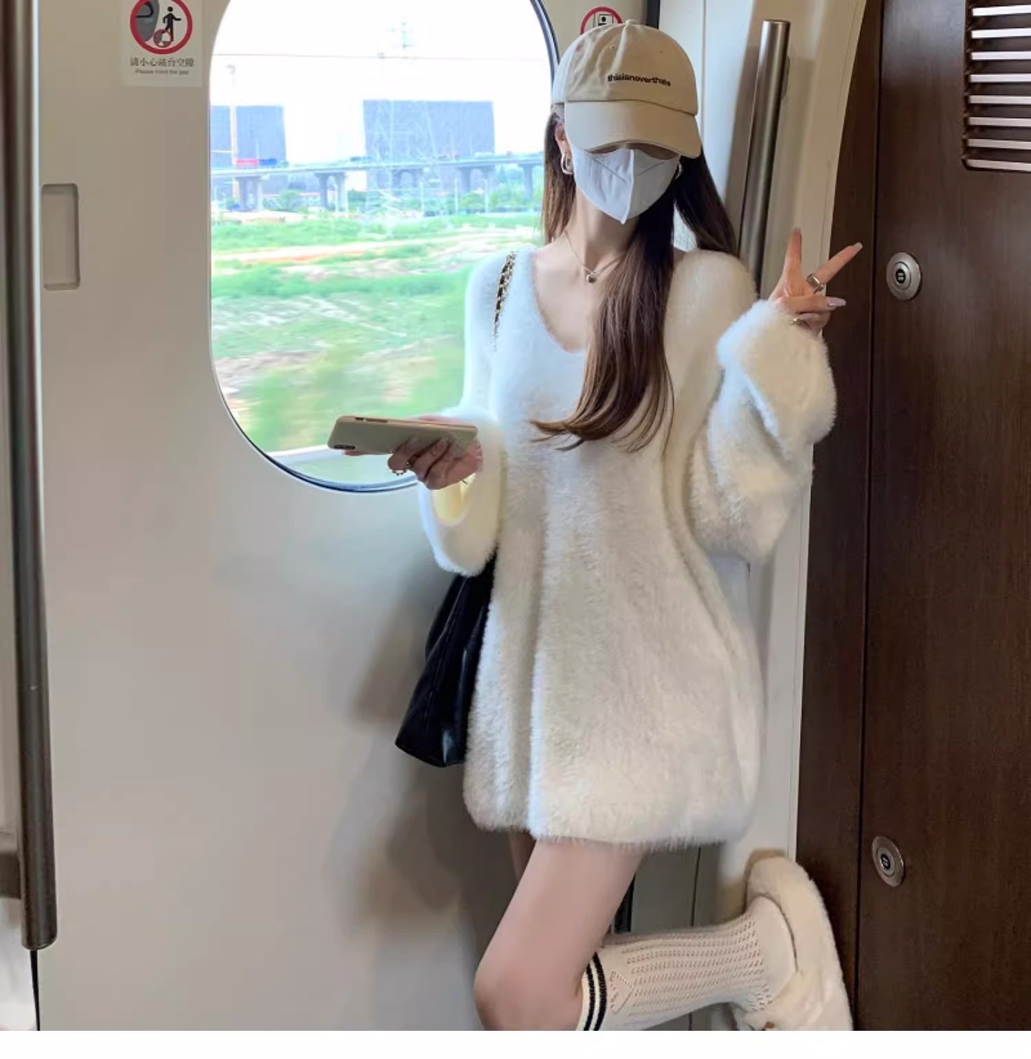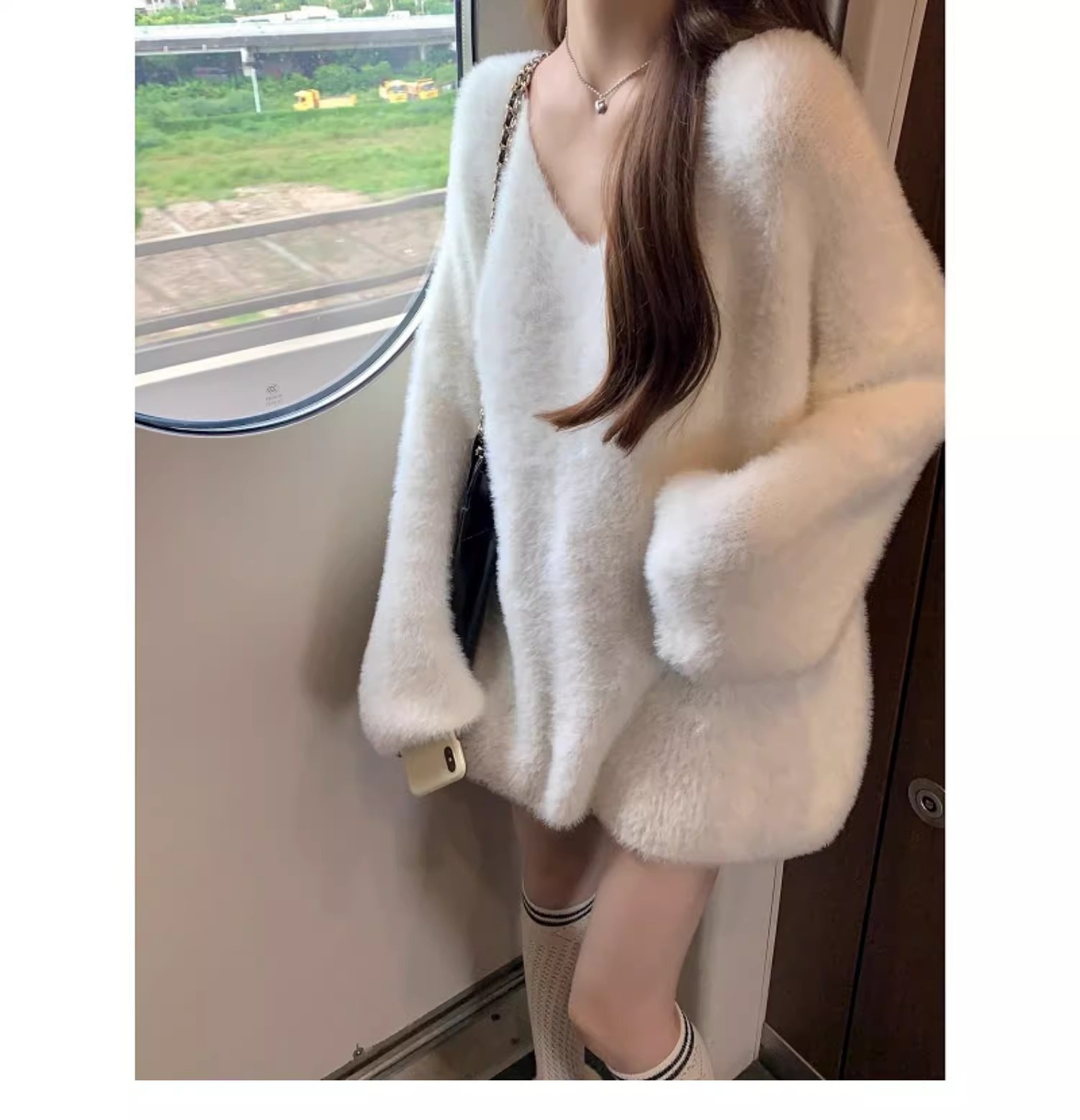 부드러운 스타일 V 넥 모방 밍크 캐시미어 스웨터 여성의 가을 오프 숄더 풀오버 느슨한 여성용 긴팔 화이트 스웨터 탑스토어 가기