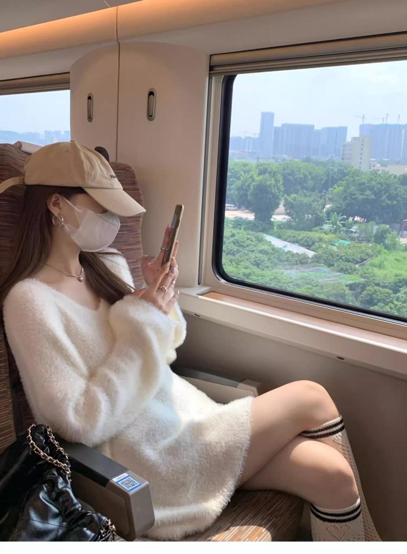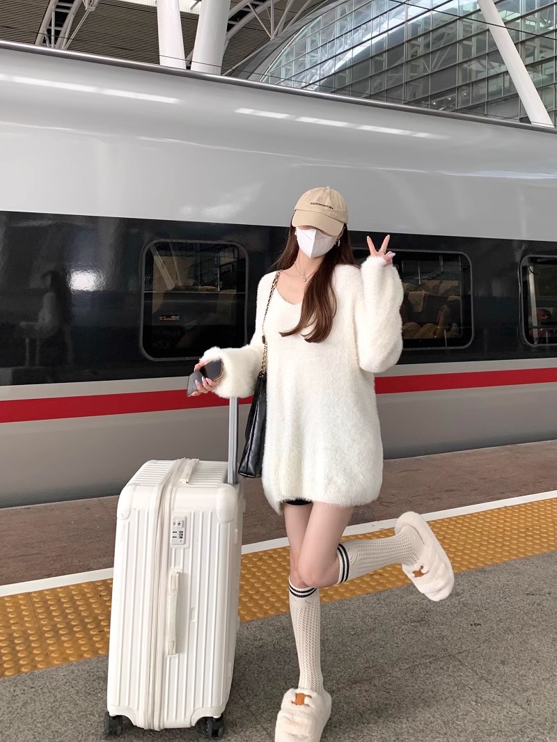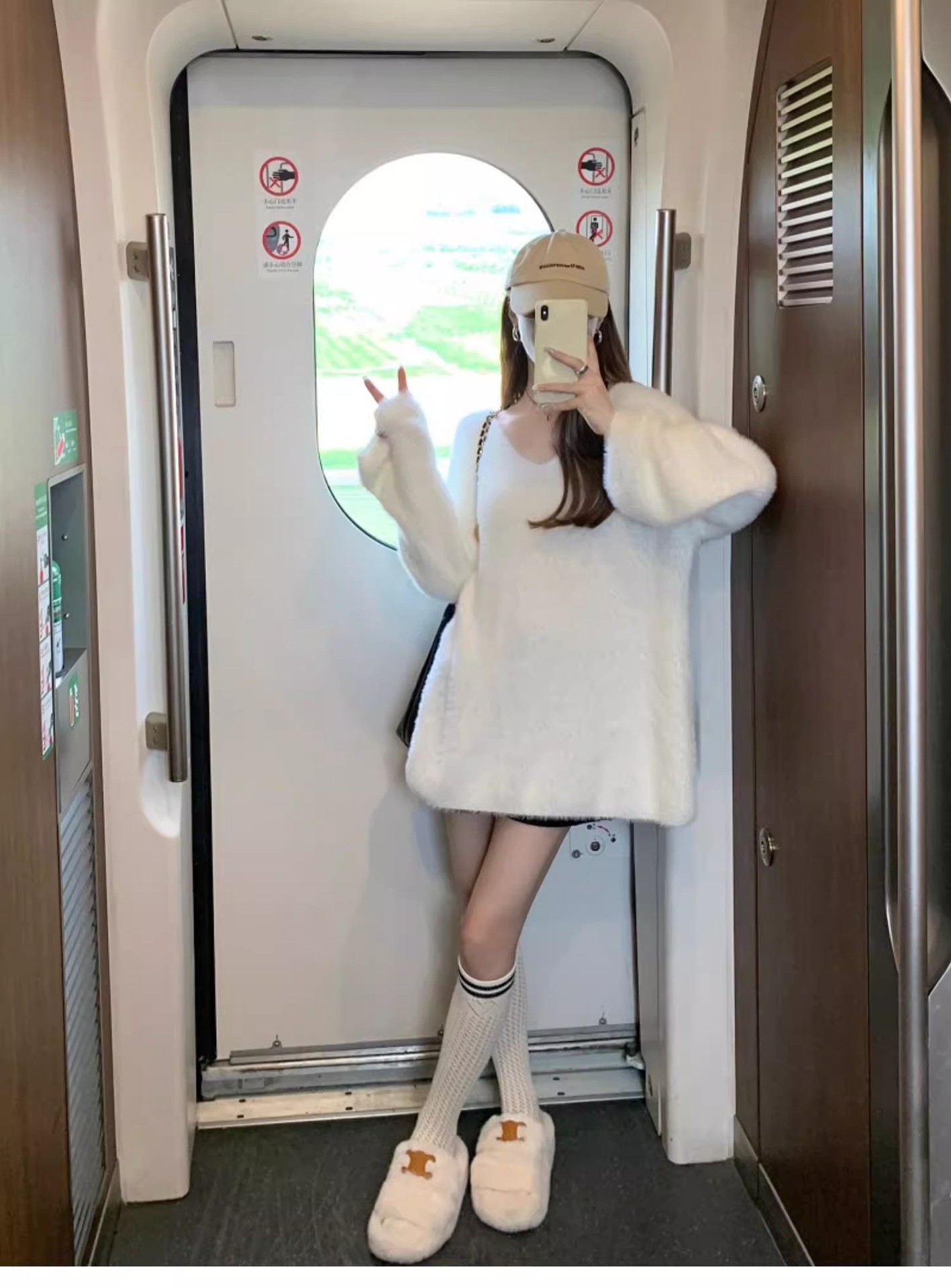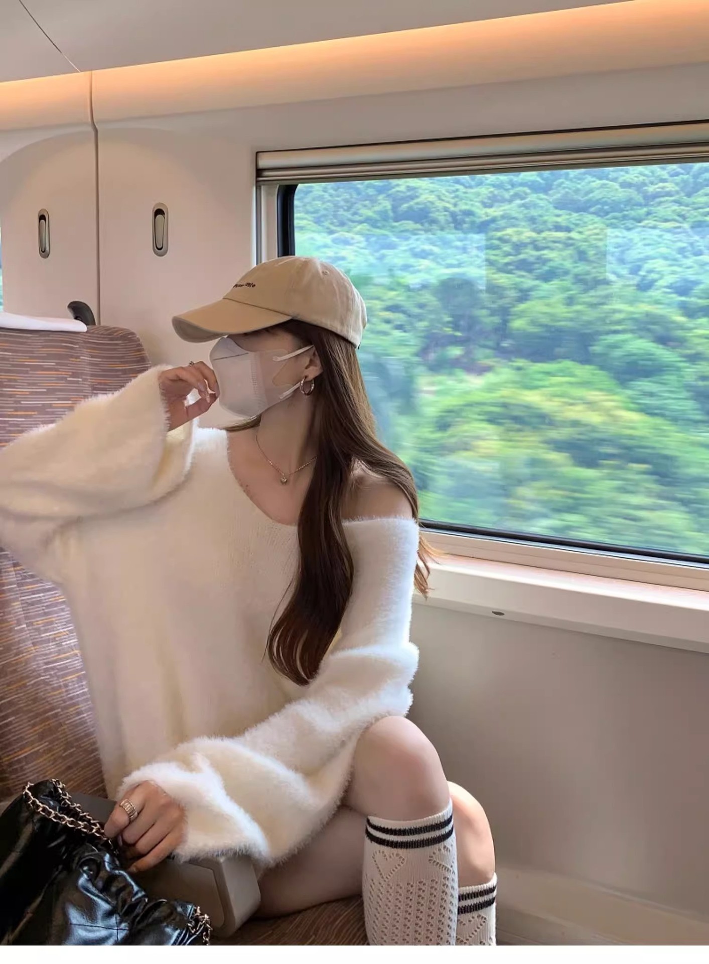 부드러운 스타일 V 넥 모방 밍크 캐시미어 스웨터 여성의 가을 오프 숄더 풀오버 느슨한 여성용 긴팔 화이트 스웨터 탑스토어 가기