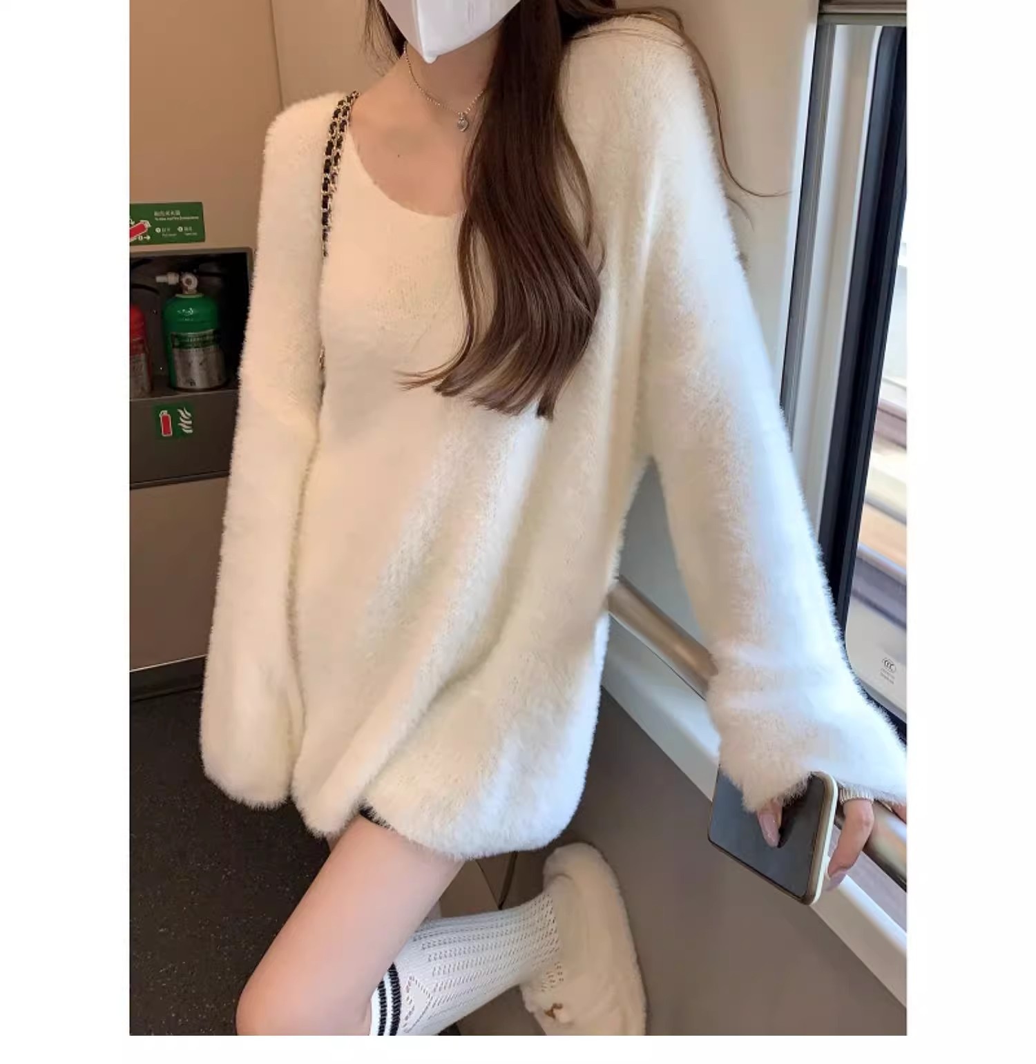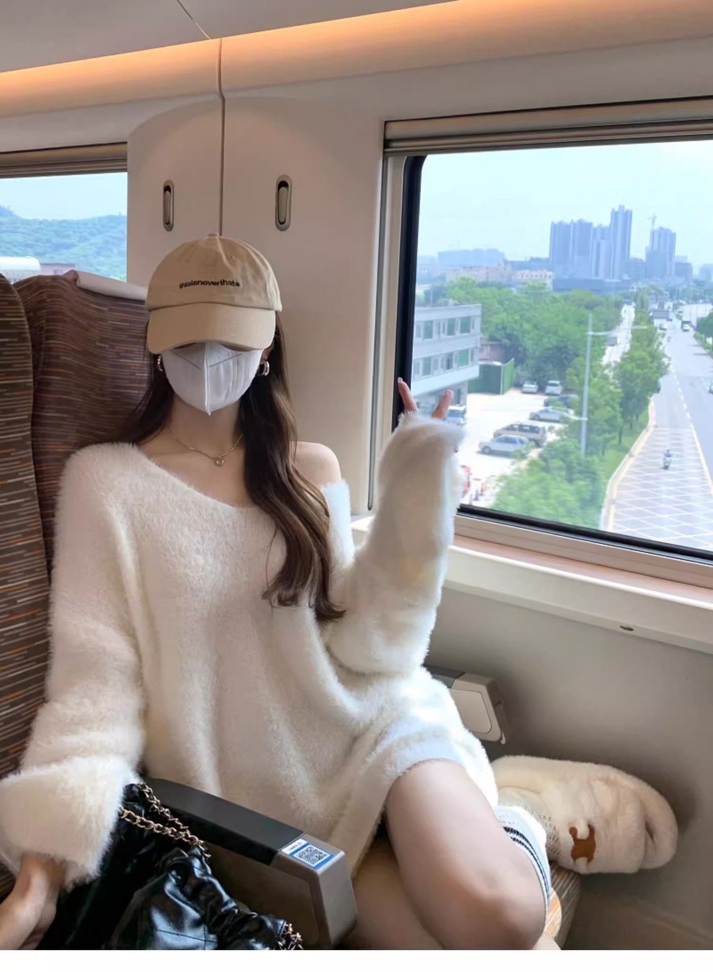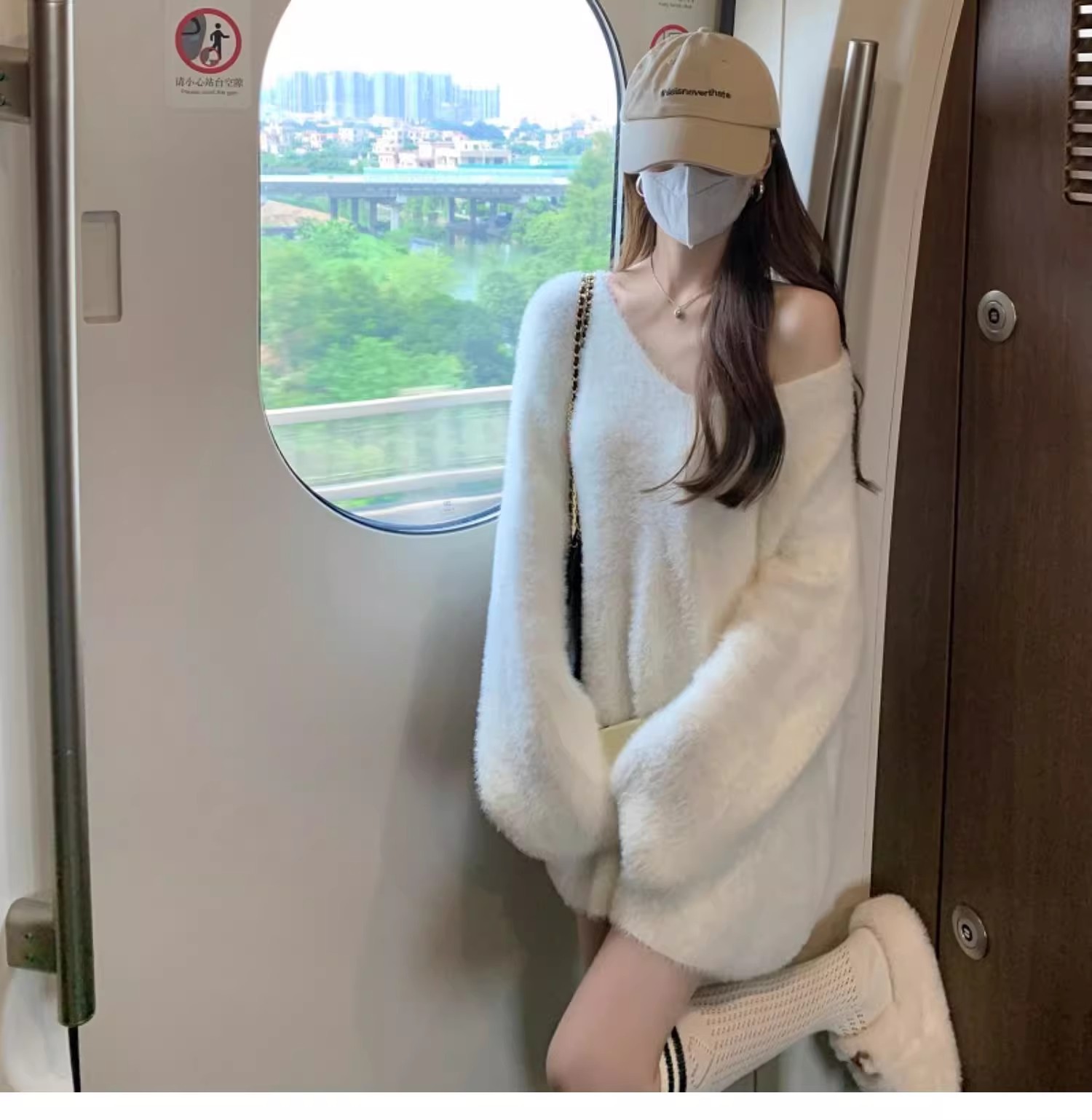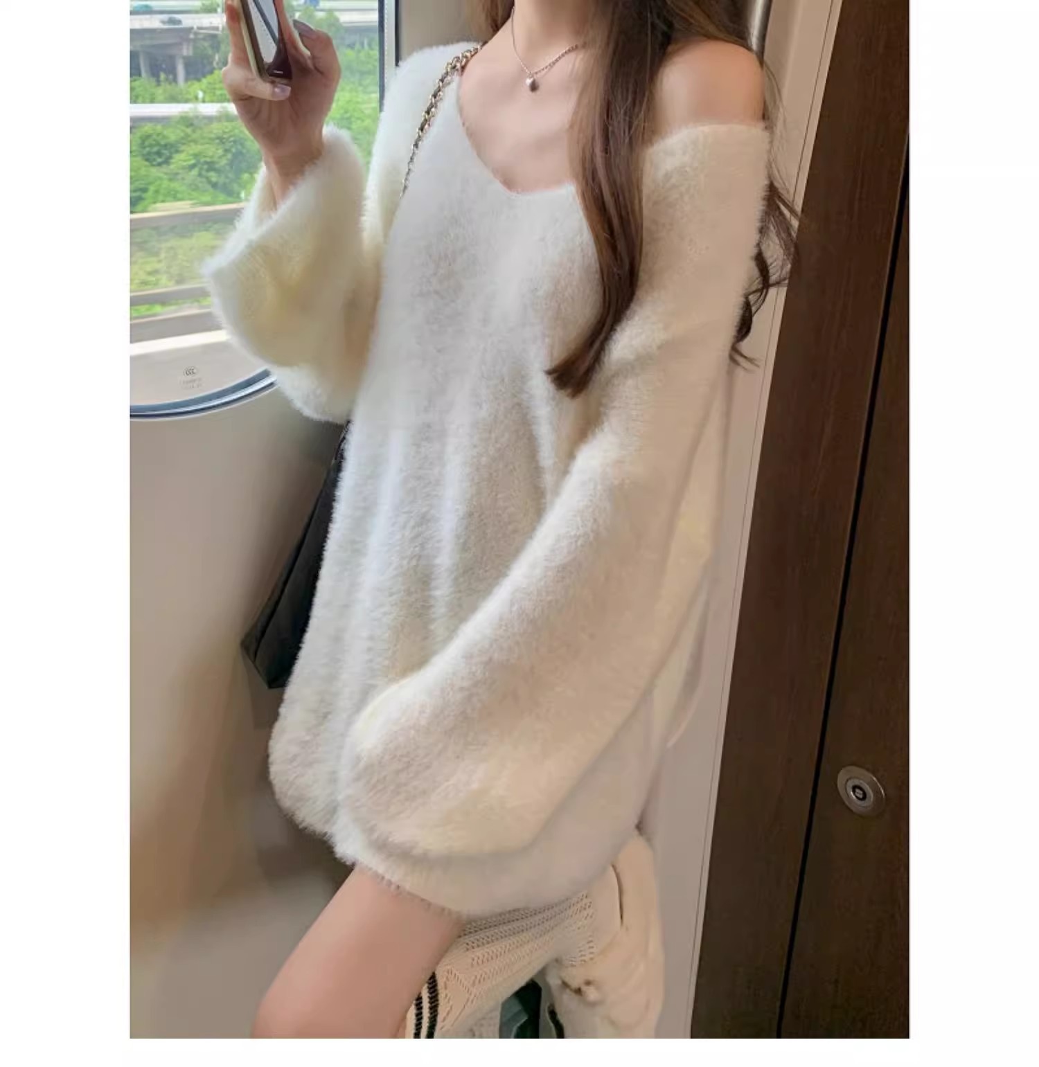부드러운 스타일 V 넥 모방 밍크 캐시미어 스웨터 여성의 가을 오프 숄더 풀오버 느슨한 여성용 긴팔 화이트 스웨터 탑