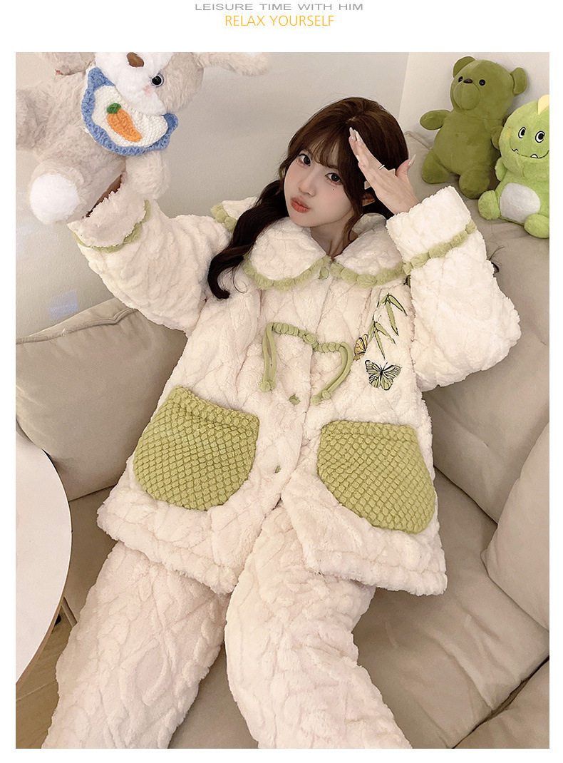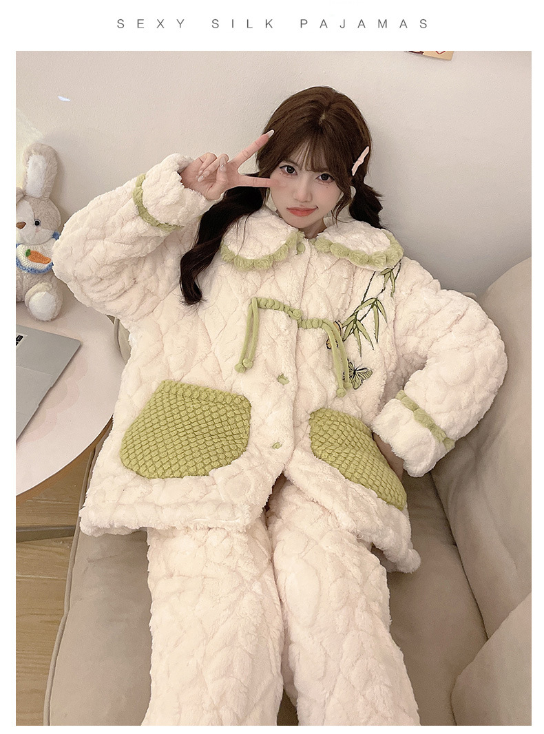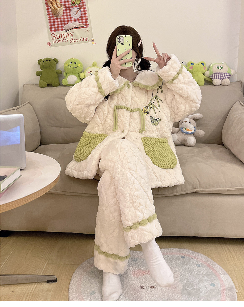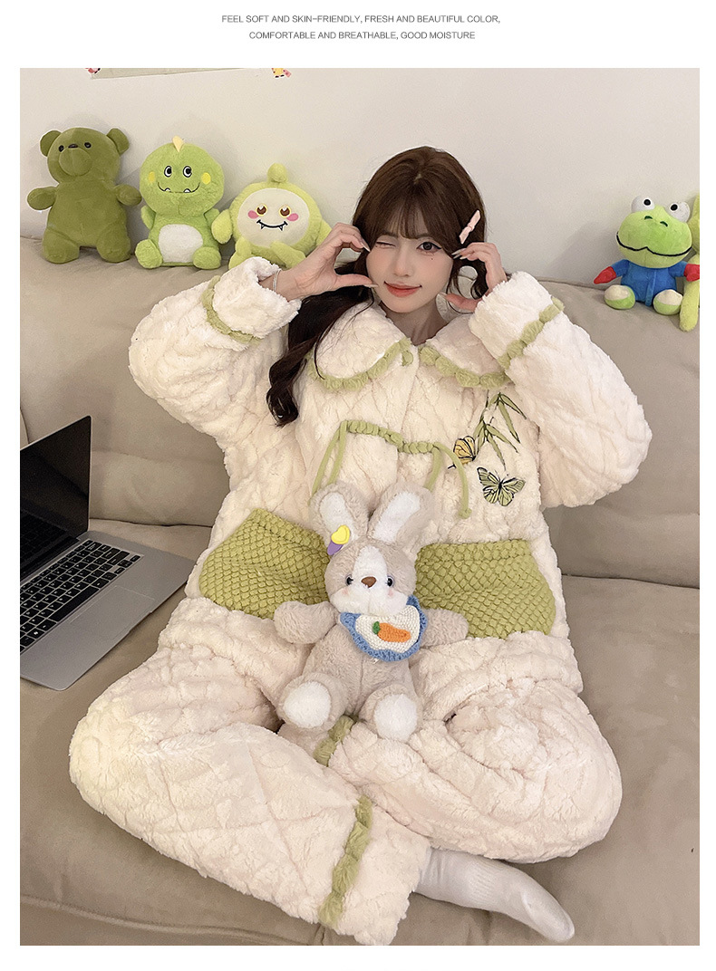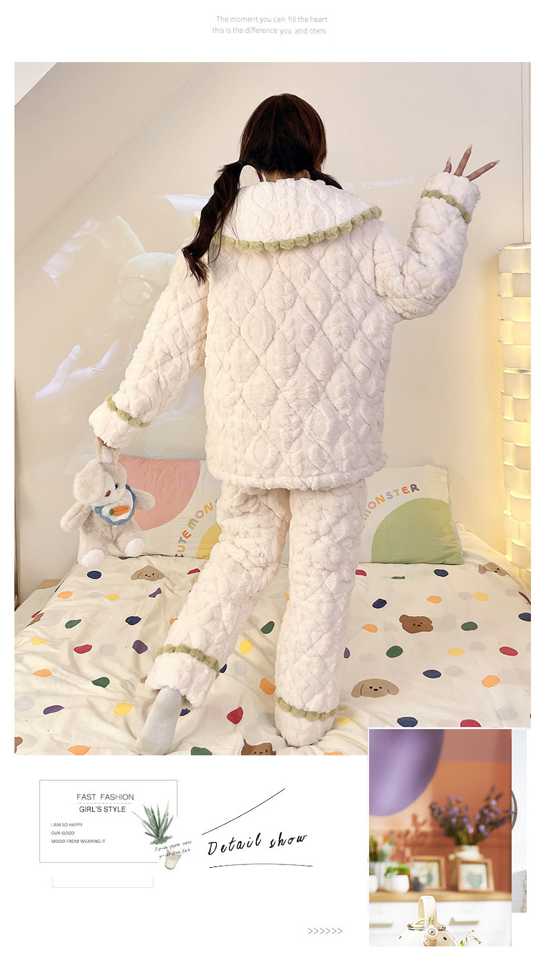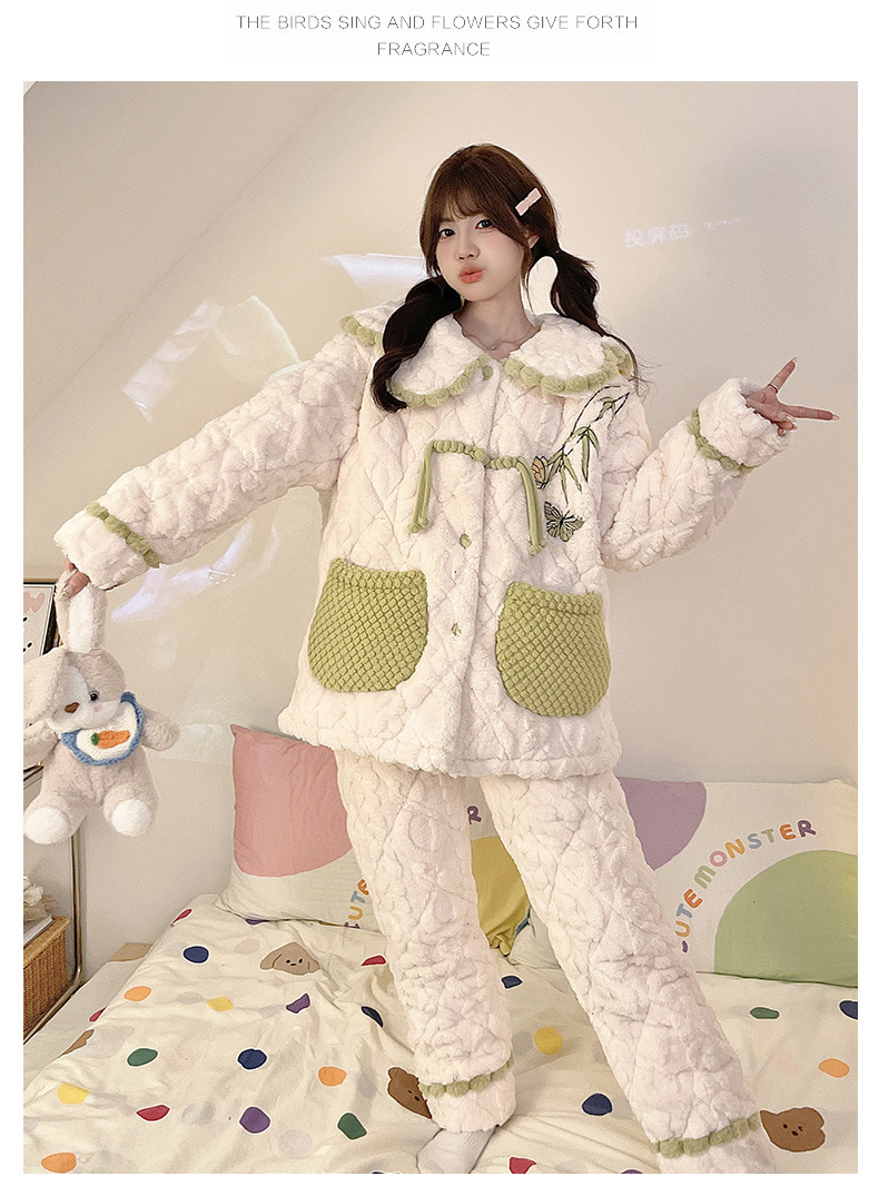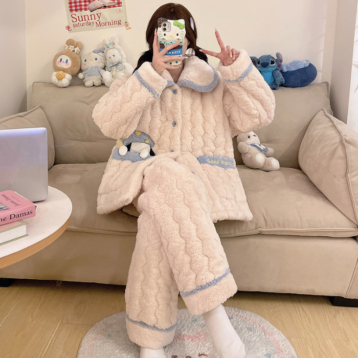 산호 양털 3 층 퀼트 파자마 여성의 겨울 오픈 라이닝 기모 두꺼운 만화 귀여운 겉옷 홈 의류 세트스토어 가기