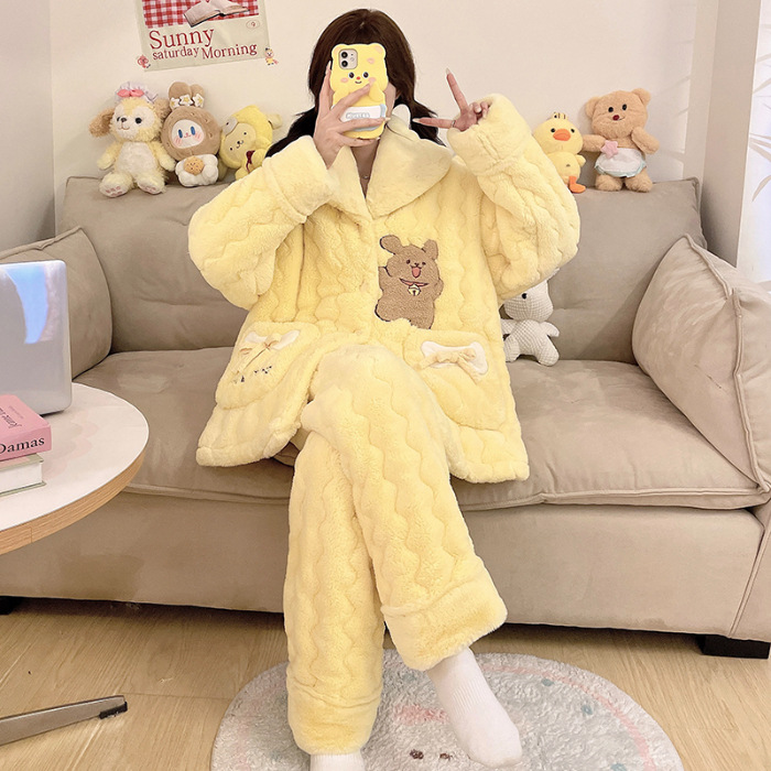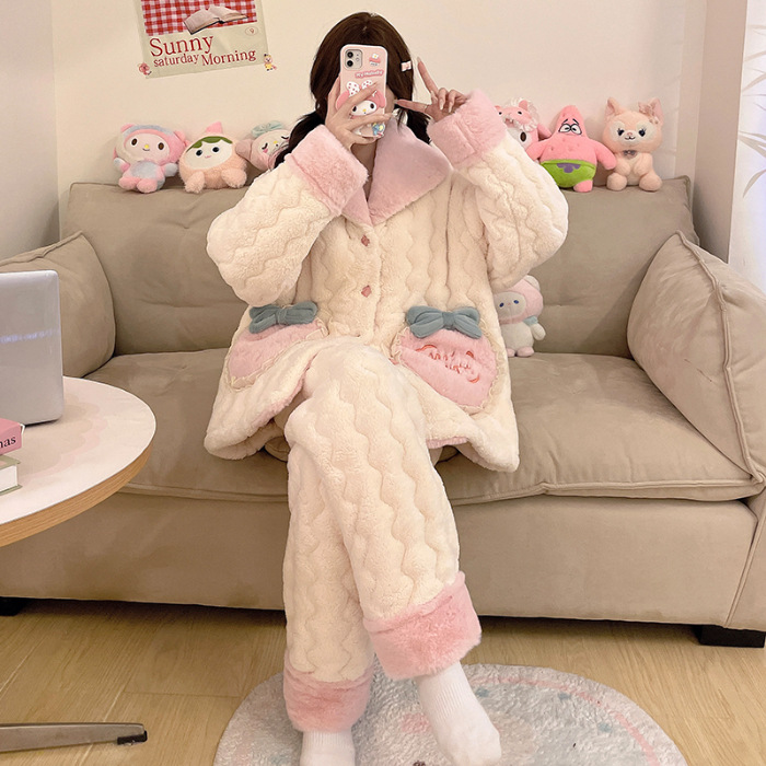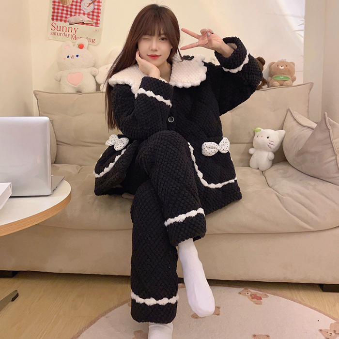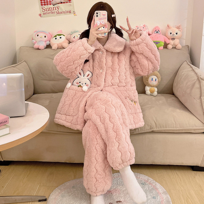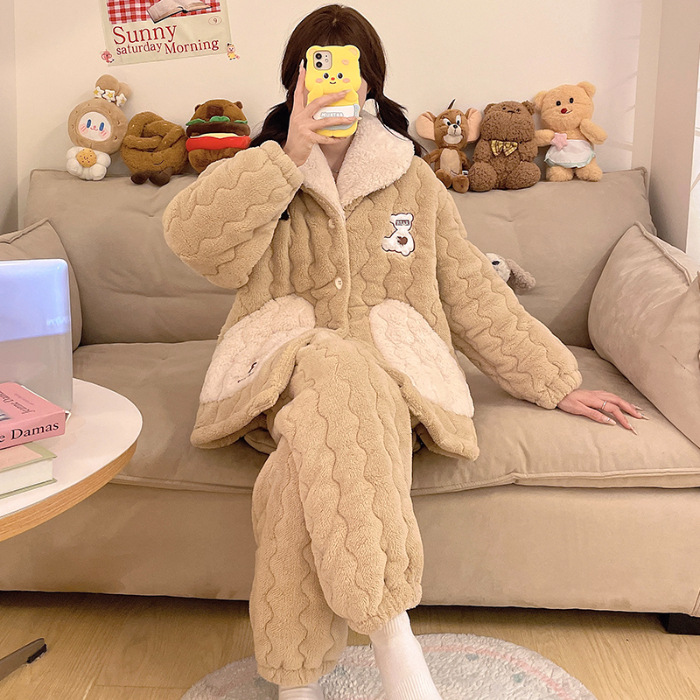 산호 양털 3 층 퀼트 파자마 여성의 겨울 오픈 라이닝 기모 두꺼운 만화 귀여운 겉옷 홈 의류 세트