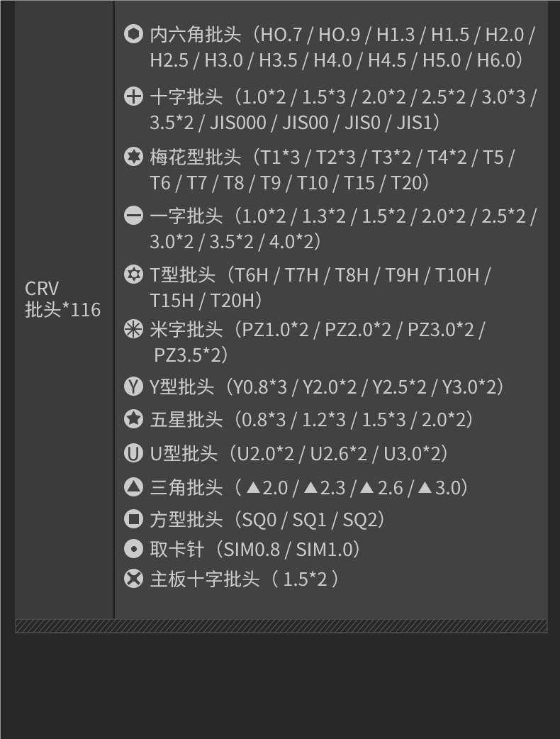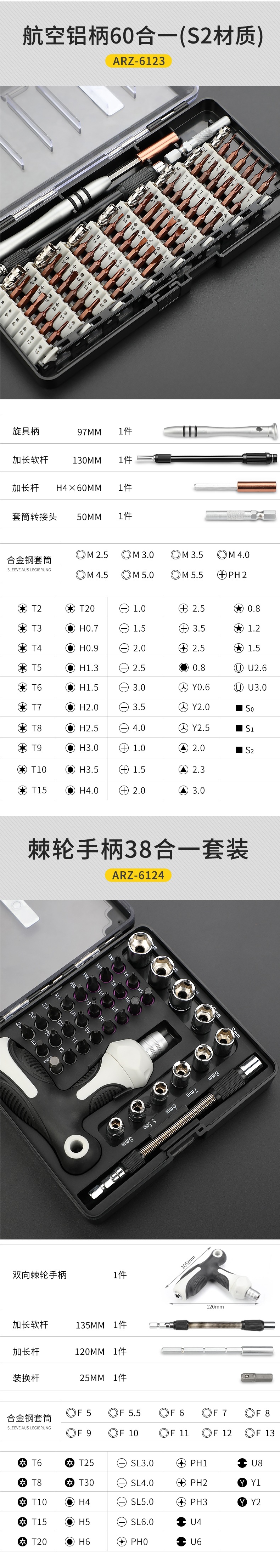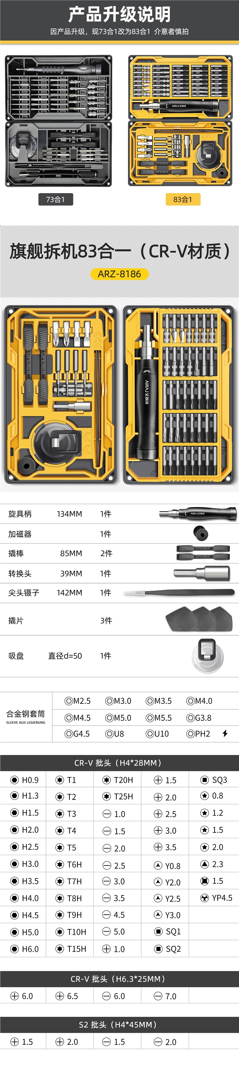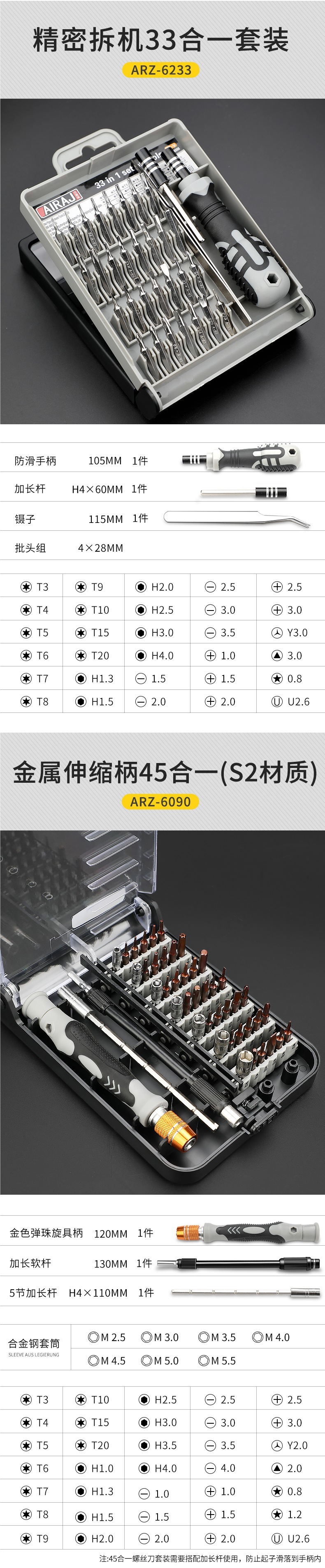 • Arrizo 33 in 1(크롬 바나듐 강철)에는 분해된 기계 세트 8개가 함께 제공됩니다.