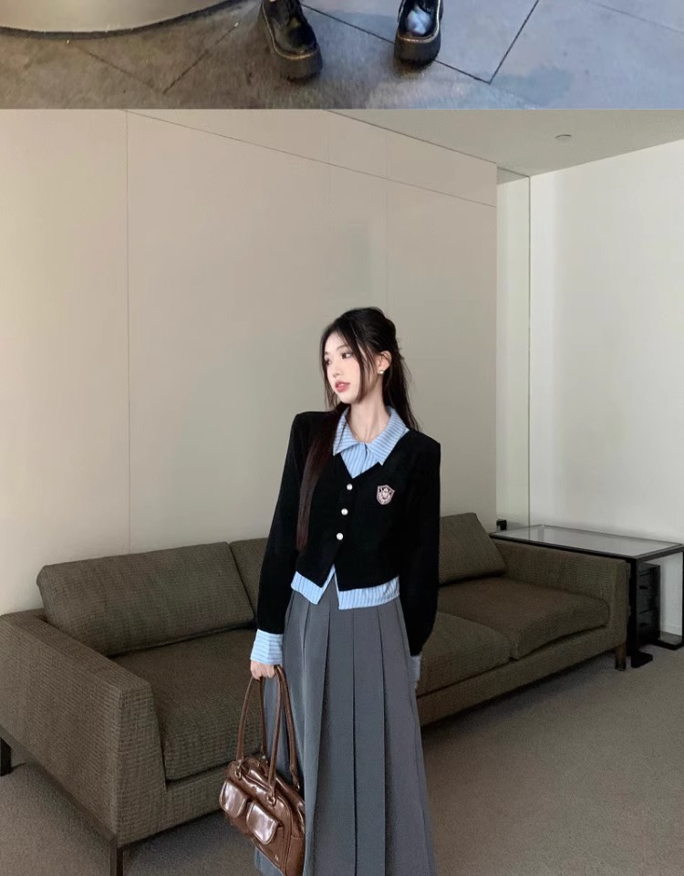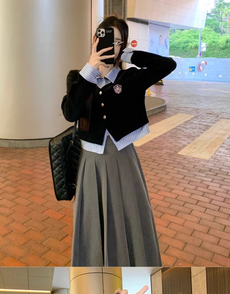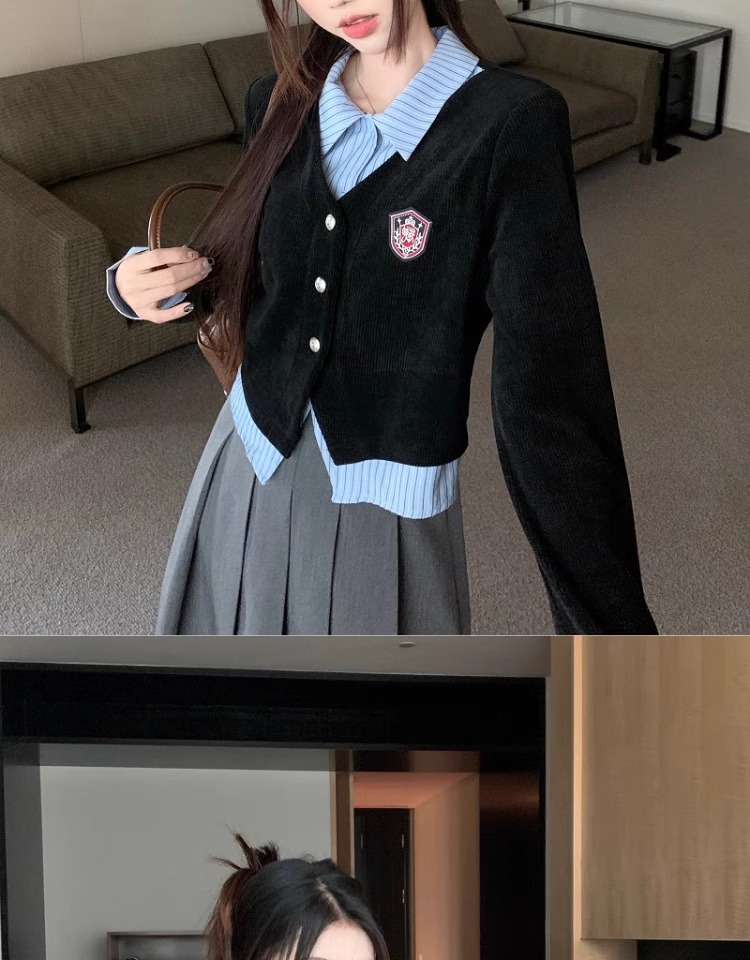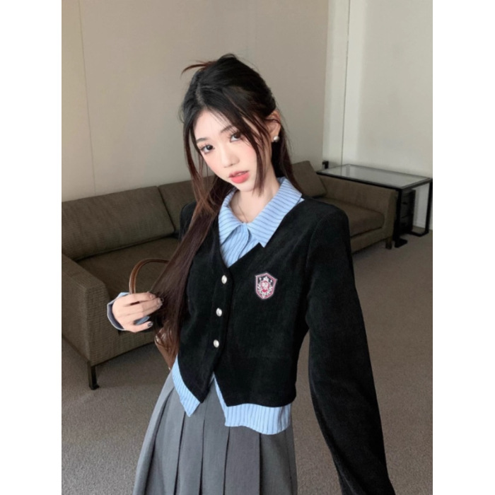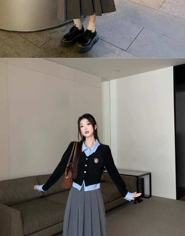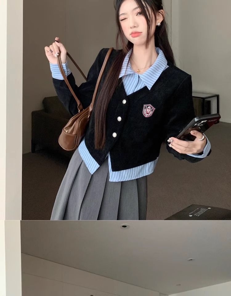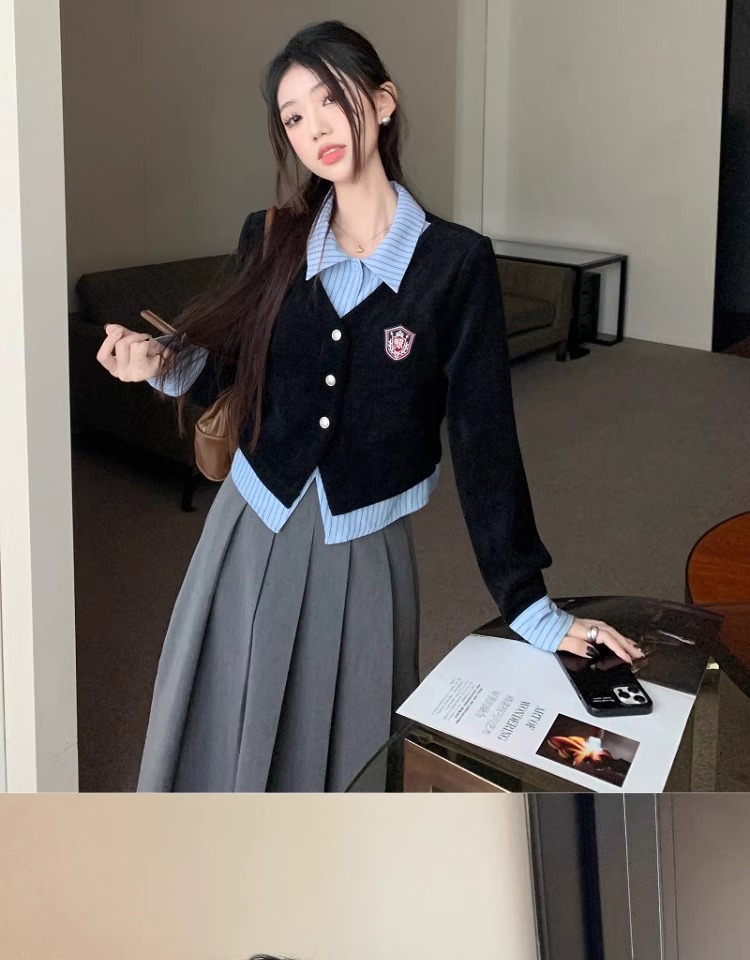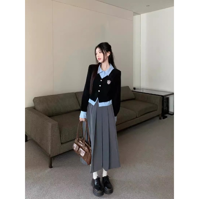 대학 스타일의 세트 여성 가짜 투피스 폴로 칼라 긴팔 셔츠 최고 가을 높은 허리 주름 스커트 투피스 세트스토어 가기
