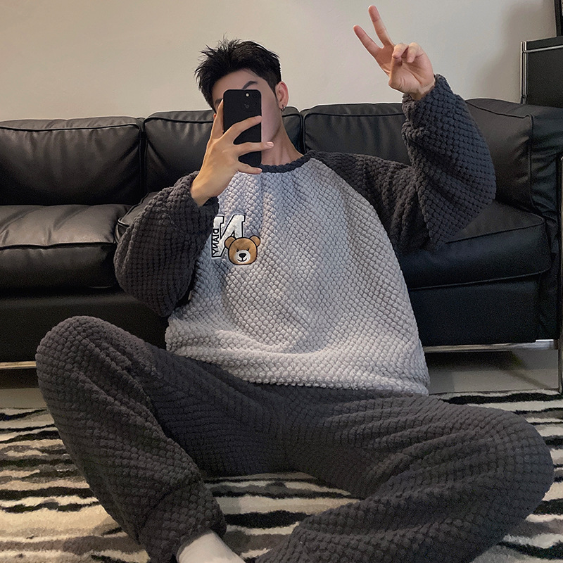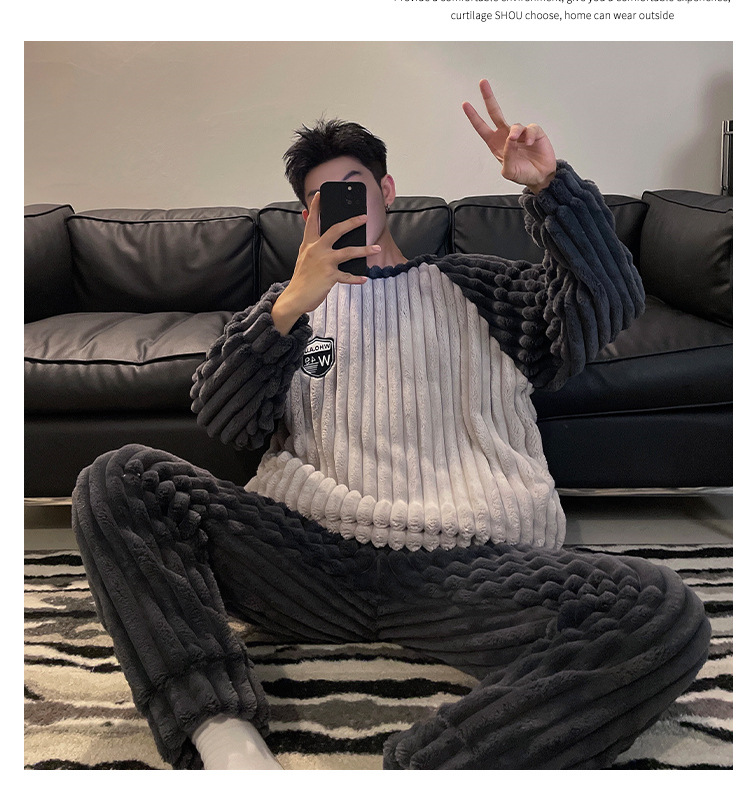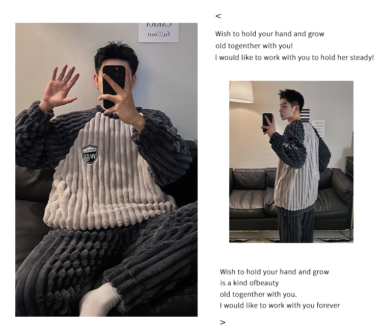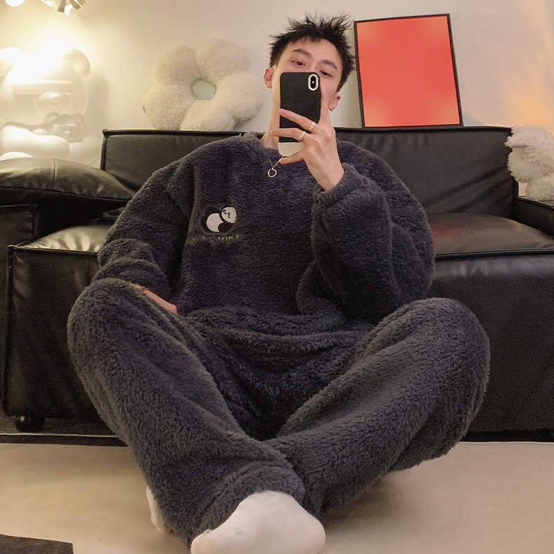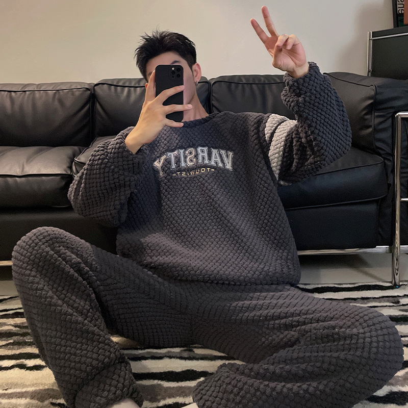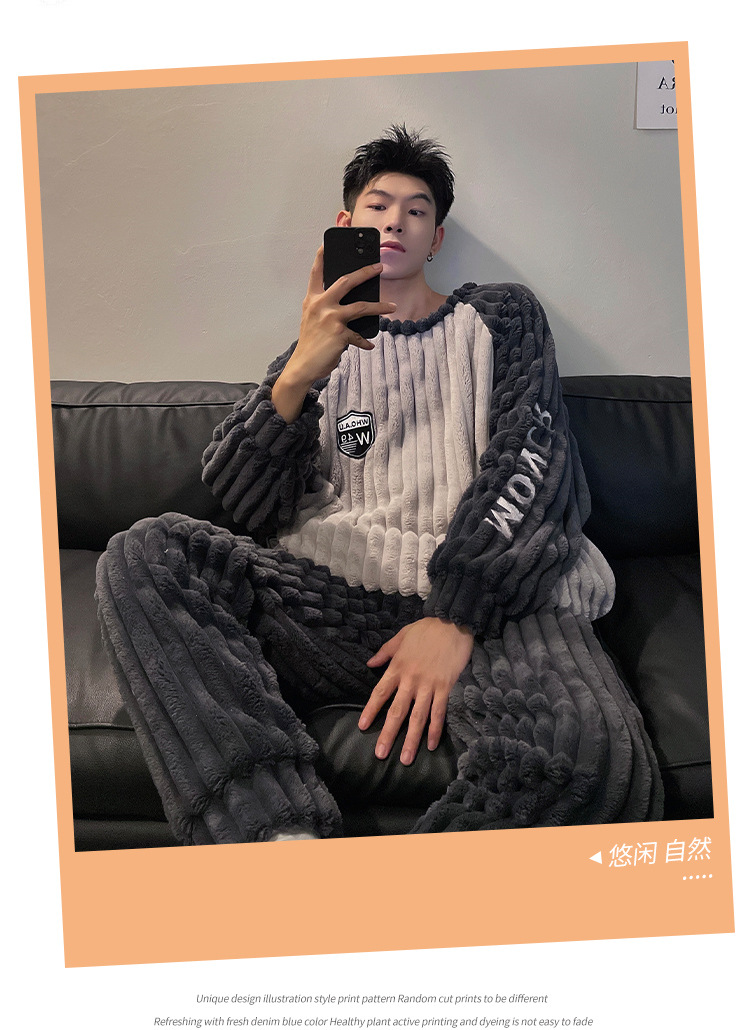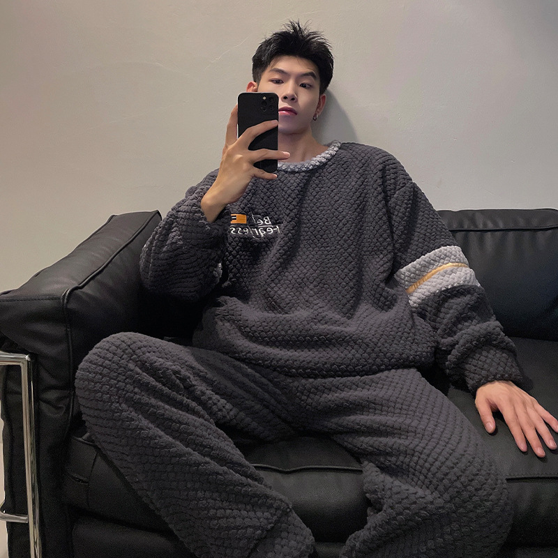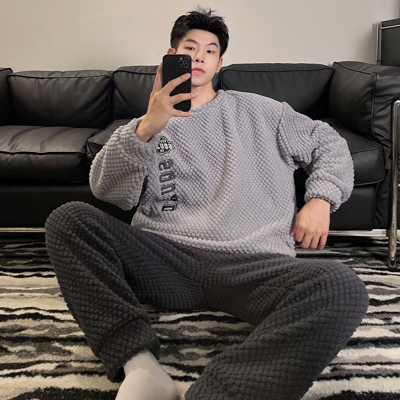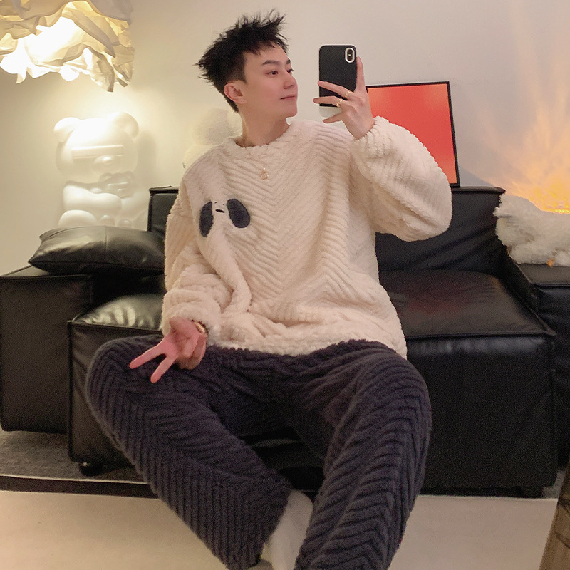 2024 년 겨울 새 플란넬 남성 아웃웨어 두꺼운 파자마 긴 소매 바지 플러시 홈 의류 세트스토어 가기