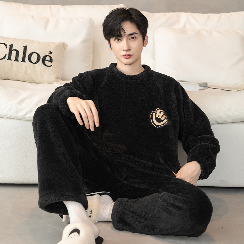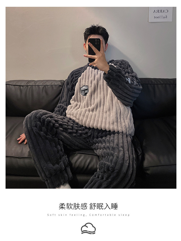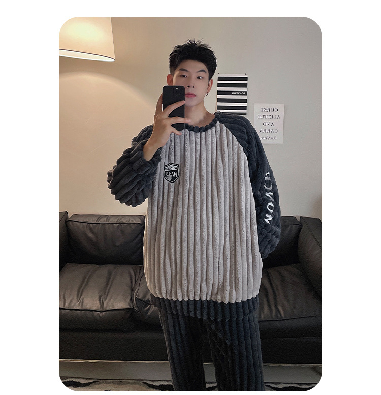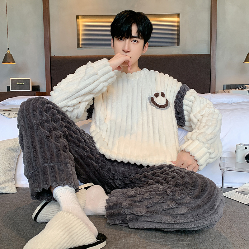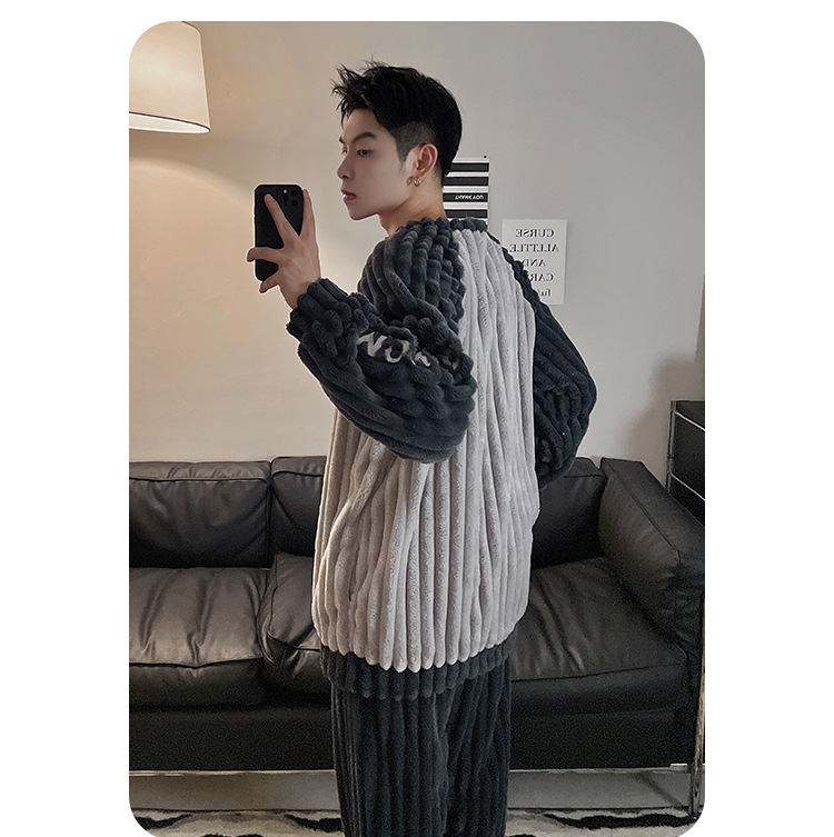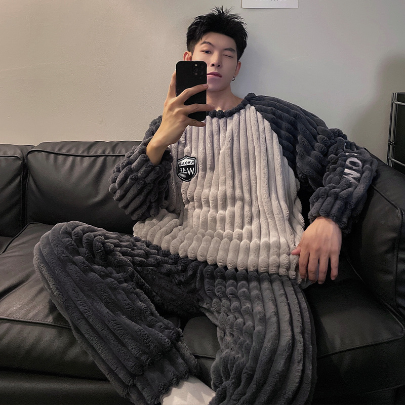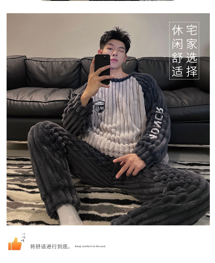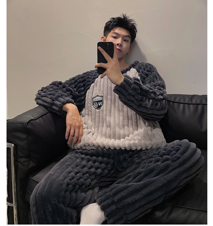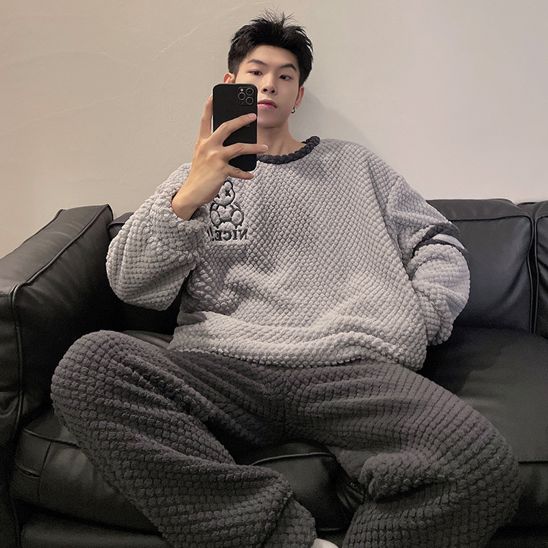 2024 년 겨울 새 플란넬 남성 아웃웨어 두꺼운 파자마 긴 소매 바지 플러시 홈 의류 세트스토어 가기