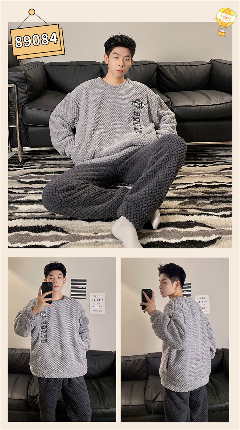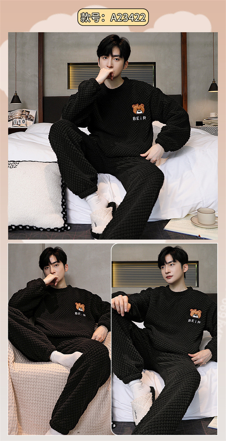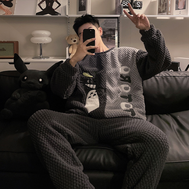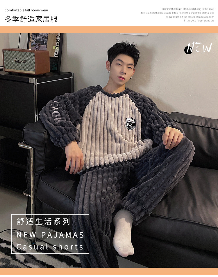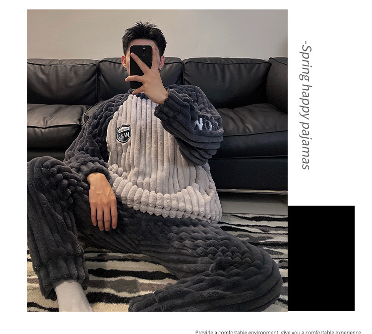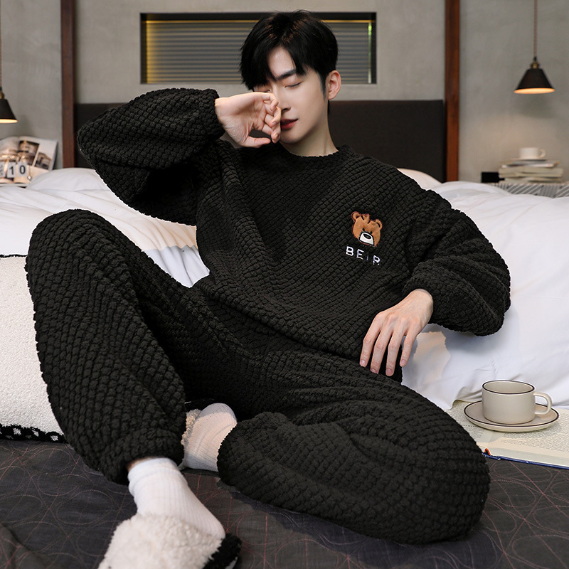 2024 년 겨울 새 플란넬 남성 아웃웨어 두꺼운 파자마 긴 소매 바지 플러시 홈 의류 세트스토어 가기
