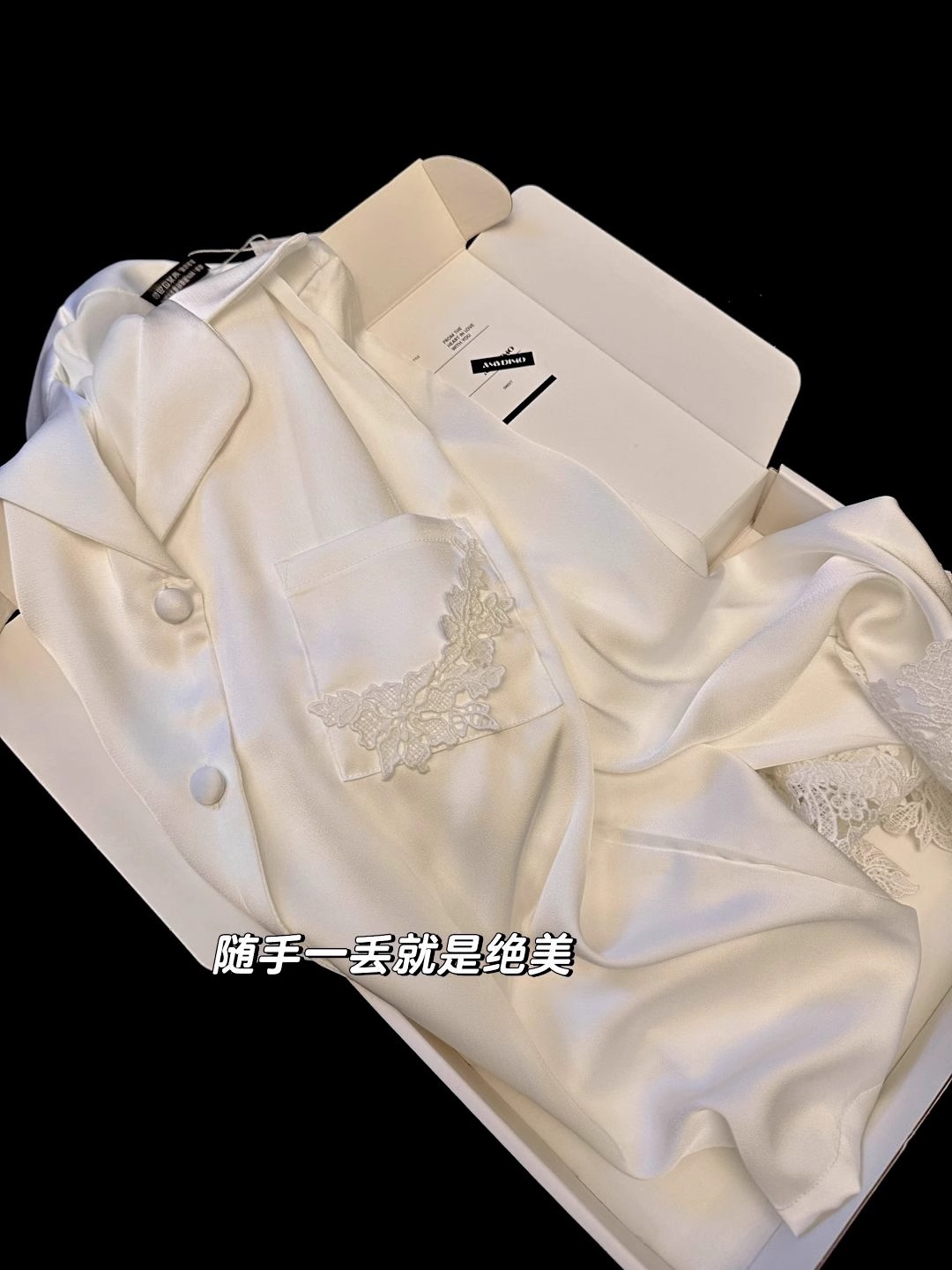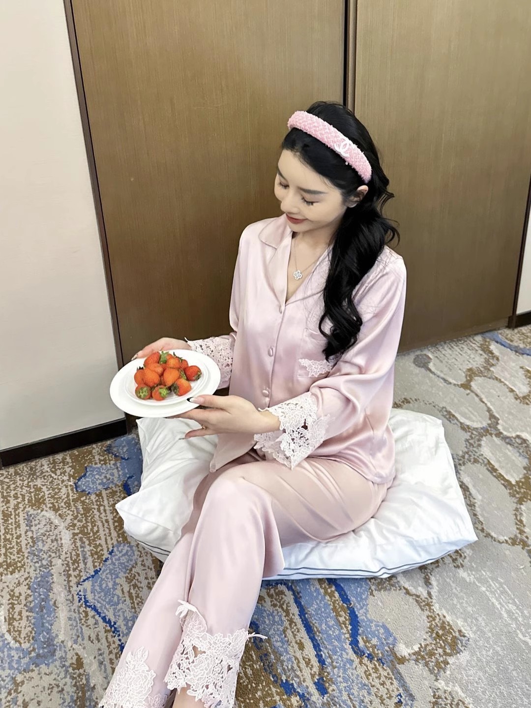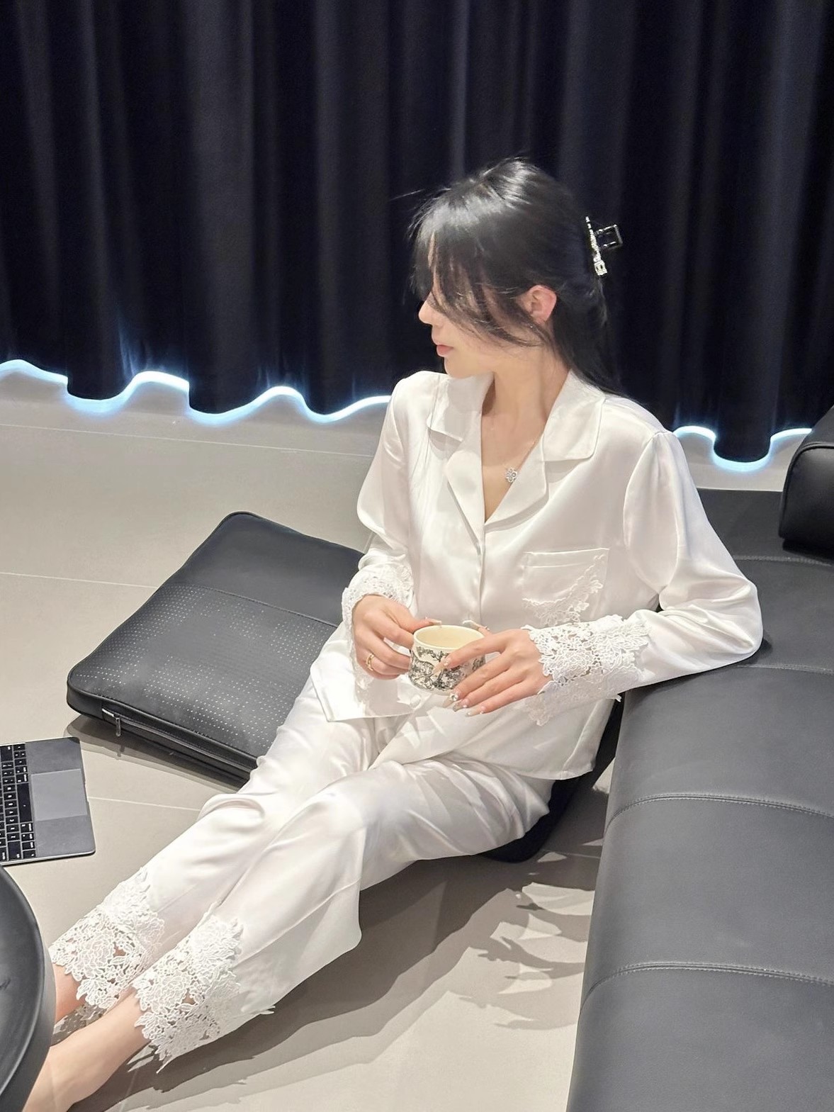 여성을위한 고급스러운 얼음과 눈 실크 잠옷 봄과 여름 새로운 긴팔 바지 달콤한 레이스 소녀 홈웨어 세트스토어 가기