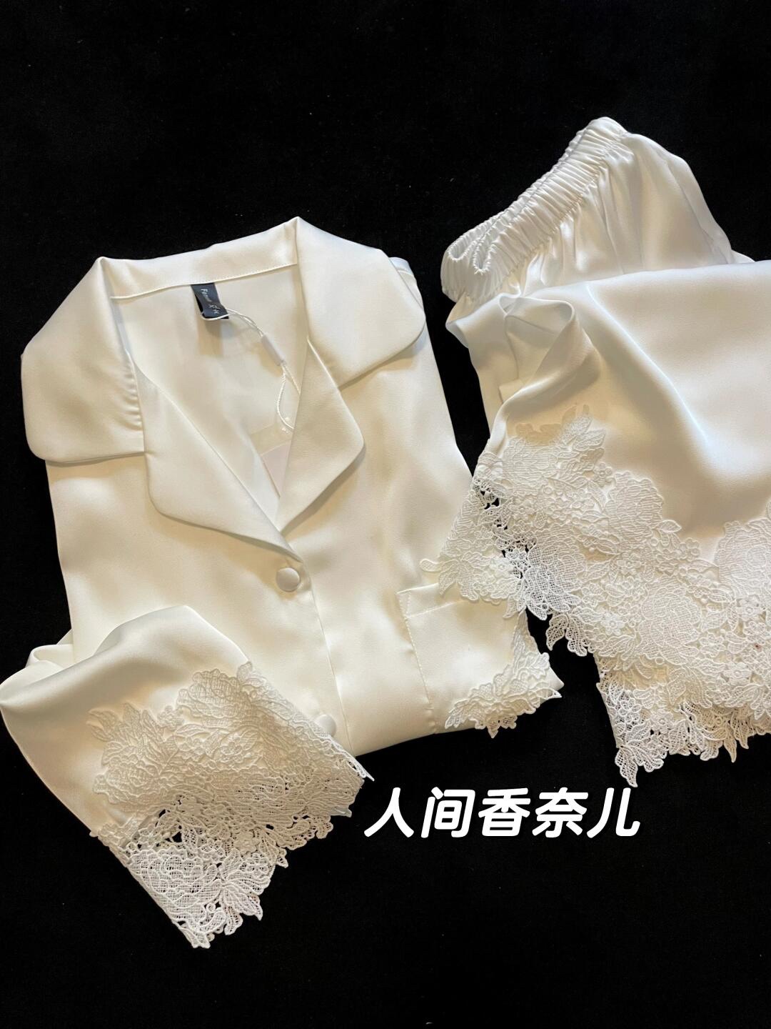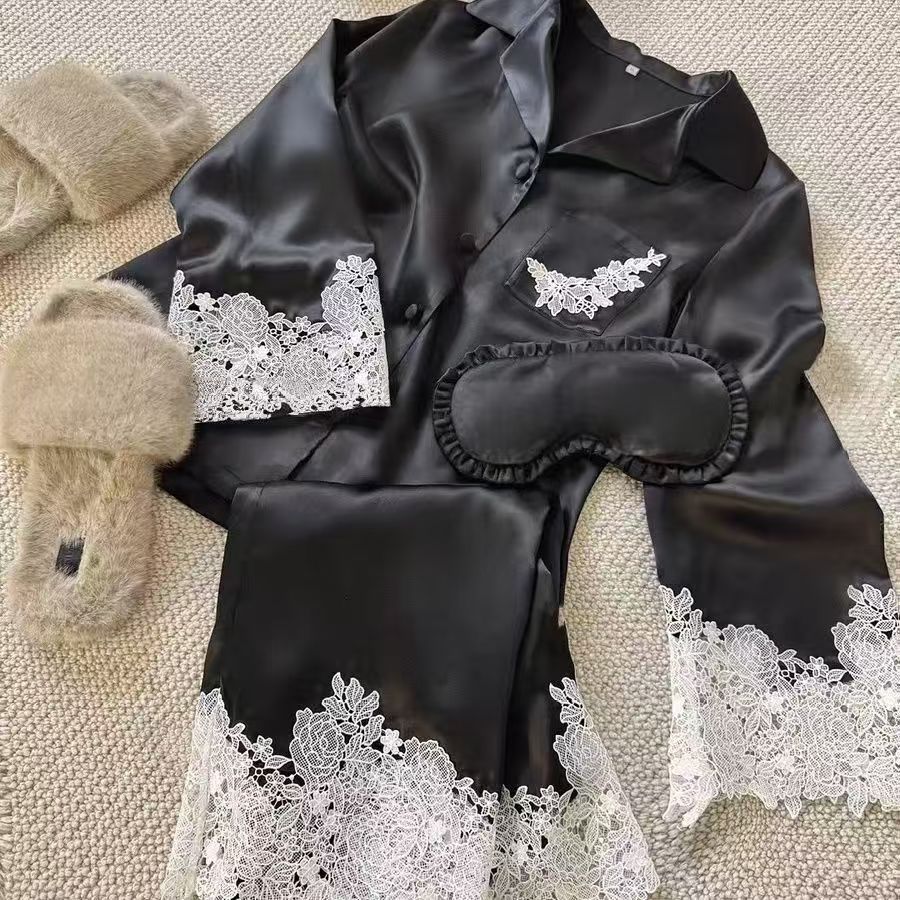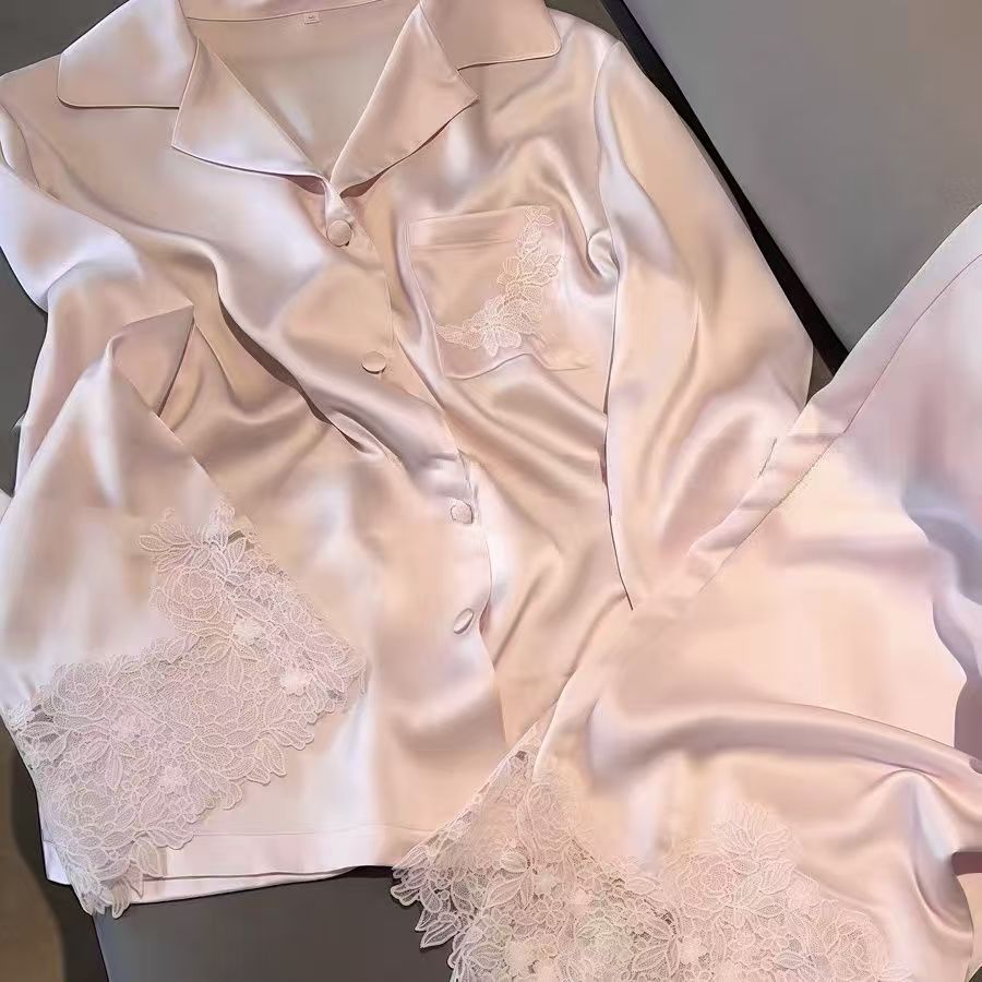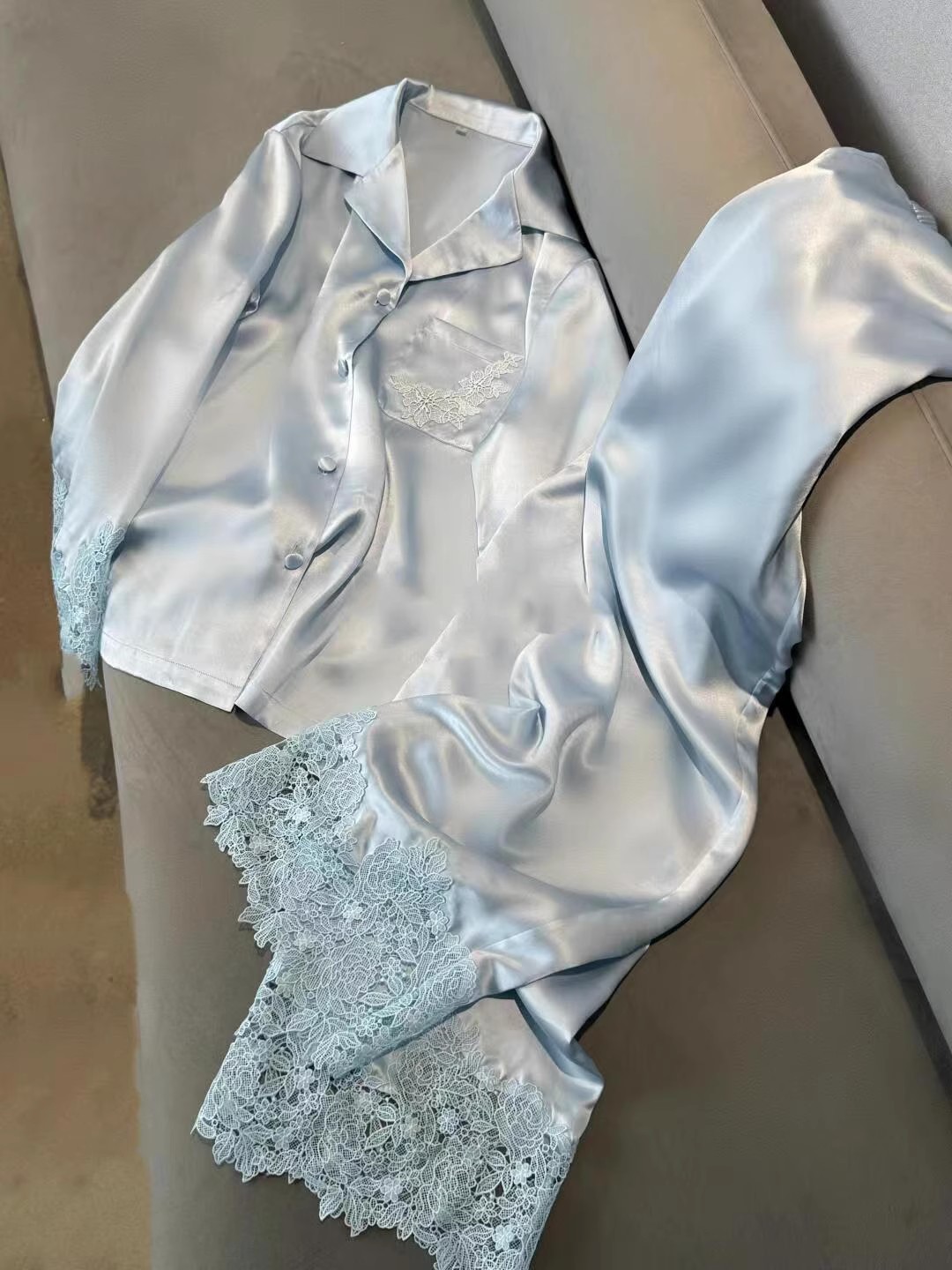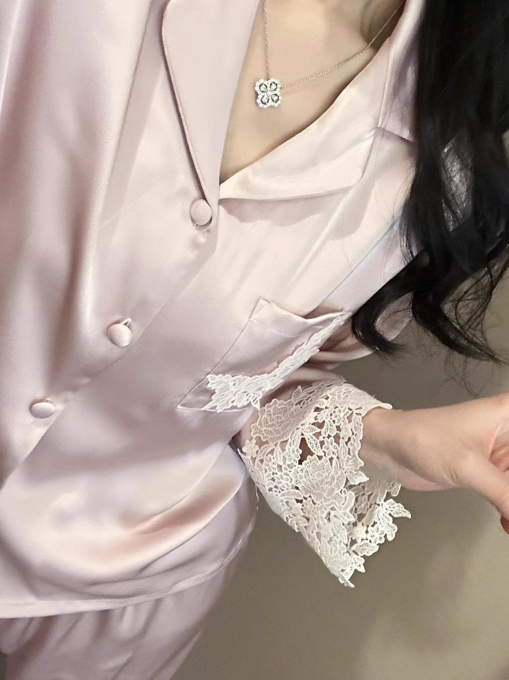 여성을위한 고급스러운 얼음과 눈 실크 잠옷 봄과 여름 새로운 긴팔 바지 달콤한 레이스 소녀 홈웨어 세트