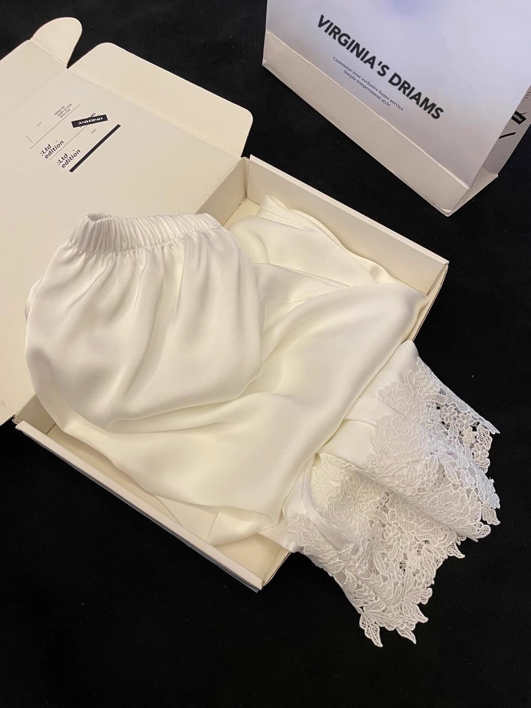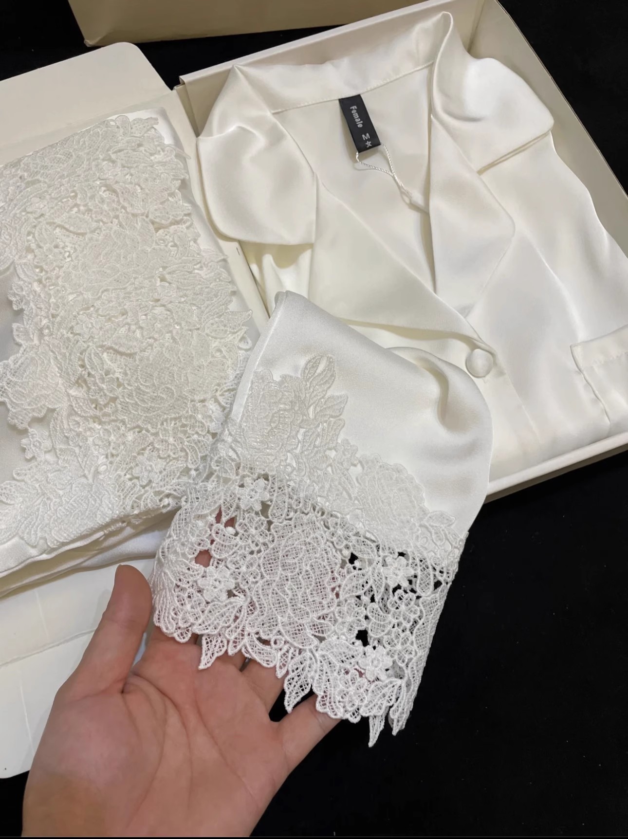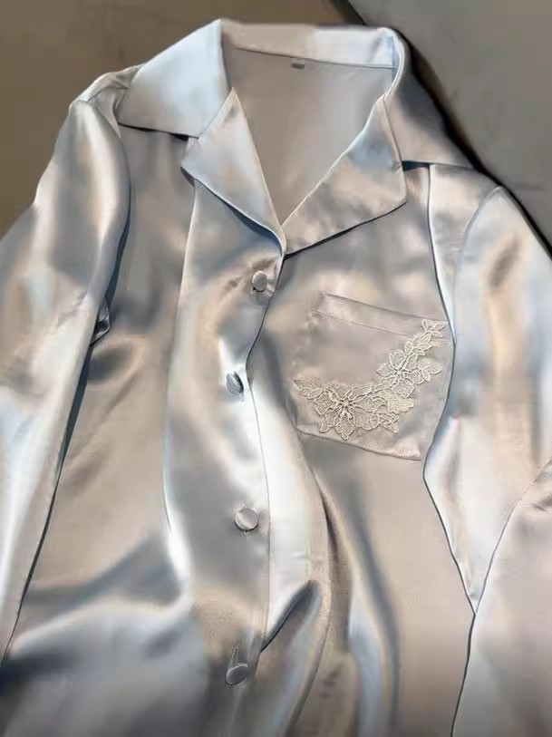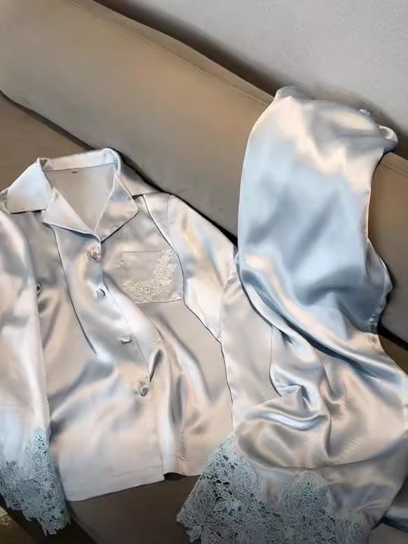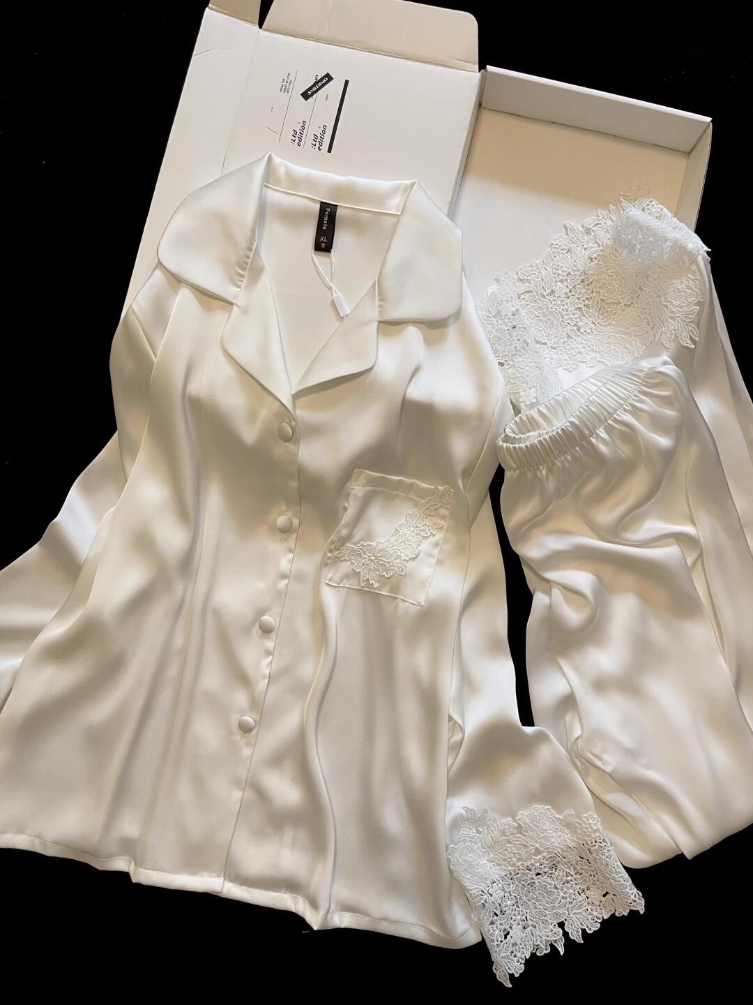 여성을위한 고급스러운 얼음과 눈 실크 잠옷 봄과 여름 새로운 긴팔 바지 달콤한 레이스 소녀 홈웨어 세트