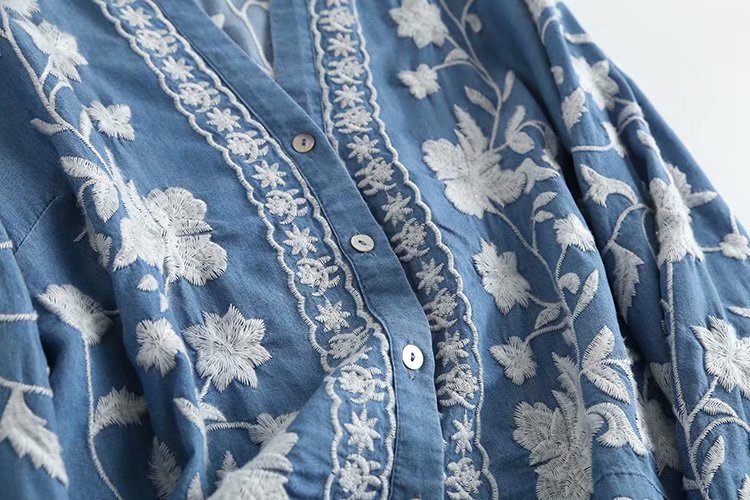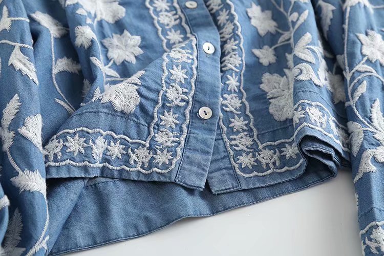 2024 새로운 자수 유럽과 미국 스타일의 여성 가을 도매 전체 길이 긴 소매 셔츠 다크 블루 라이트 블루 개성 거리 데님스토어 가기