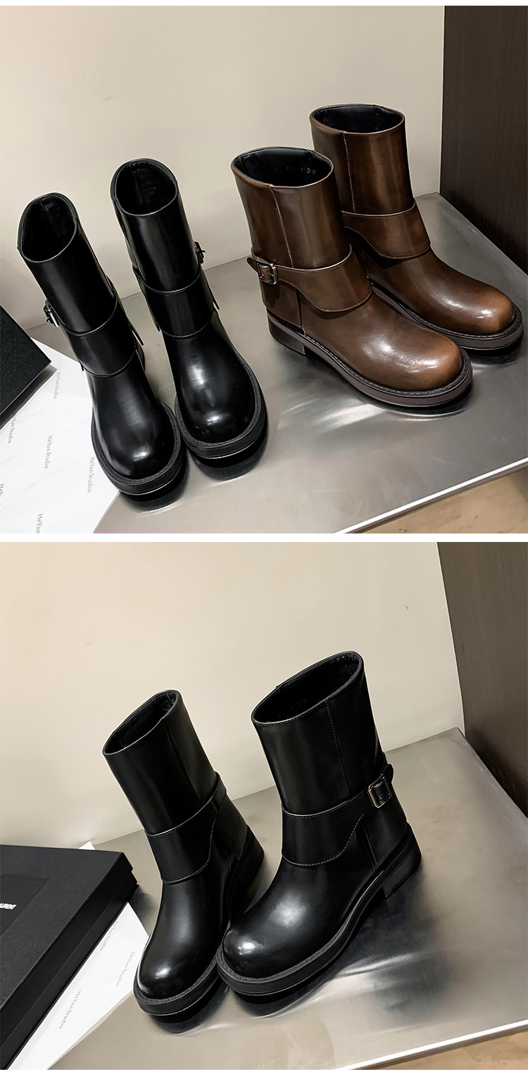 가죽 블랙 벨트 버클 스트레이트 부츠 작은 두꺼운 영국 스타일 마틴 부츠 웨스턴 부츠 짧은 부츠 여성 기사 부츠