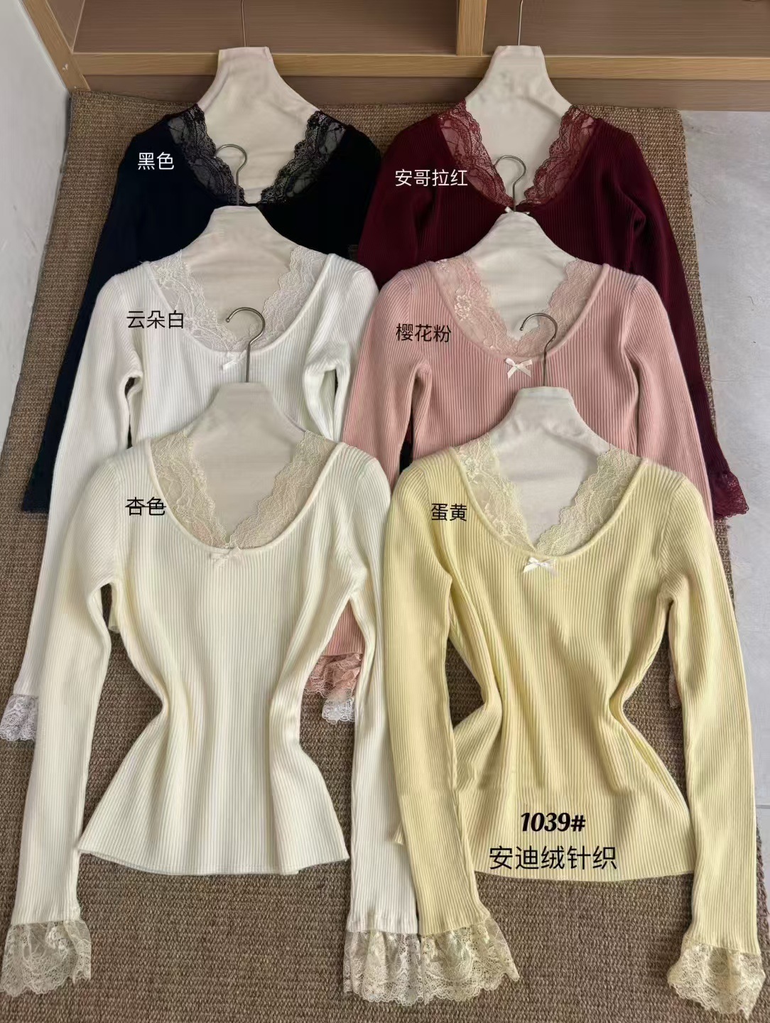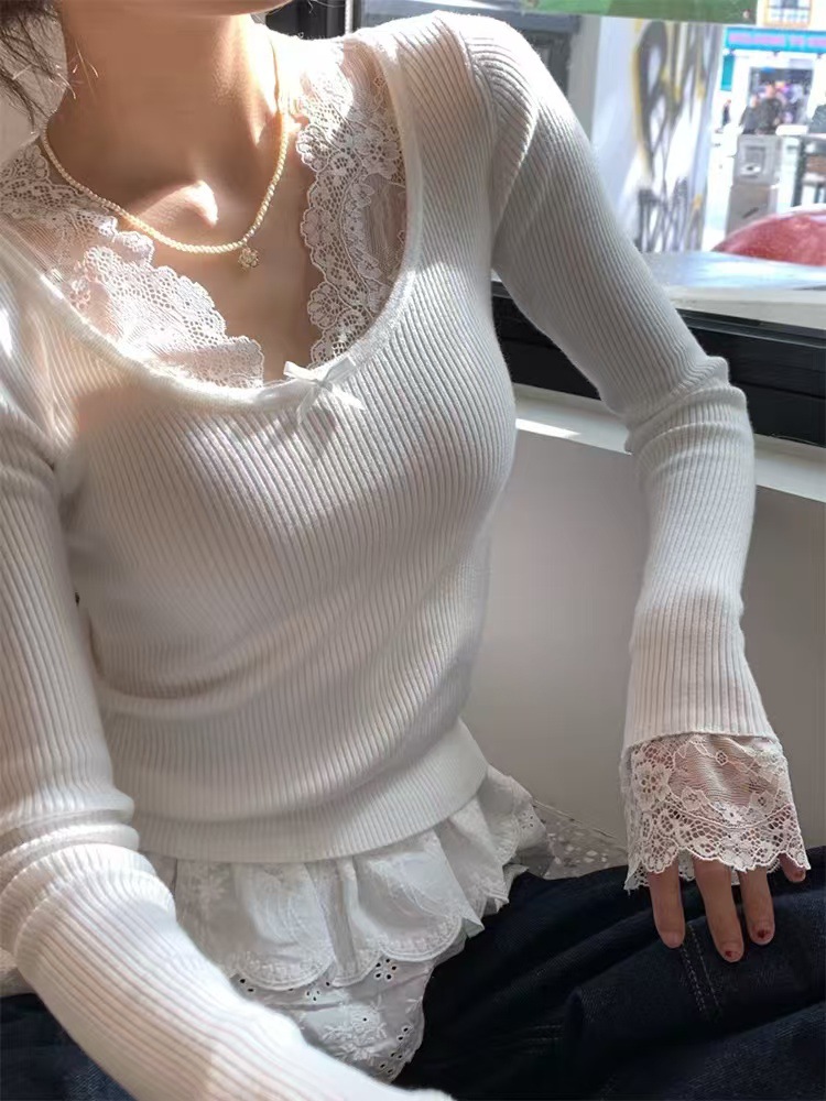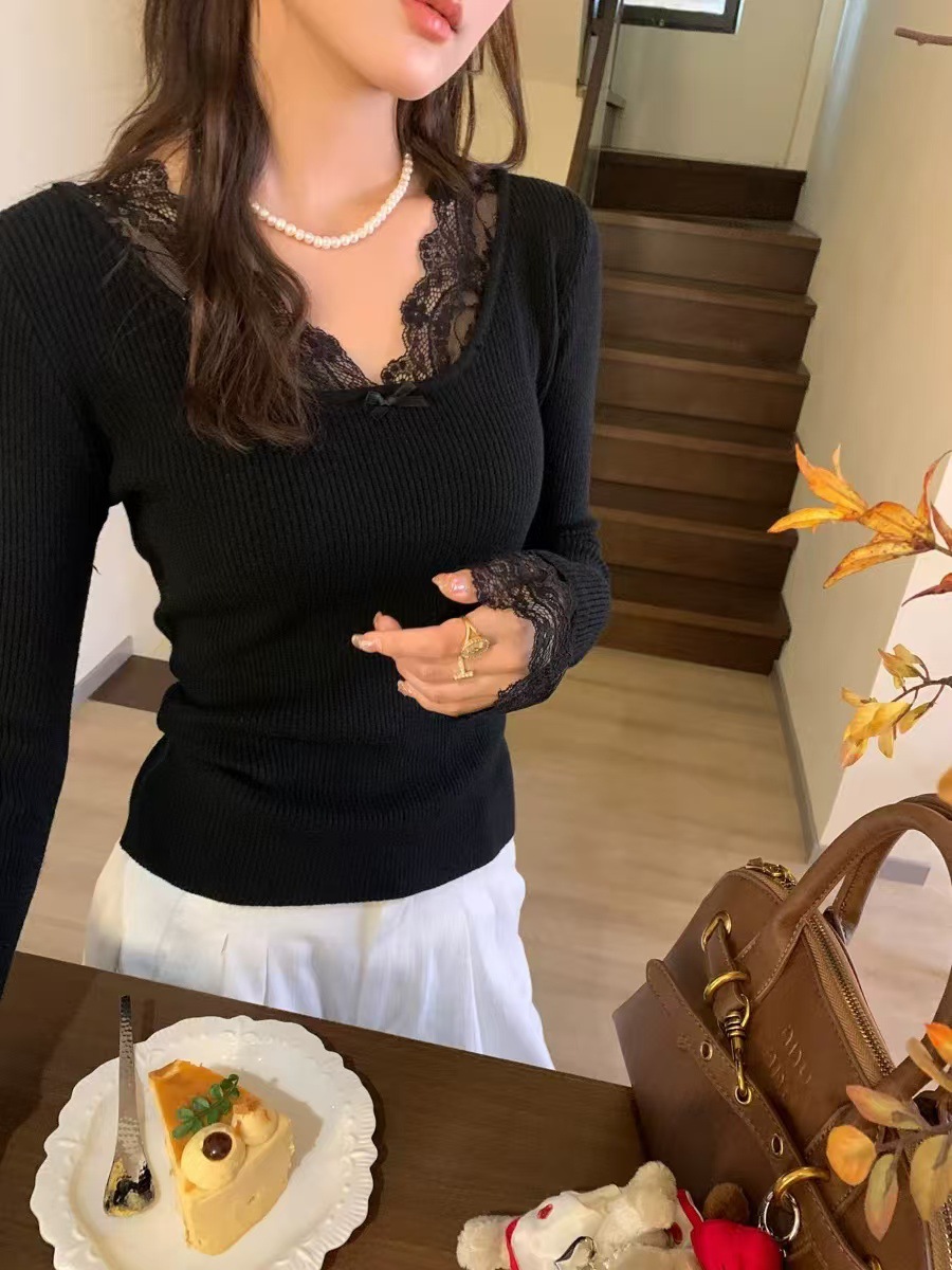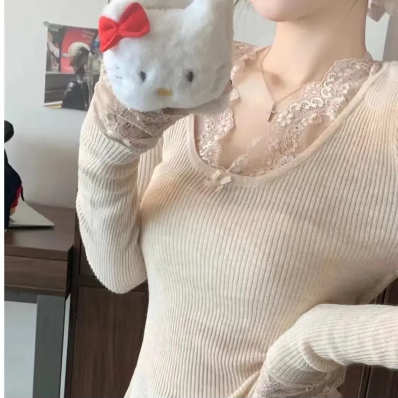 Kayi Daichun은 V-Neck Bow Lace Girl 의 긴소매 베이스 셔츠 소녀의 편안한 올 매치 니트베이스 셔츠를 원합니다.