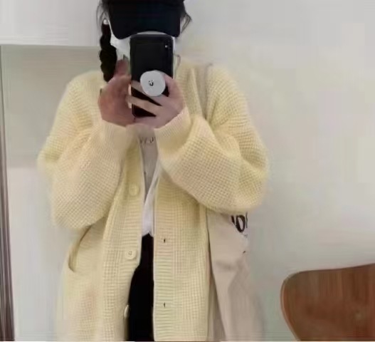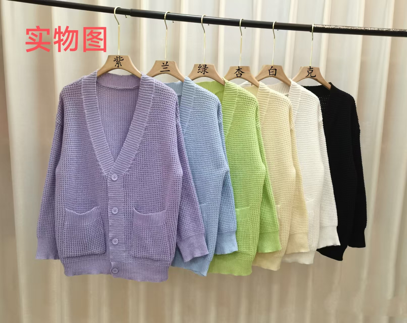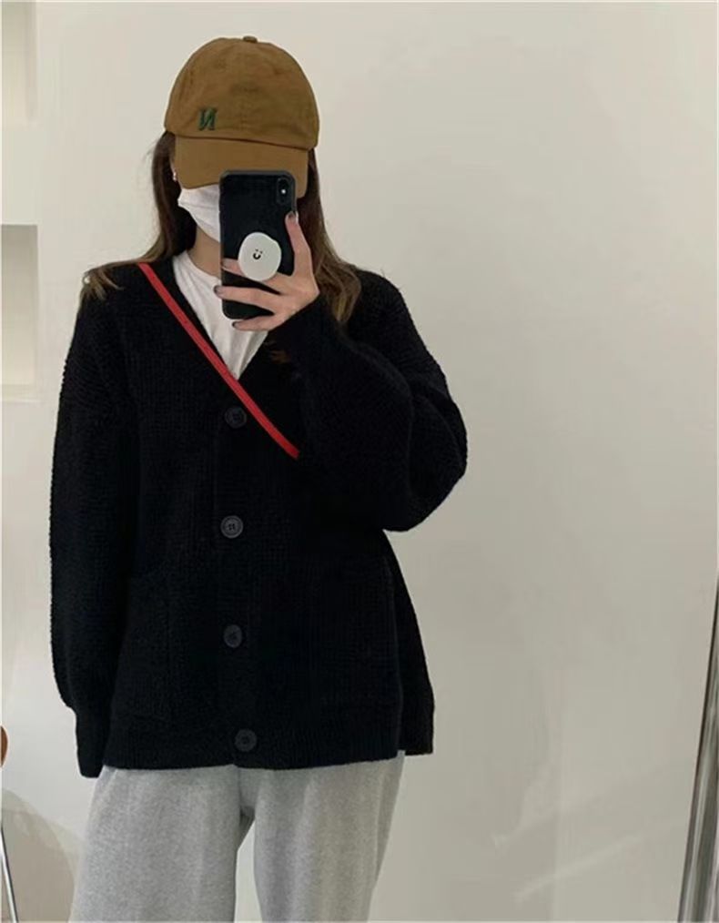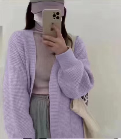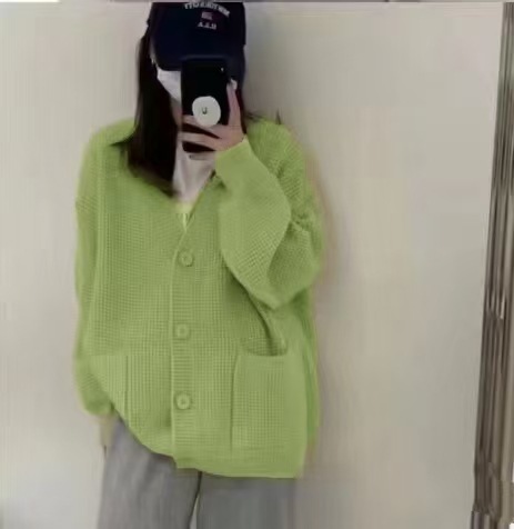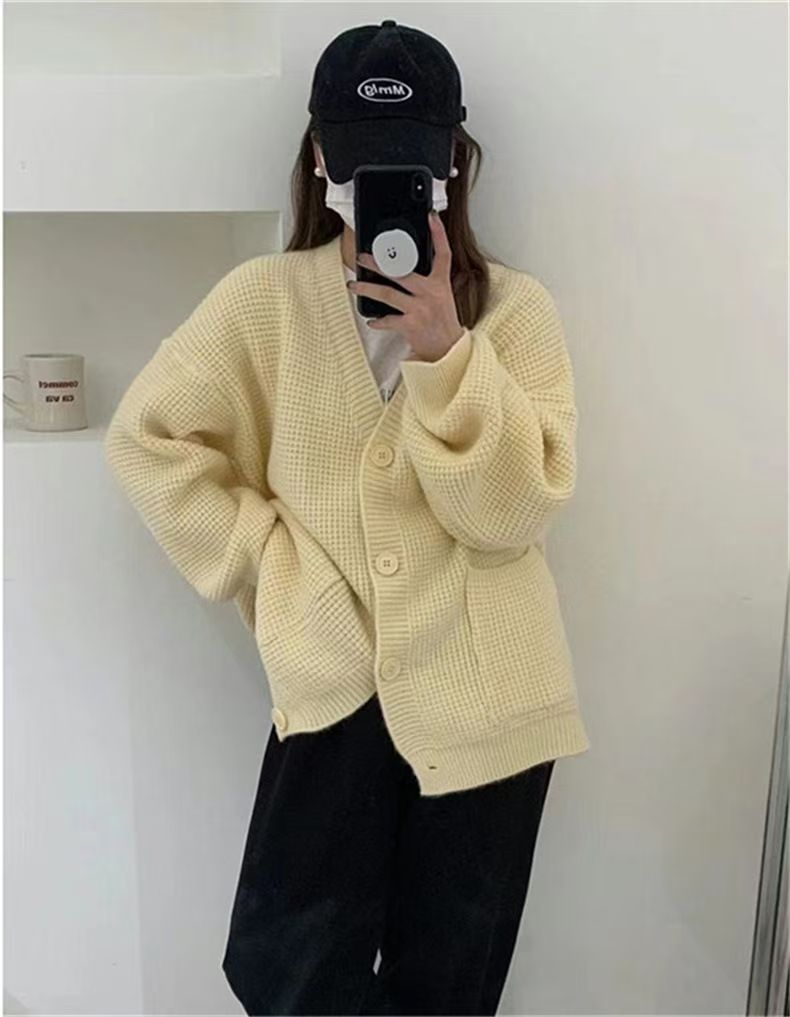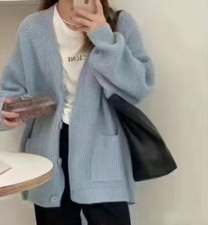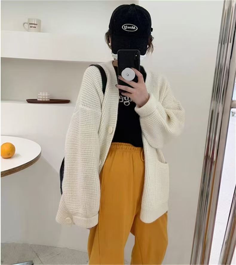 가을과 겨울 새로운 한국 스타일 느슨한 게으른 스타일 단색 V-목 와플 스웨터 코트 여성용 대형 포켓 니트 카디건