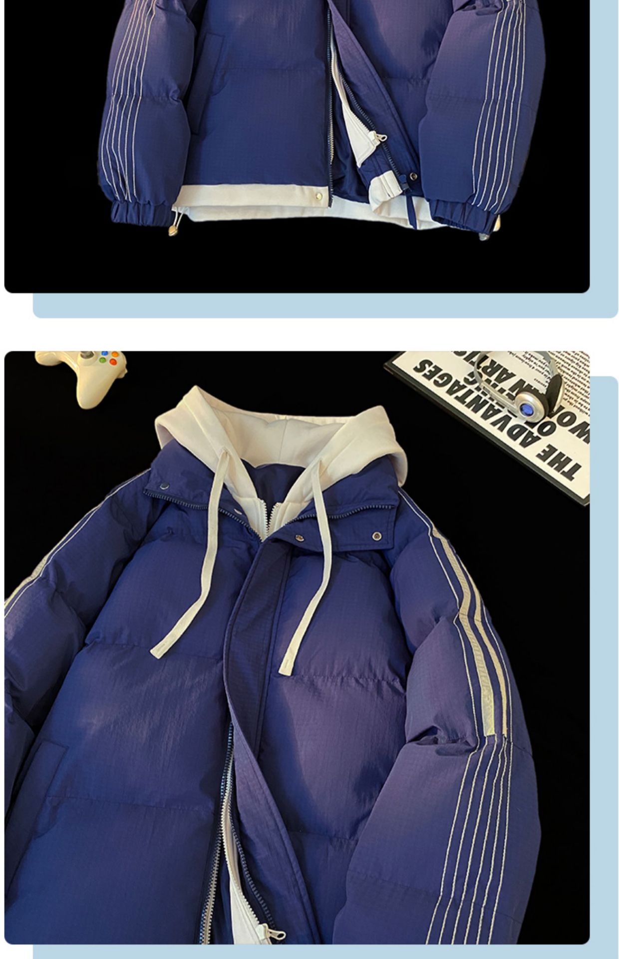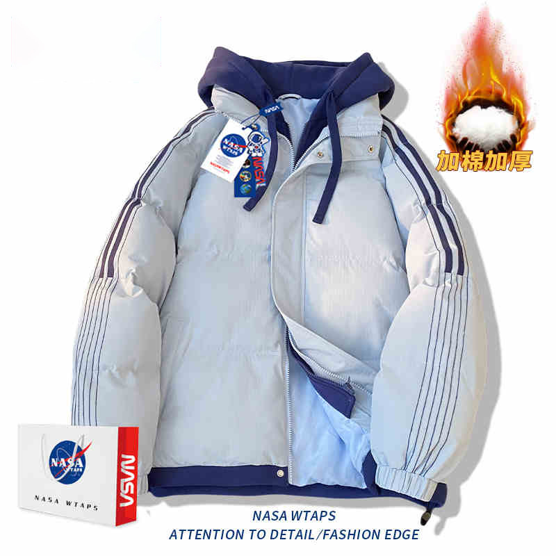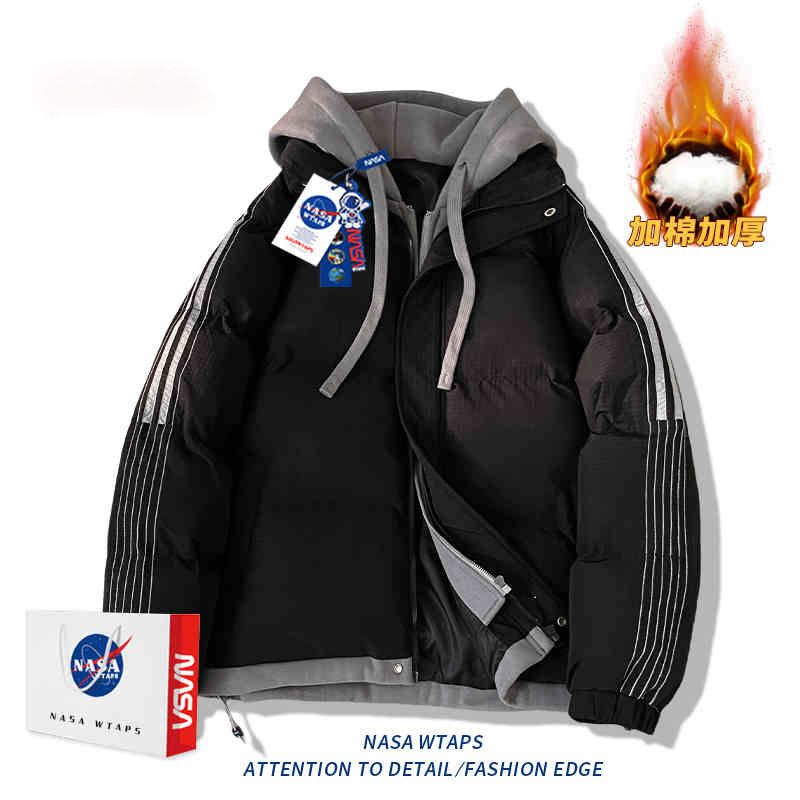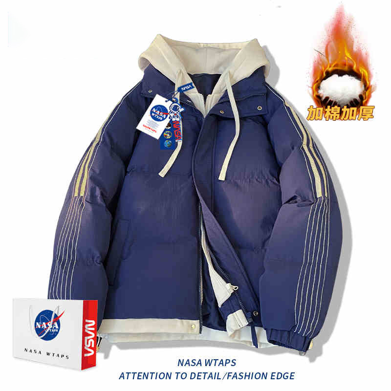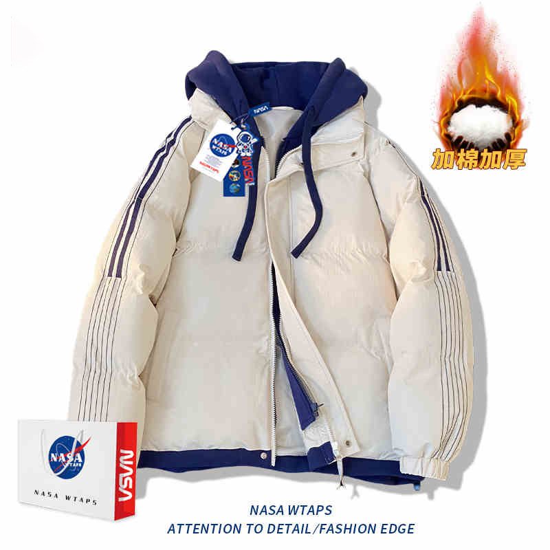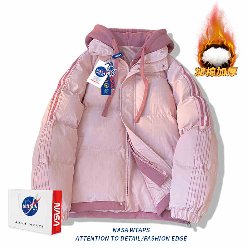 NASA 가짜 2 피스 스트라이프 코튼 패딩 재킷 남자 겨울 2024 유행 브랜드 두꺼운 코튼 패딩 재킷 커플 따뜻한 후드 코튼 패딩 재킷스토어 가기