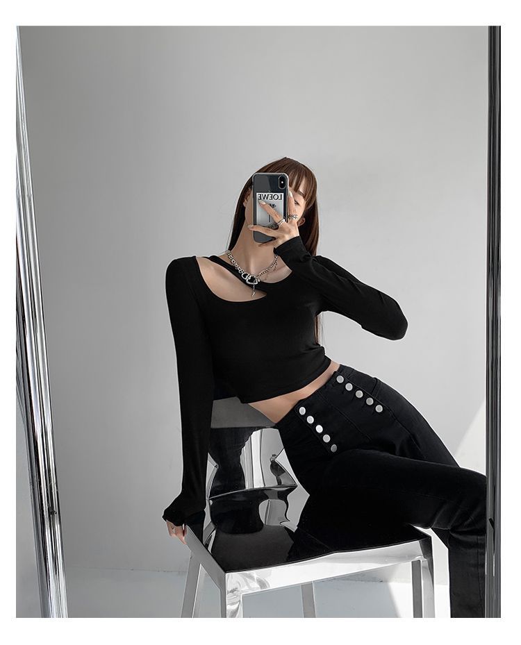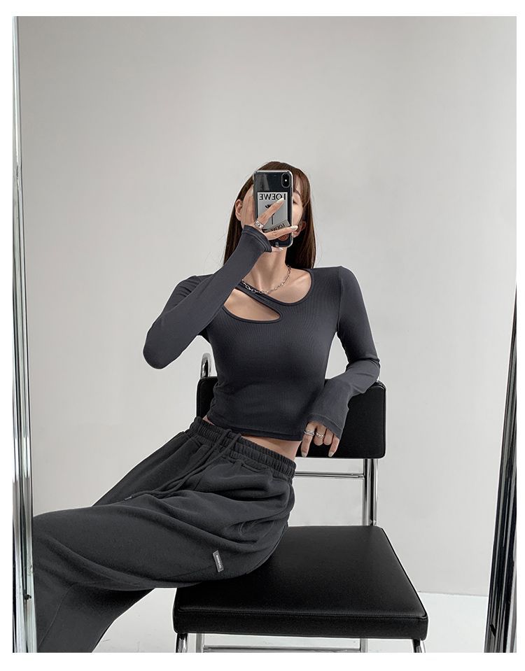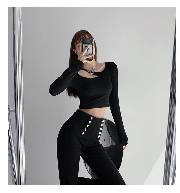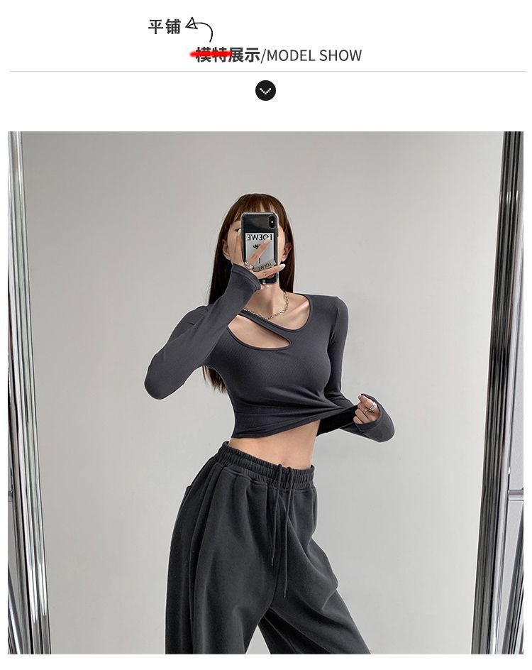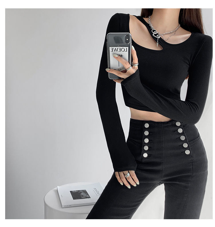 뜨거운 소녀 디자인 센스 빈 아웃 디그 숄더 티셔츠 여성용 짧은 슬리밍 긴 소매 라운드 넥베이스 셔츠 재즈 댄스 의류 탑스토어 가기