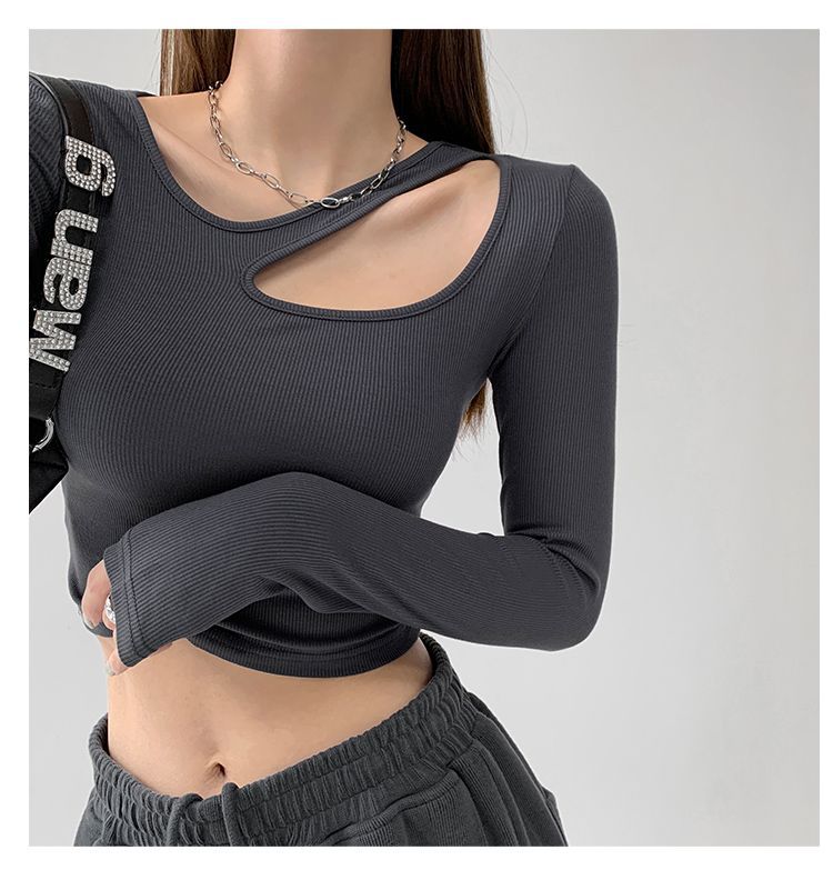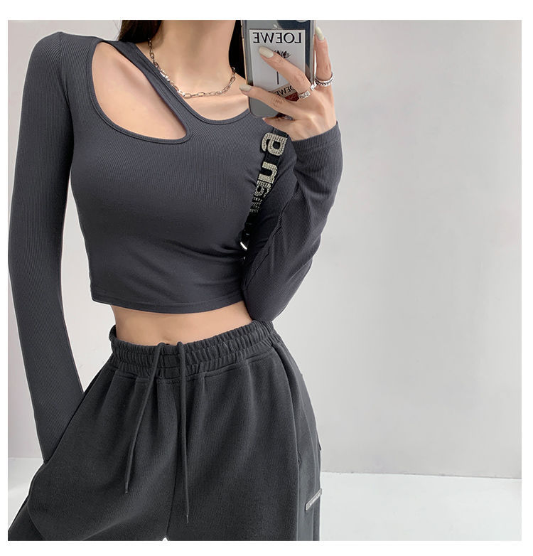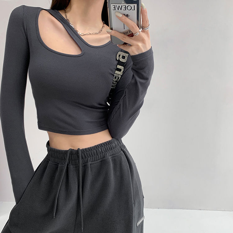 뜨거운 소녀 디자인 센스 빈 아웃 디그 숄더 티셔츠 여성용 짧은 슬리밍 긴 소매 라운드 넥베이스 셔츠 재즈 댄스 의류 탑