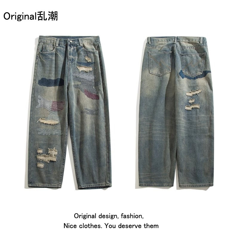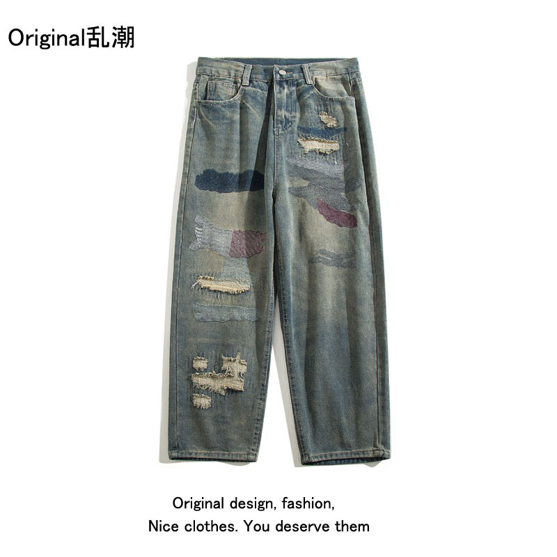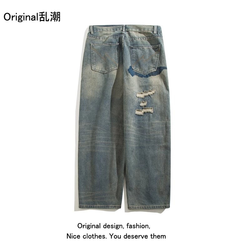 미국 거리 씻은 오래된 찢어진 청바지 남자의 봄과 가을 똑바로 느슨한 유럽과 미국의 하이 스트리트 바이브 스타일 긴 바지스토어 가기