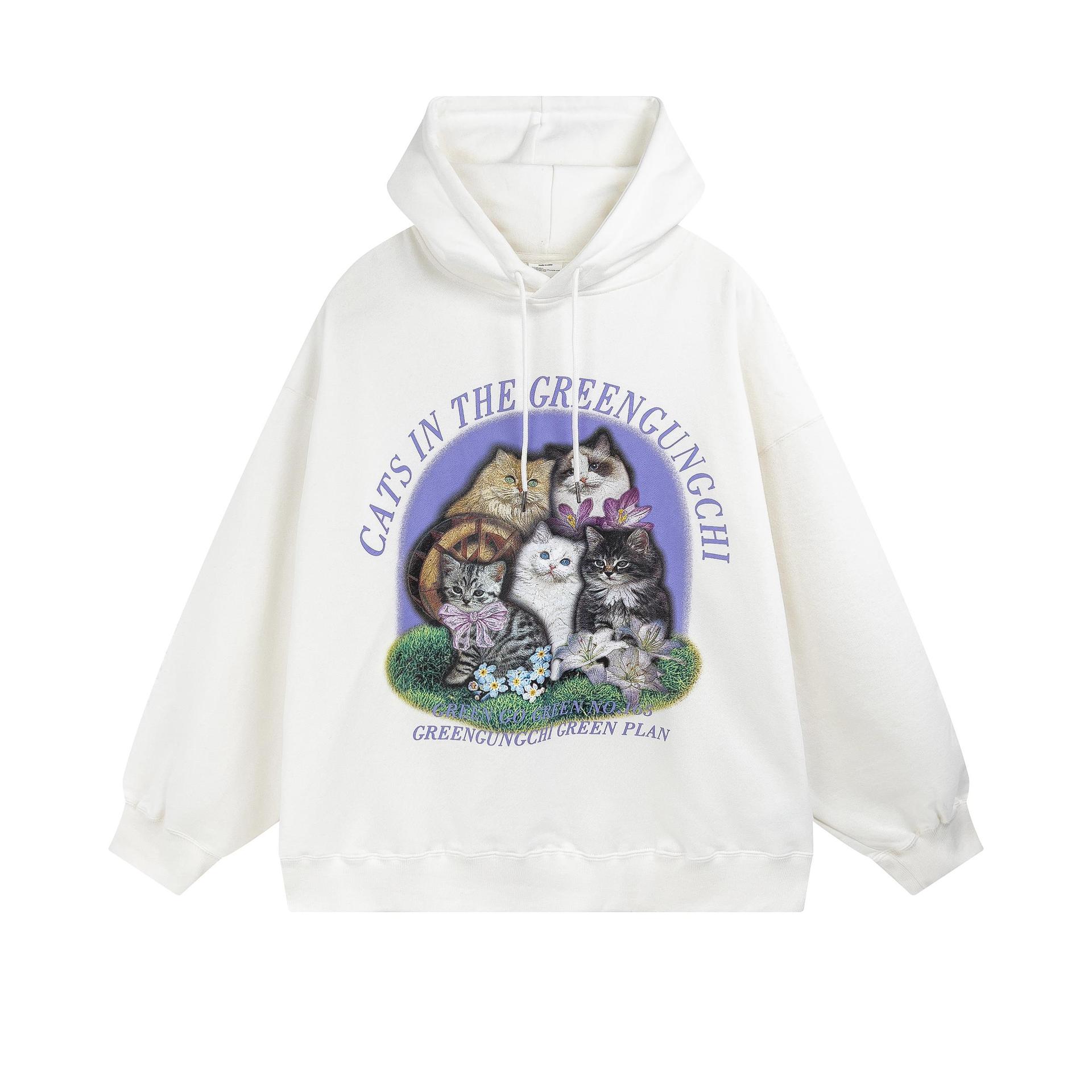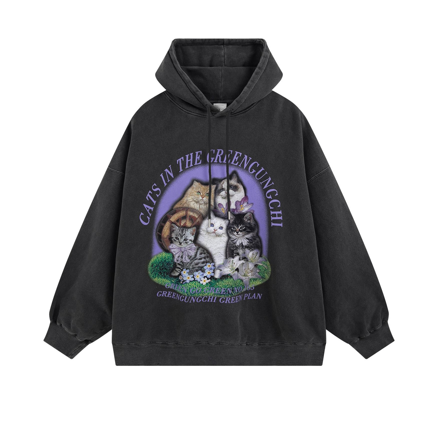 미국 스타일의 트렌디 브랜드 간단한 고양이 인쇄 풀오버 후드 남자 복고풍 워시 워터 디자인 올 매치 후드 재킷스토어 가기