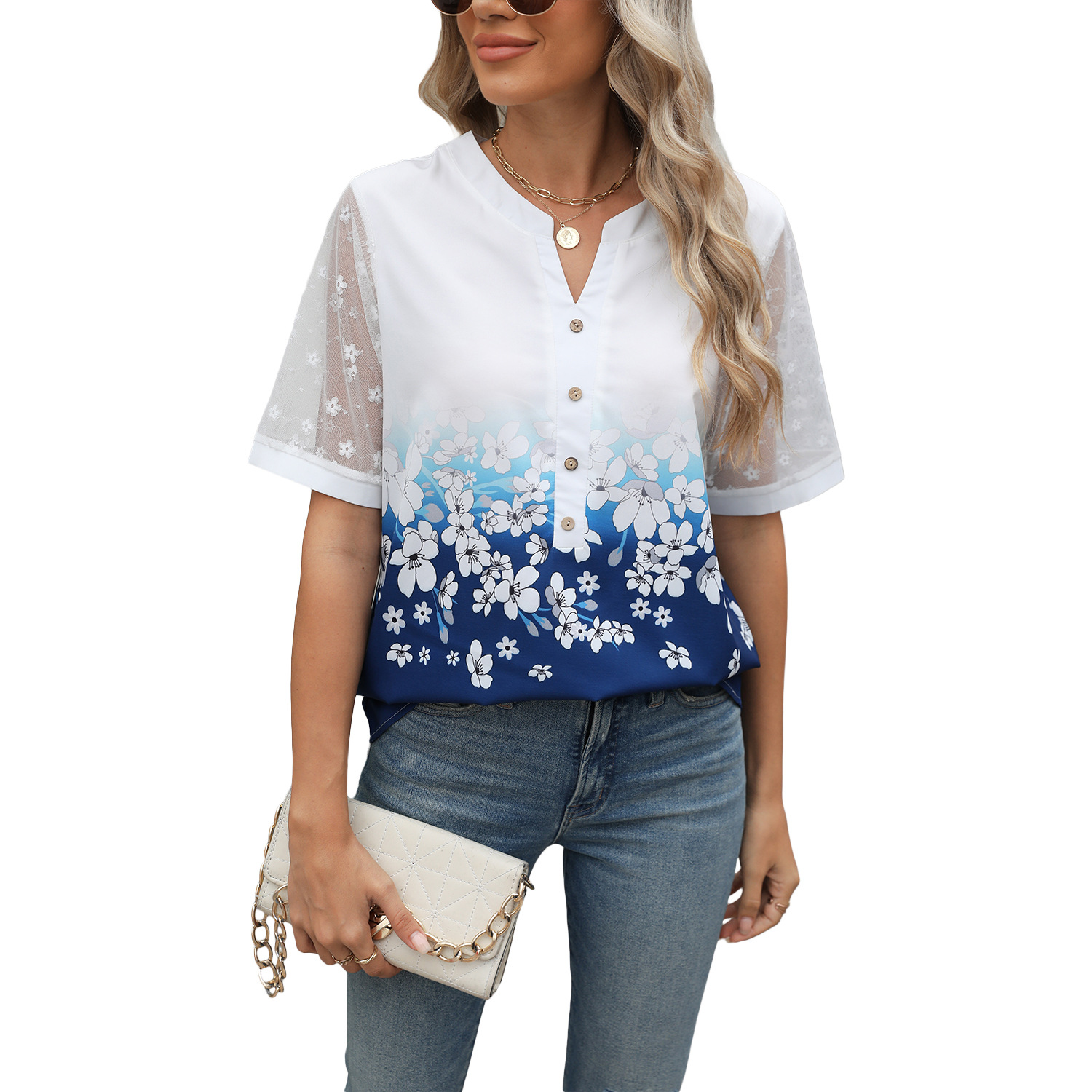 국경 간 여성 의류 2025 아마존 봄과 여름 유럽과 미국의 새로운 v-neck 프린트 쉬폰 셔츠 스티칭 레이스 슬리브 탑 여성스토어 가기