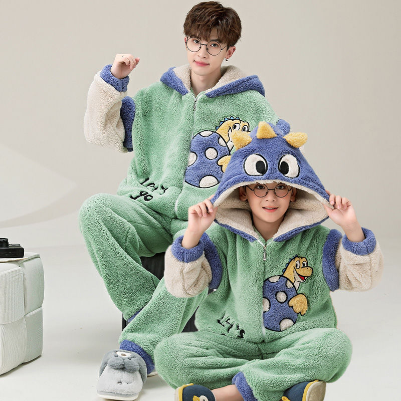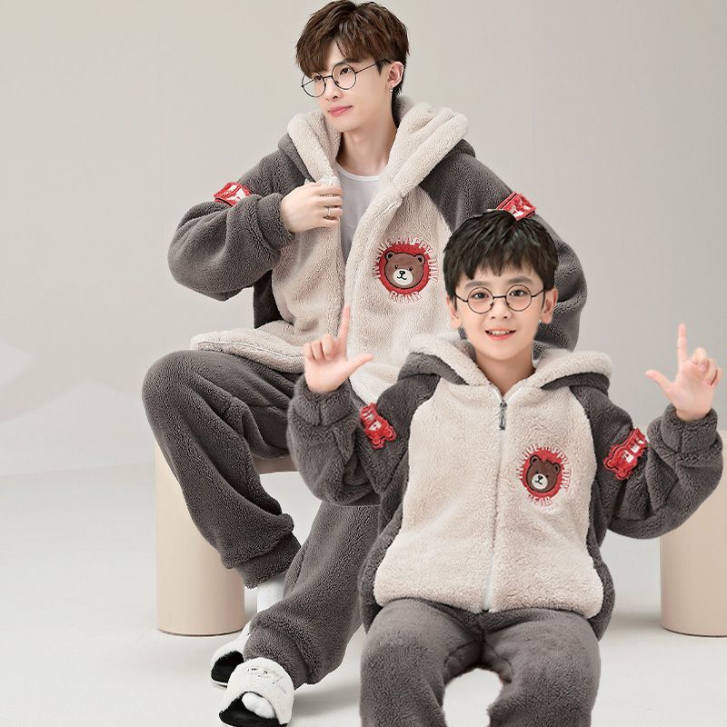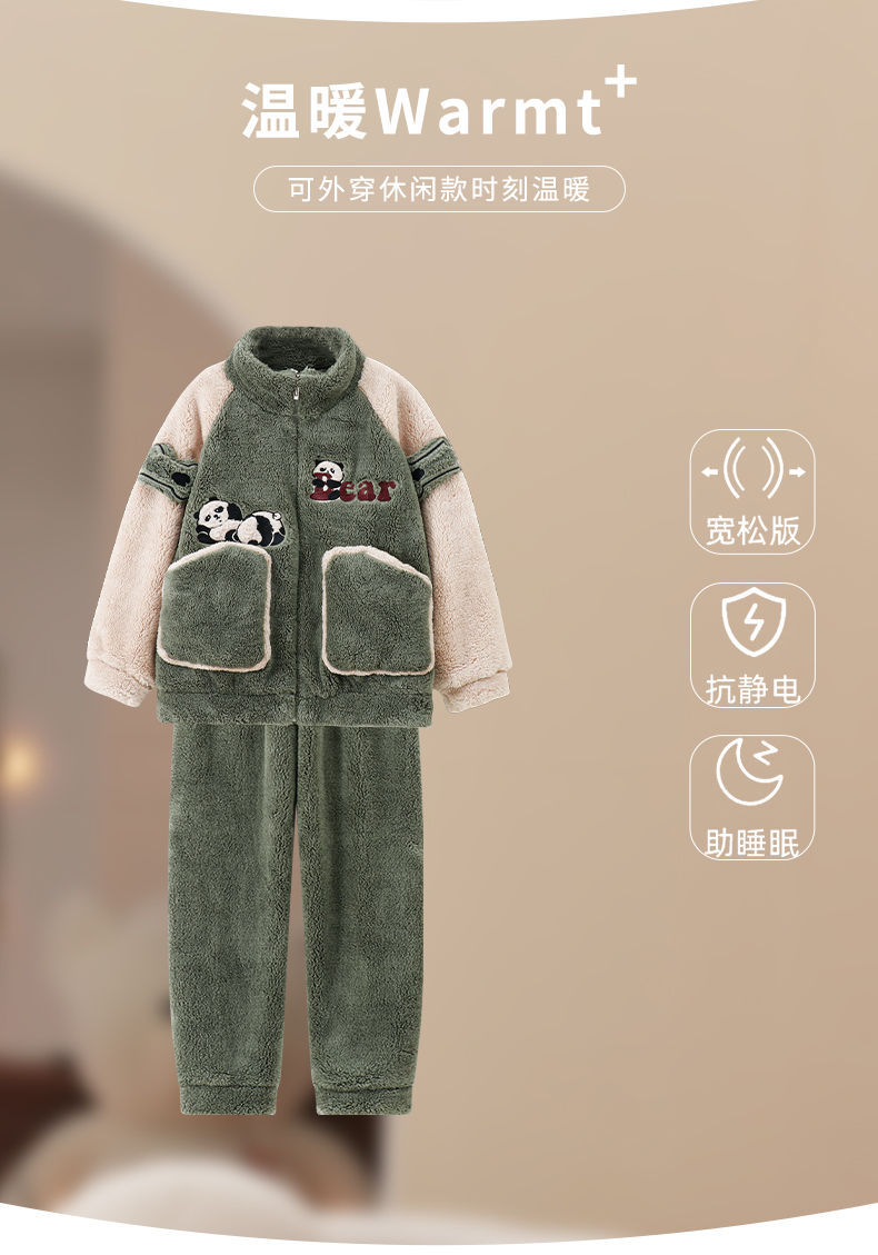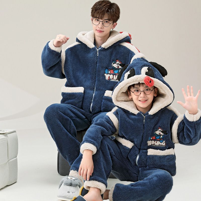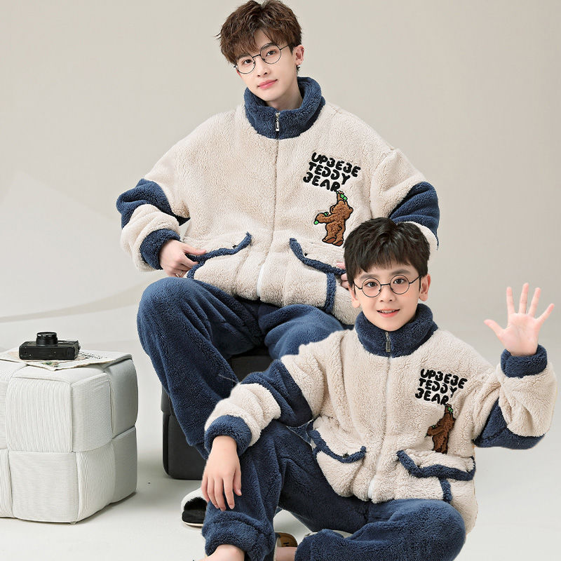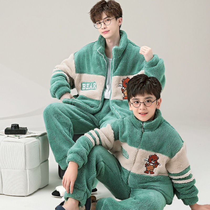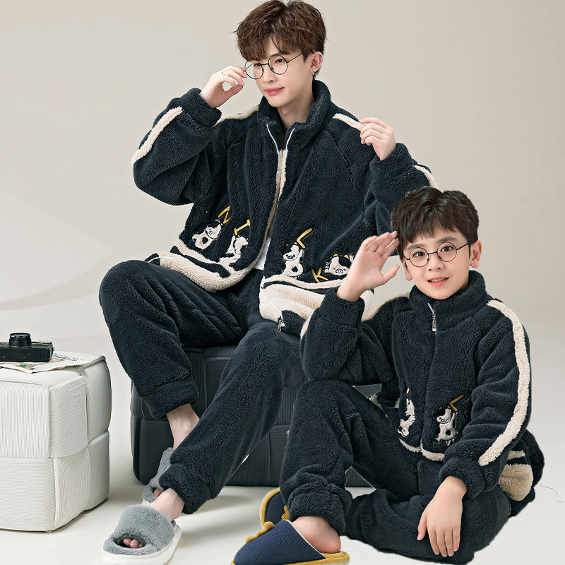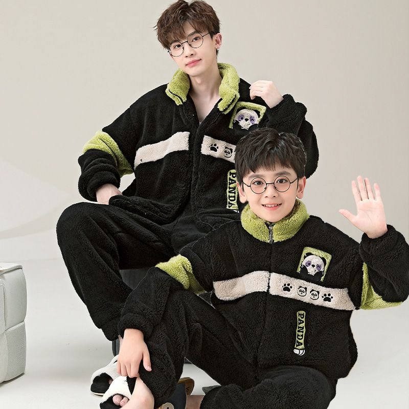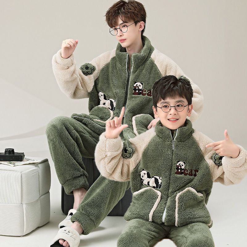 겨울 소년 잠옷 산호 양털 만화 팬더 플러스 사이즈 200kg 두께의 청소년 부모-자식 가정 의류 아버지-아들스토어 가기