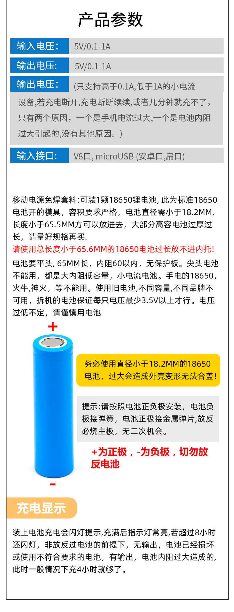 只能适配标准尺寸的18650平头电池,尖头的尺寸对不上,不可以使用!!!