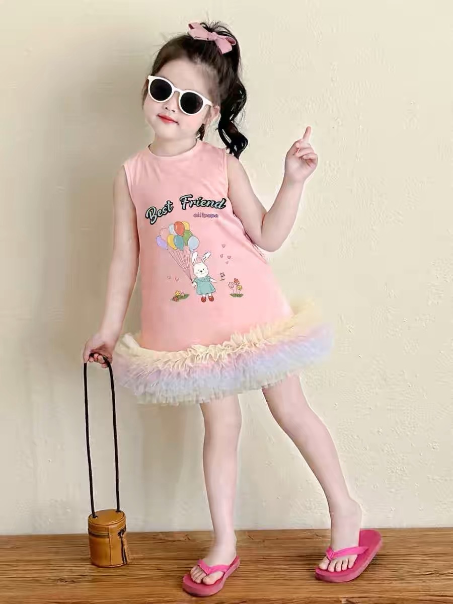 소녀 회전 원사 원피스 2024 여름 새로운 어린이 원피스 귀여운 달콤한 공주 원피스 아기의 휴일 티셔츠 원피스스토어 가기