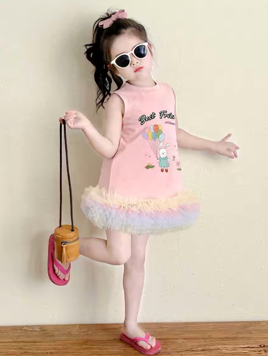 소녀 회전 원사 원피스 2024 여름 새로운 어린이 원피스 귀여운 달콤한 공주 원피스 아기의 휴일 티셔츠 원피스