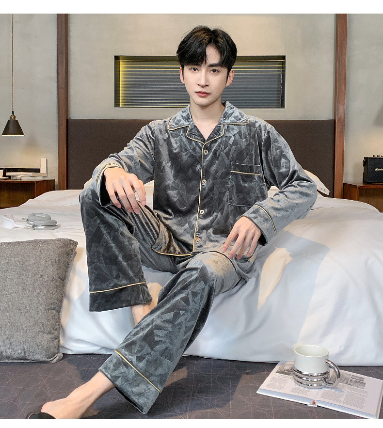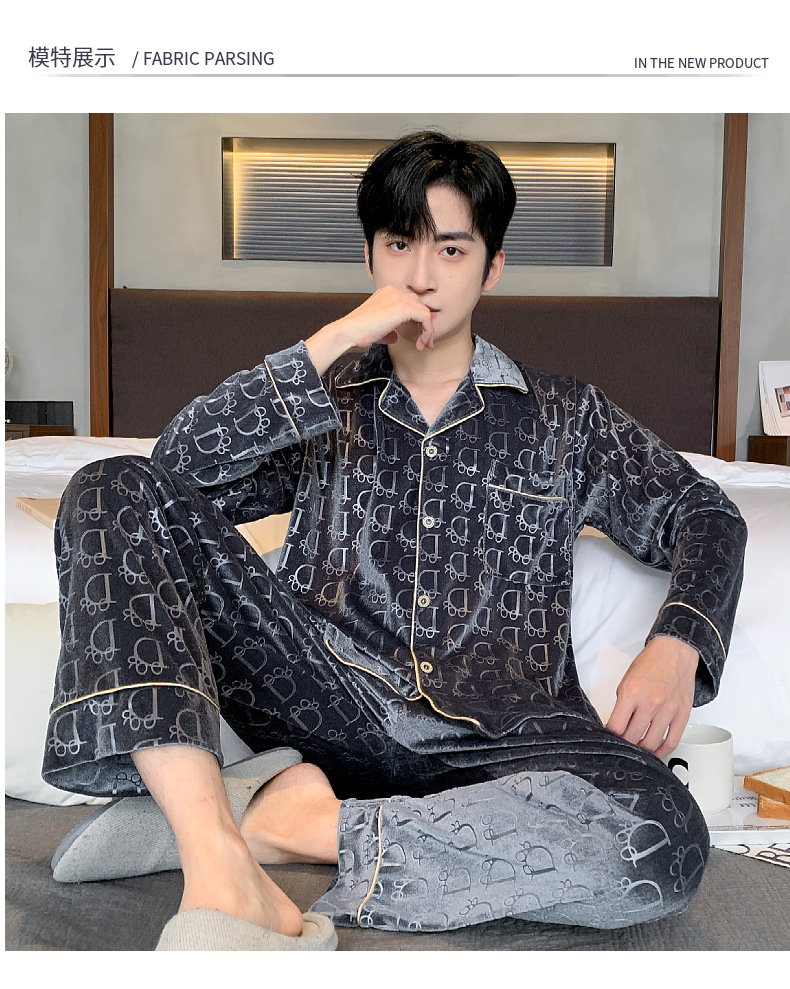 잠옷 남자 봄과 가을 골드 벨벳 얇은 긴 소매 플러스 사이즈 캐주얼 편안한 카디건 겉옷 홈 세트
