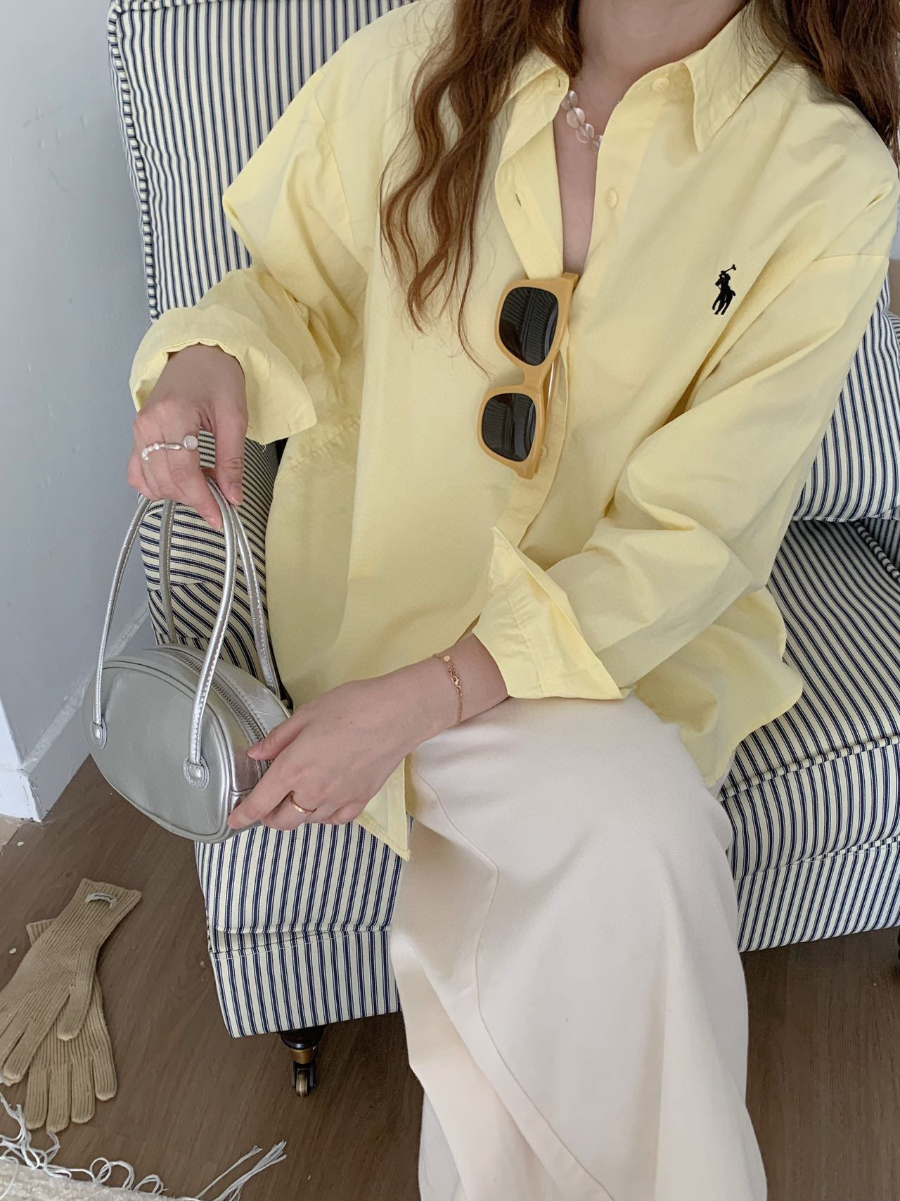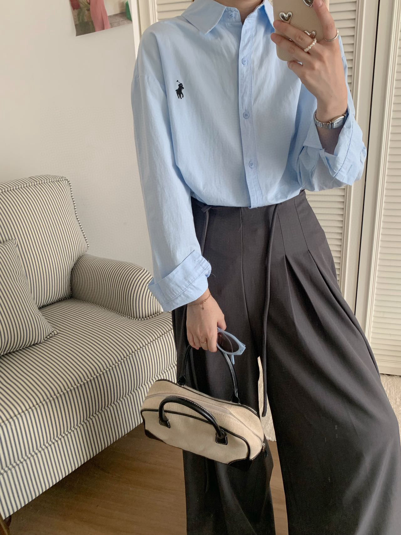 프랑스 스타일 포니 자수 블루 셔츠 여성용 긴 소매 한국 스타일 느슨한 틈새 디자인 셔츠스토어 가기