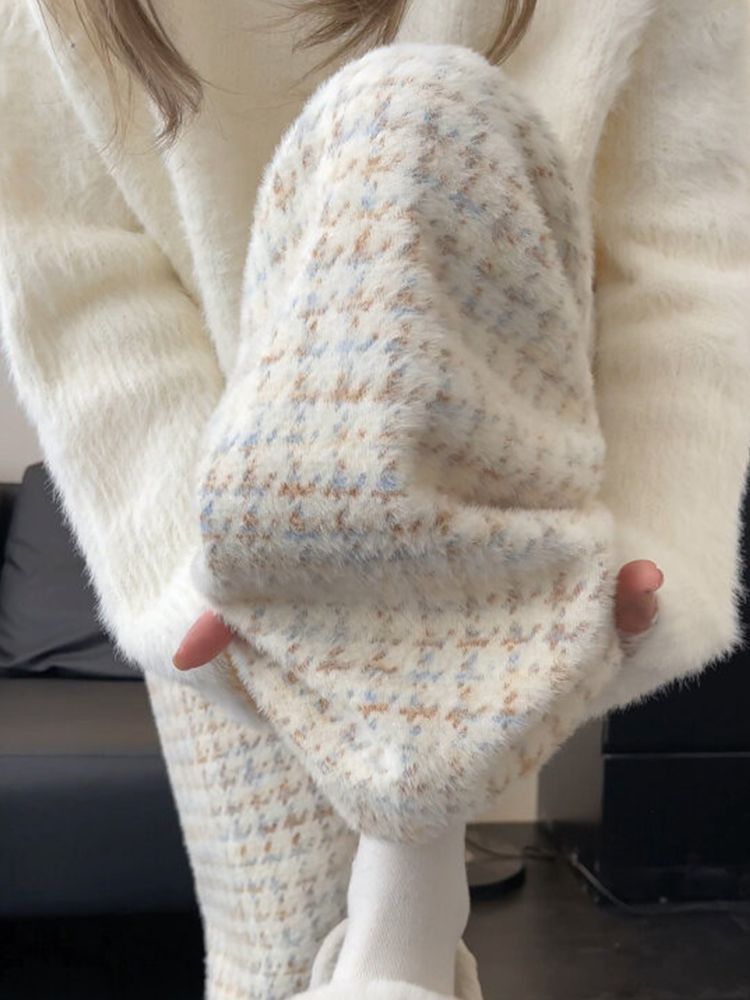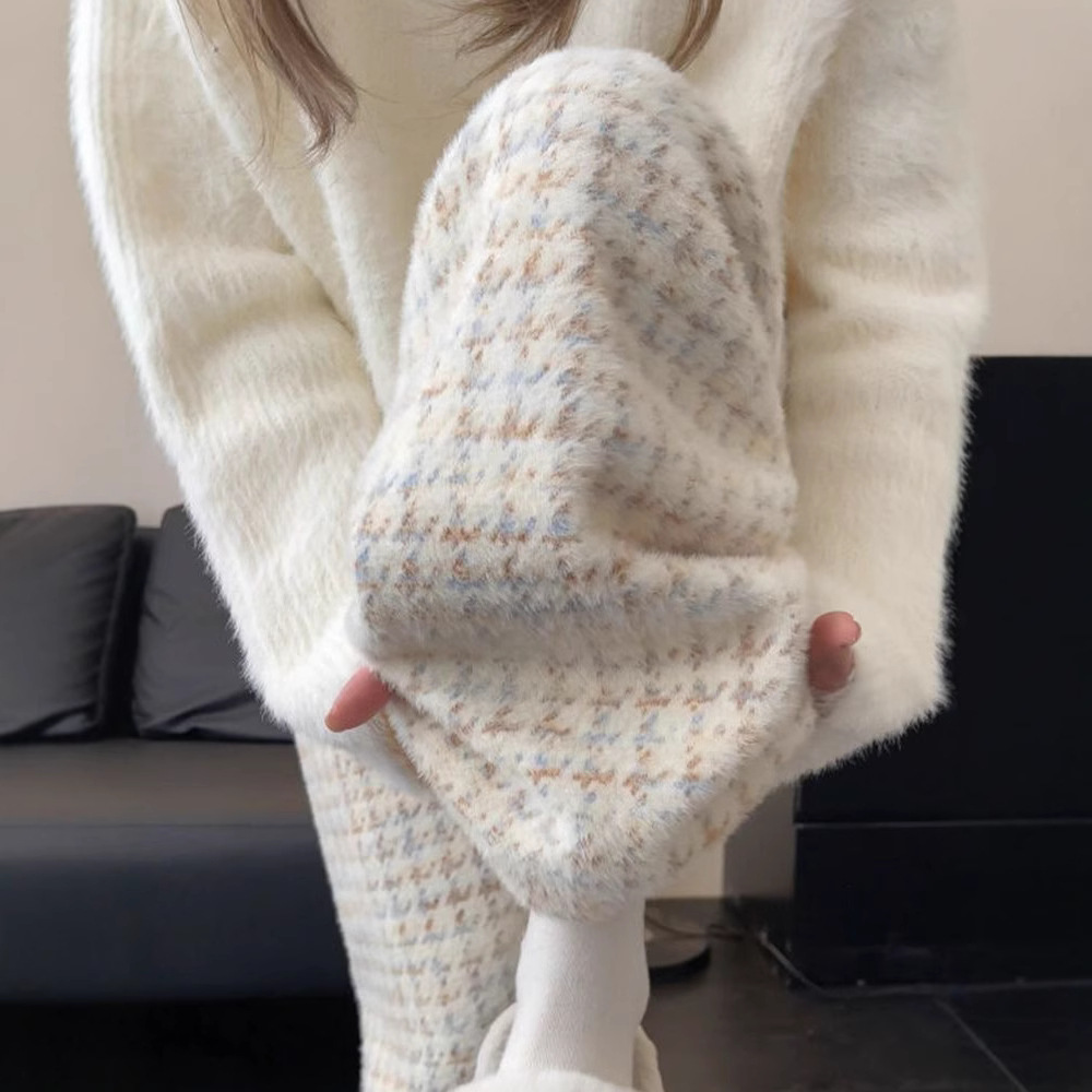 Houndstooth 와이드 레그 팬츠 여성의 가을과 겨울 2024 새로운 높은 허리 게으른 캐주얼 기모 울 봉제 화이트 격자 무늬 바지